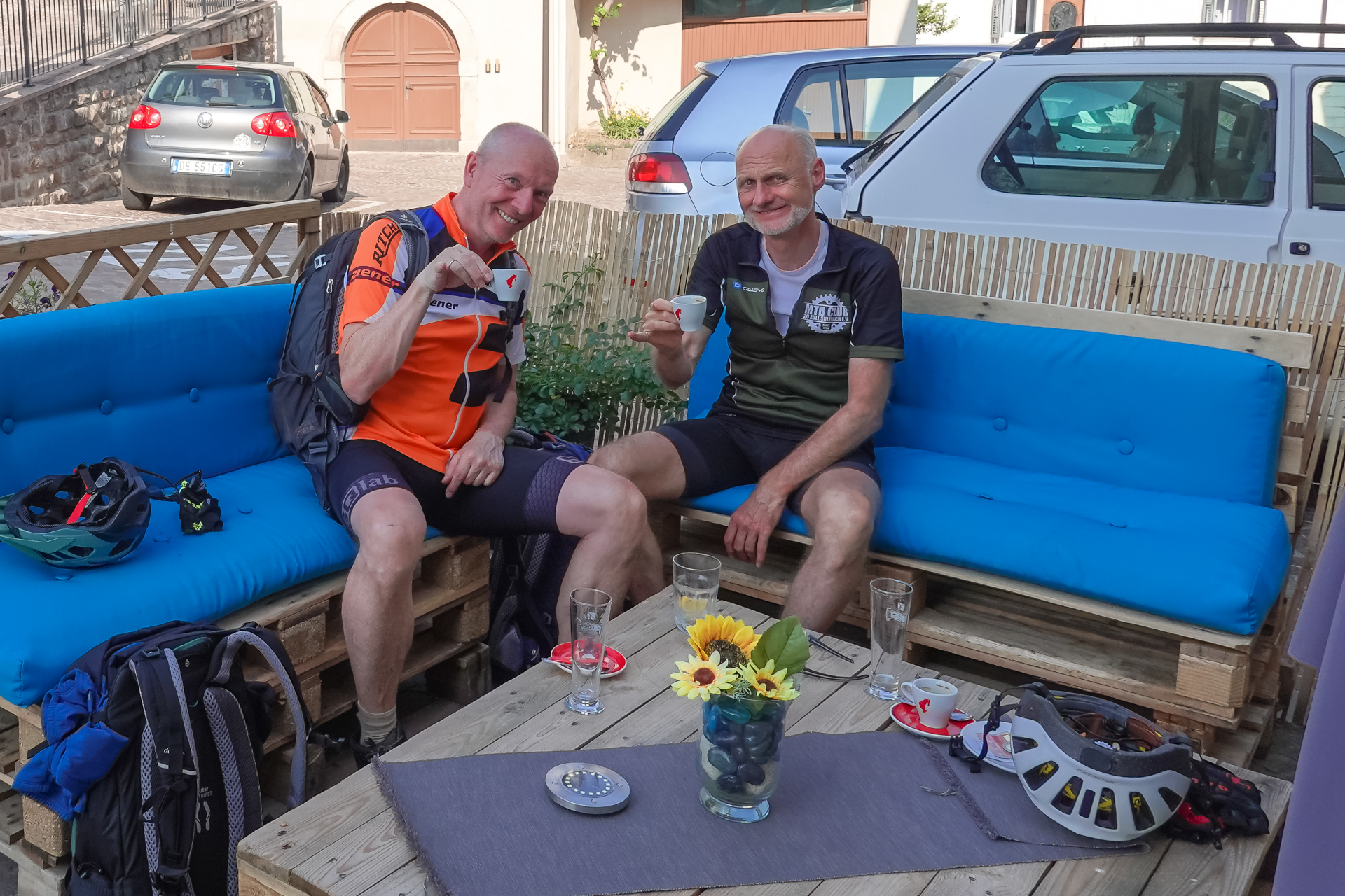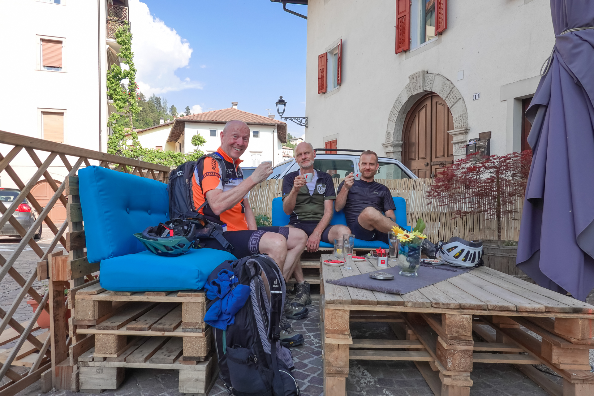 Oberhalb des Lago di Santa Giustina machen wir eine kurz Pause, gönnen uns einen leckeren Espresso bis wir die Schlussetappe nach Tuenno starten. Auf Radwegen & Straße sind das nochmals 8 km und 130 Höhenmeter. Im Albergo Tuenno angekommen bekommen wir von unserem Gastwirt erst mal ein hausgemachtes leckeres Eis aus der eigenen Eisdiele geschenkt – toller Empfang.
