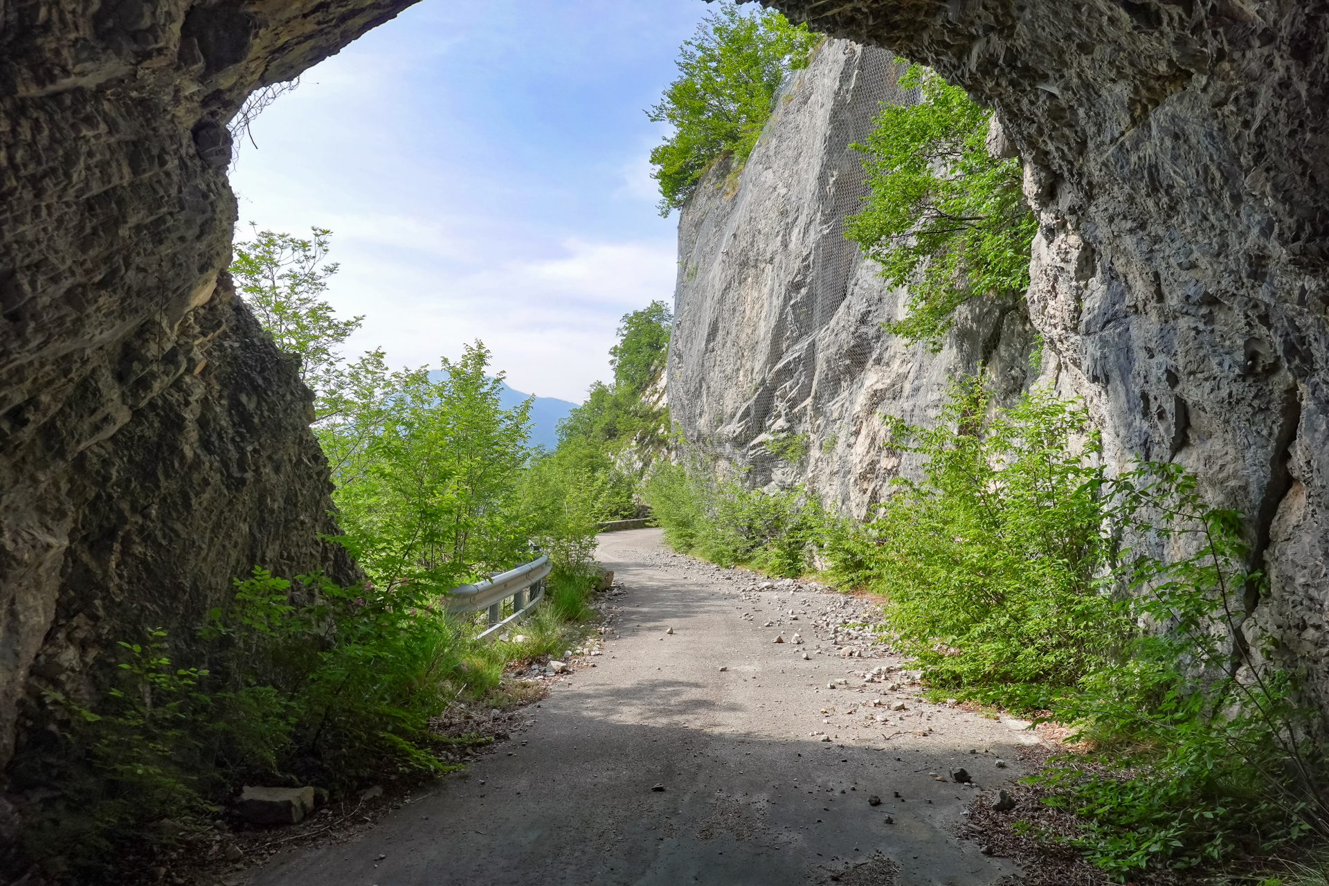 Der weitere Weg führt uns erst kurz hinauf, dann aber immer schön bergab zum Lago de Tenno. Von hier aus kann man den Gardasee förmlich riechen, aber ich habe mir erlaubt, einen Abstecher einzubauen. Ich will nicht direkt in Riva landen, sondern vorher oberhalb an der alten Burgruine „Bastione“ einen Stopp einlegen. Dazu müssen wir einen kleinen Straßenpass hinauf nach Campi. Das sind nur 2 km und 100 hm, aber ich fühle mich bei der Hitze sehr geschwächt ohne richtige Nahrung im Magen. Der nun folgende Weg entschädigt aber die Auffahrt, denn es geht auf 5 km Trail & typischer Gardasee Schotter 450 Höhnmeter hinunter zur Bastion. Was ein toller Abschluss. Ich bin öfter schon von Arche nach Arco zum Gardasee gekommen, aber diese Variante toppt alles.