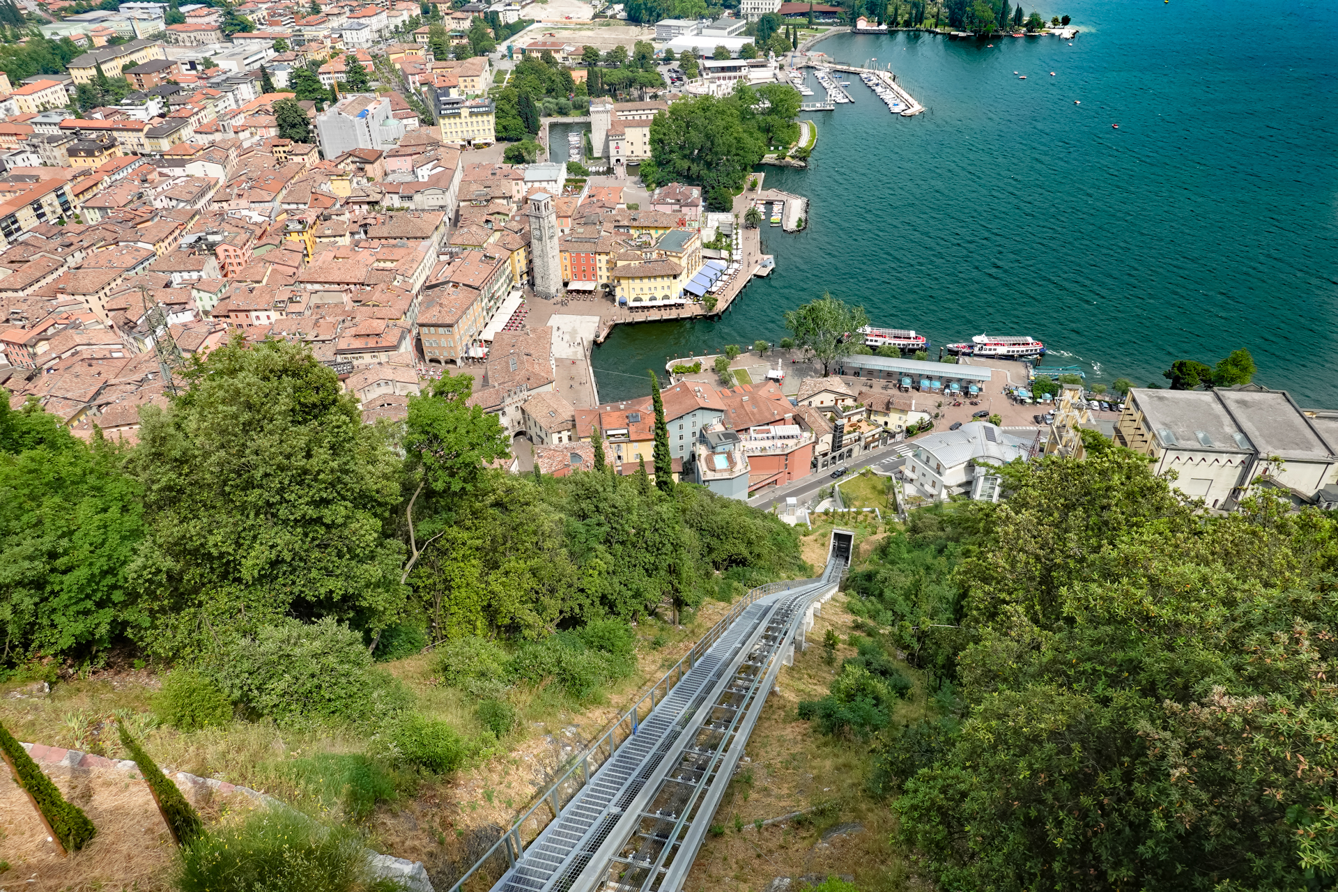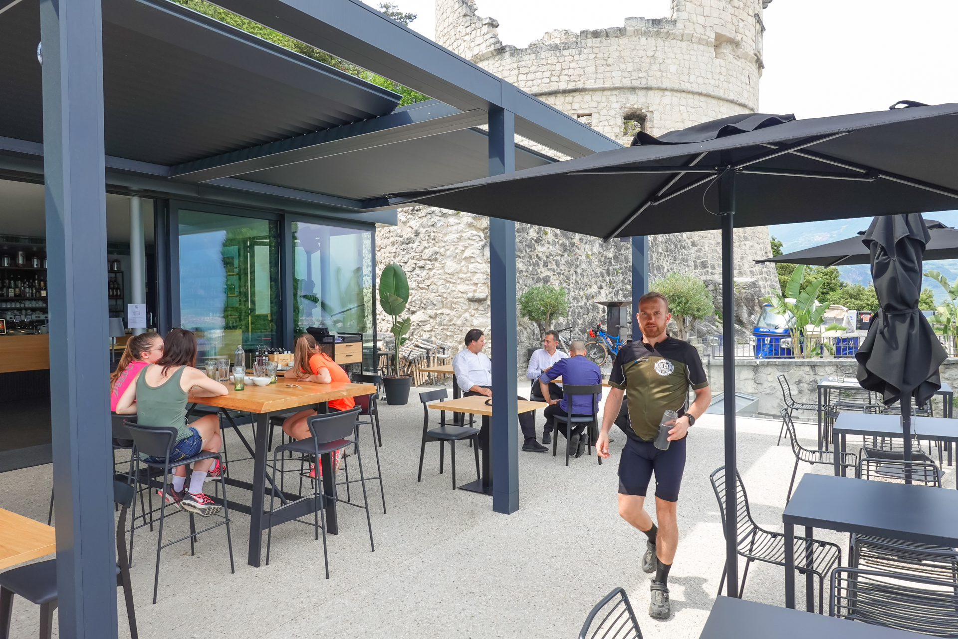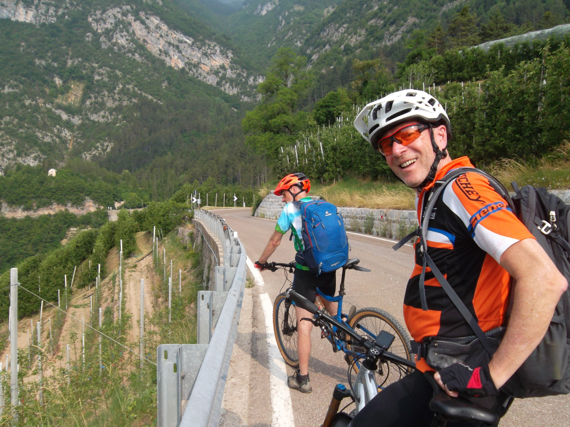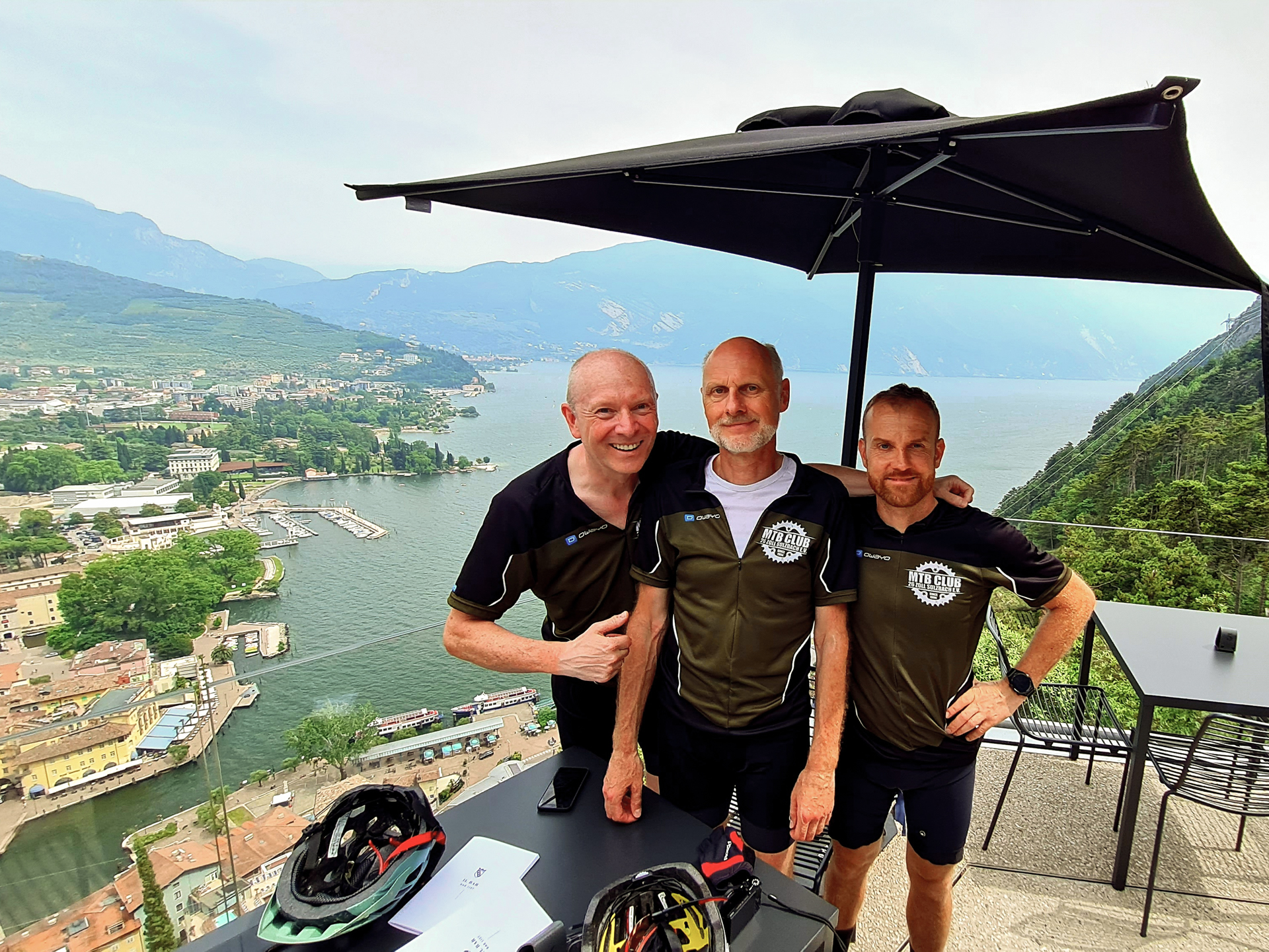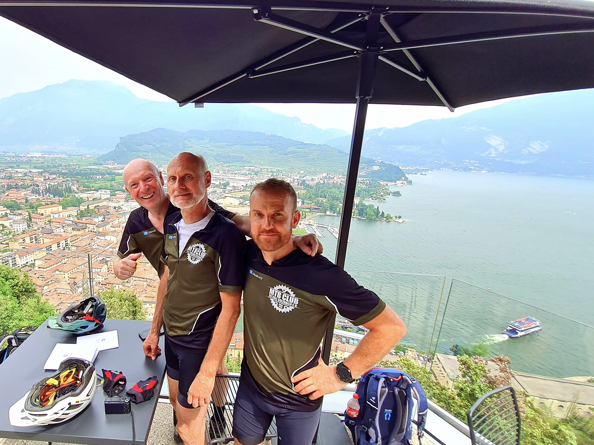 Der Blick hinunter nach Riva ist schon Atemberaubend, auch das Wetter trägt zu einem glücklichen Ende bei. Ein Gruppenbild, ein Aperol und wir beglückwünschen uns gegenseitig zum gelungenen Alpencross 2021. Später radeln wir die Serpentinen hinunter nach Riva, machen das obligatorisches Finisher-Foto am Marktplatz und lassen uns noch ein paar Aperol schmecken.