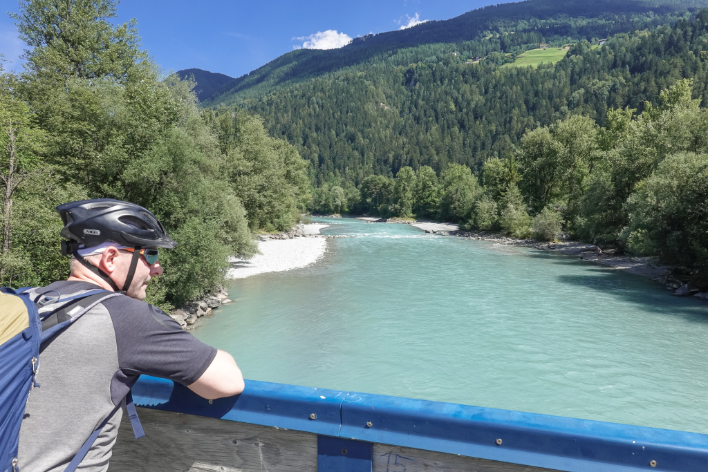 In Nassereith am Nassereithersee machen wir Pause im Restaurant Seebua, ein kühles alkoholfreies Weizen stärkt uns bevor die Fahrt weiter geht. Kurz danach geht es einen schönen Wald- & Forstweg (Via Claudia), zum Teil schon etwas Traillastig weiter, bis wir zwischen Strad & Imst dem Inntal-Radweg weiter nach Landeck folgen. Im Inn kühlen wir uns ab, beobachten das Treiben einer Rafting Gruppe bevor es weiter nach Landeck geht. Zwischendurch habe ich ein 2,5 km langes Trailstück einbaut, dass direkt am Inn entlang läuft und eine schöne Alternative zum Radweg auf Asphalt darstellt.