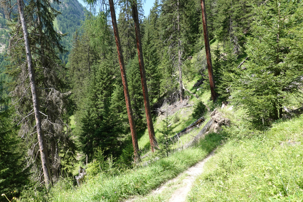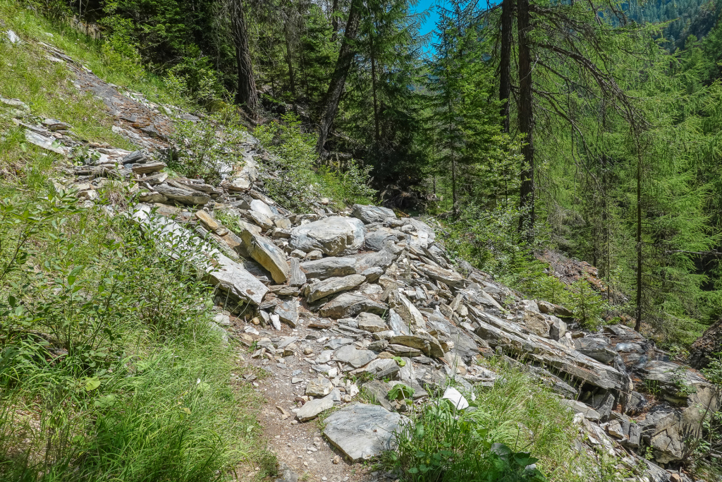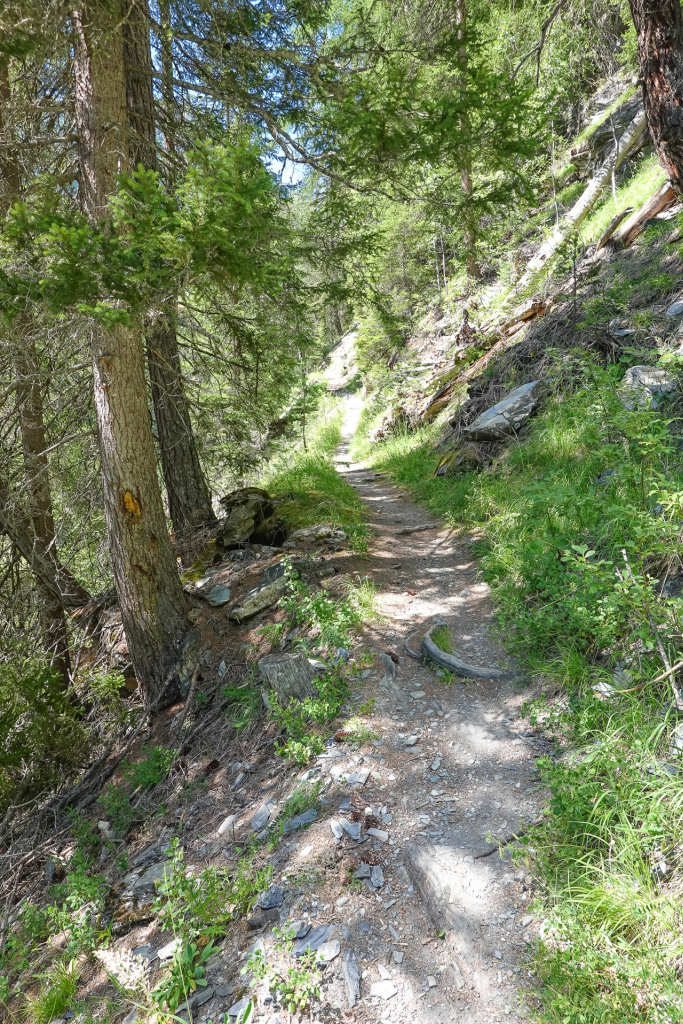 Normalerweise zweigen hier viele ab hinunter auf einen verwurzelten Singeltrail. Ich kenne den schon, habe heute vor die Variante oberhalb der Hütte bis kurz vor Vná zu fahren, dann hinunter Richtung Val Sinestra um anschließen auf einem Trail dann nach Ramosch zu gelangen.