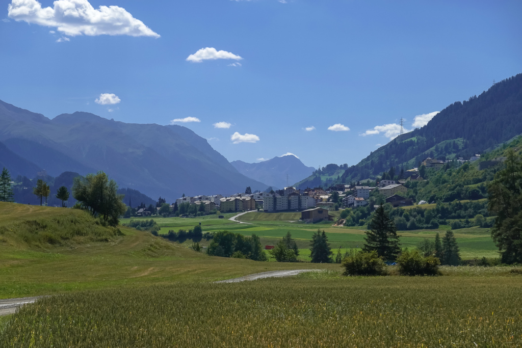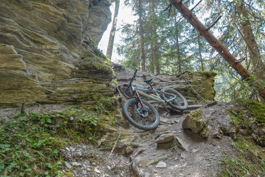 Der Weg bis nach Vná ist klasse zufahren, zuerst ein paar Meter bergauf, dann immer durch tolle Landschafen rollen lassen. Spitze. Ein paar Kilometer weiter geht Rechts ein Schotterweg weg, der nach ca. 1 km in einen Trail mündet. Anfangs sehr toll fahrbar, es macht richtig Spaß, dann wird der aber abrupt ruppig und unfahrbar. Ich muss Felsenstufen (mit Ketten zur Absicherung) überwinden, oft mein Bike zwecks Steine und Wurzel schieben. Aber auch das habe ich geschafft. Ich komme auf den Trail, der mich nach Ramosch führen soll. Macht er auch, aber auch der ist sehr oft verblockt, immer wieder absteigen, schieben, über große Steinplatten tragen, kurze Rampen überwinden, dann wieder mal fahren. Zum Ende hin wird er immer wieder fahrbar. Das ganze kostet viel Kraft & Zeit, aber irgendwie hat es auch Spass gemacht (oder man verdrängt die negativen Sachen schnell). Ich komme in einer Kurve einer Straße raus, stürze mich in die Abfahrt hinunter und gelange kurze Zeit später nach SurEn. Es ist heiß, sehr heiß, hier unten zeigt mein Navi 37 Grad an. Zum Glück geht der letzte Teil der Strecke nach Scuol am Fluss entlang, was gefühlt etwas Abkühlung bringt. Das waren hart erkämpfte 43 km und 1.320 hm. Die Trails zum Ende hin haben mehr Zeit gekostet als geplant, aber alles ist gut.
