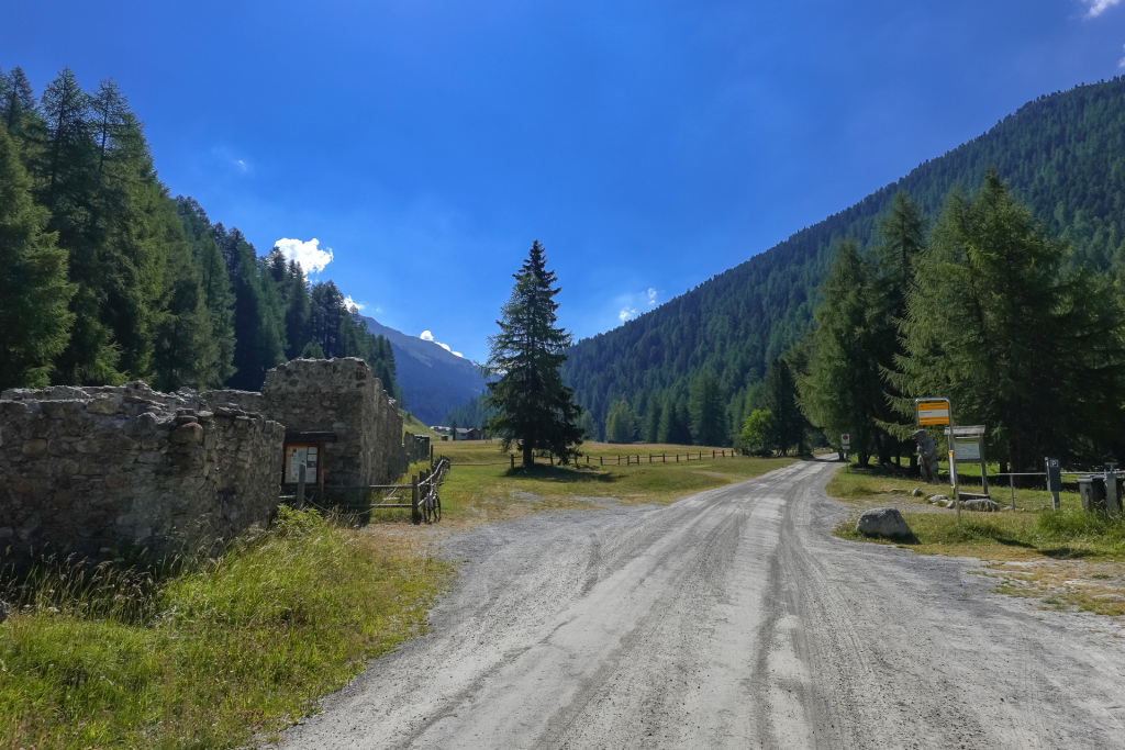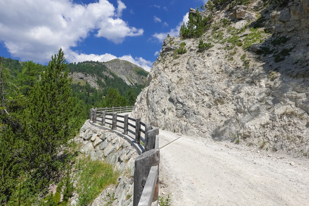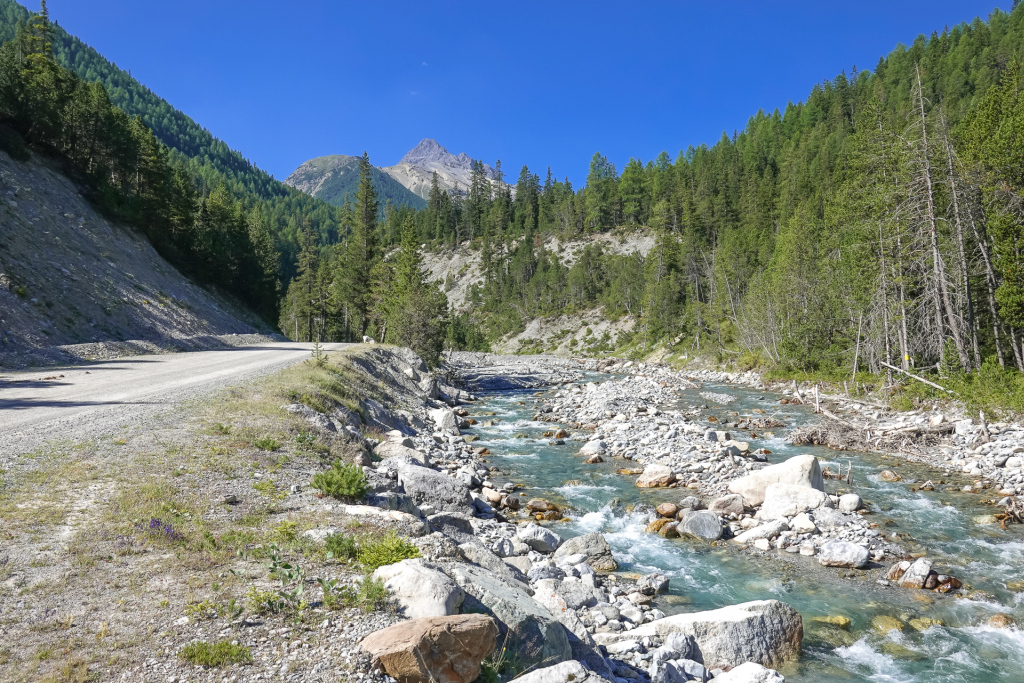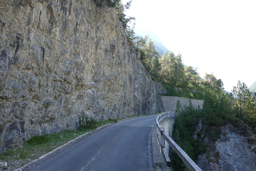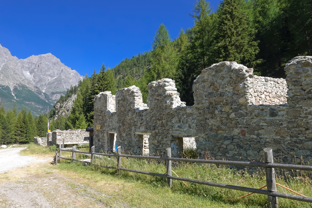 Die ersten Kehren verlaufen zum Glück im Wald, gehen stets bergauf, nach ca. 4 km habe ich bereits 350 hm geschafft. Ich komme aus dem Wald heraus, die Sonne brennt, aber die Straße ist mit sehr feinem Sand/Schotter aufgebaut. Ab & zu überholt mich ein Auto oder sogar ein Bus, der Staub bläst mir ins Gesicht und das atmen fällt schwer. Es ist alles sehr karg hier, rechts geht es eine Schlucht hinunter, unten ein Bachlauf wo normalerweise ein Fluss zu sehen ist. Ein Tunnel darf ich rechts herum auf einem Pfad umfahren, es wird etwas flacher. Kurz vor S-charl gibt es ein „Bergbau und Bären Museum„. Man kann noch Überreste der alten Siedlung erkennen. Fotostop.