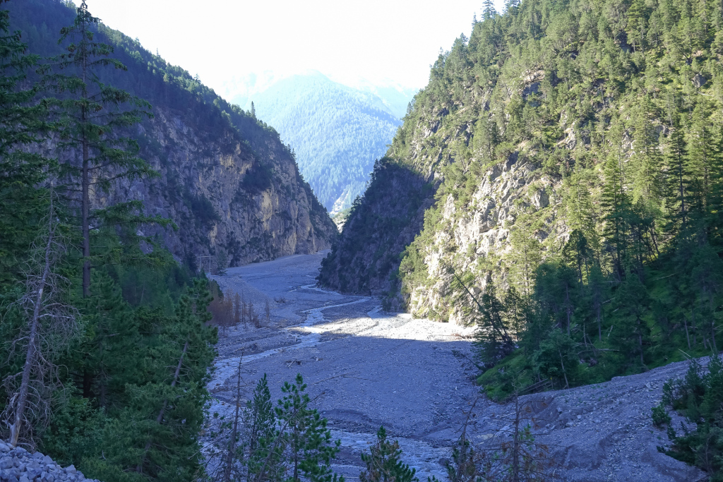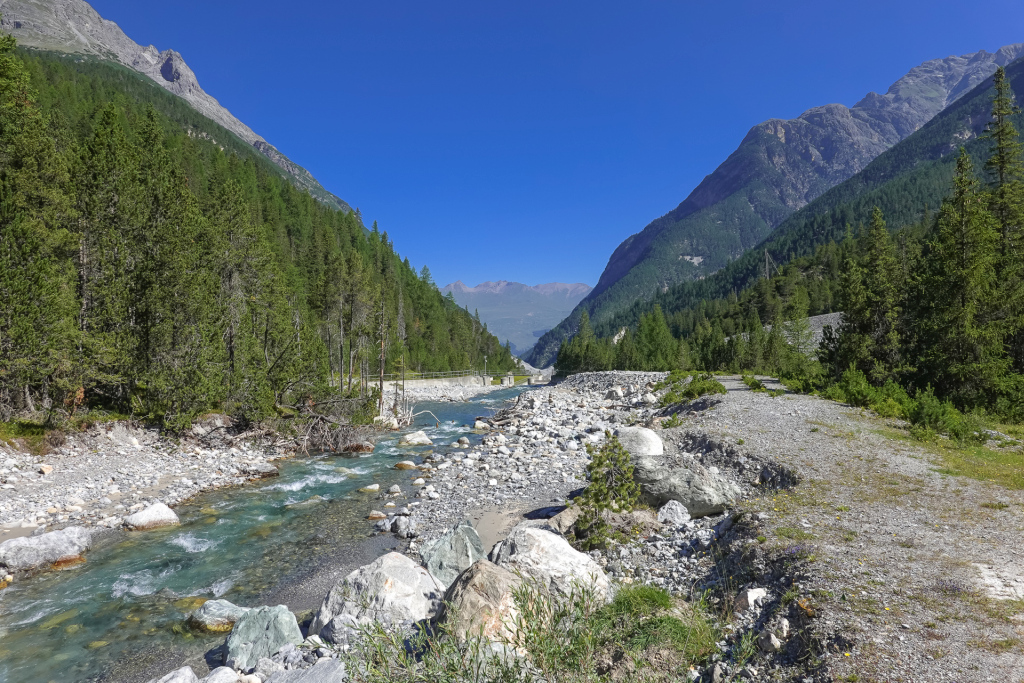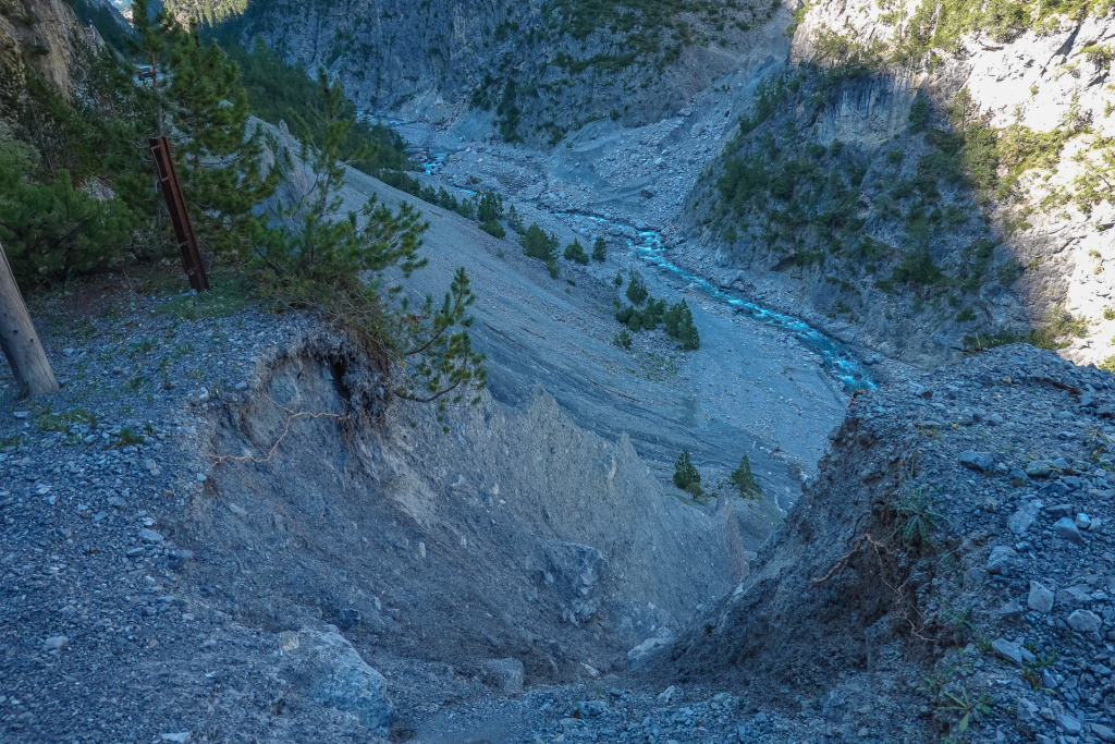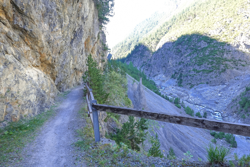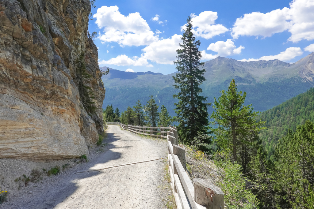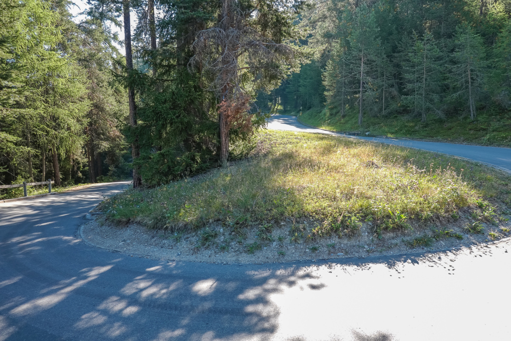 Die ersten Kehren verlaufen zum Glück im Wald, gehen stets bergauf, nach ca. 4 km habe ich bereits 350 hm geschafft. Ich komme aus dem Wald heraus, die Sonne brennt, aber die Straße ist mit sehr feinem Sand/Schotter aufgebaut. Ab & zu überholt mich ein Auto oder sogar ein Bus, der Staub bläst mir ins Gesicht und das atmen fällt schwer. Es ist alles sehr karg hier, rechts geht es eine Schlucht hinunter, unten ein Bachlauf wo normalerweise ein Fluss zu sehen ist. Ein Tunnel darf ich rechts herum auf einem Pfad umfahren, es wird etwas flacher. Kurz vor S-charl gibt es ein „Bergbau und Bären Museum„. Man kann noch Überreste der alten Siedlung erkennen. Fotostop.
