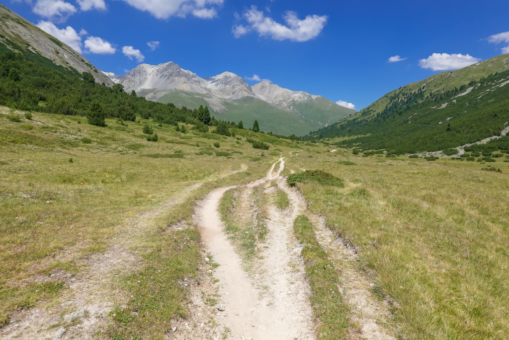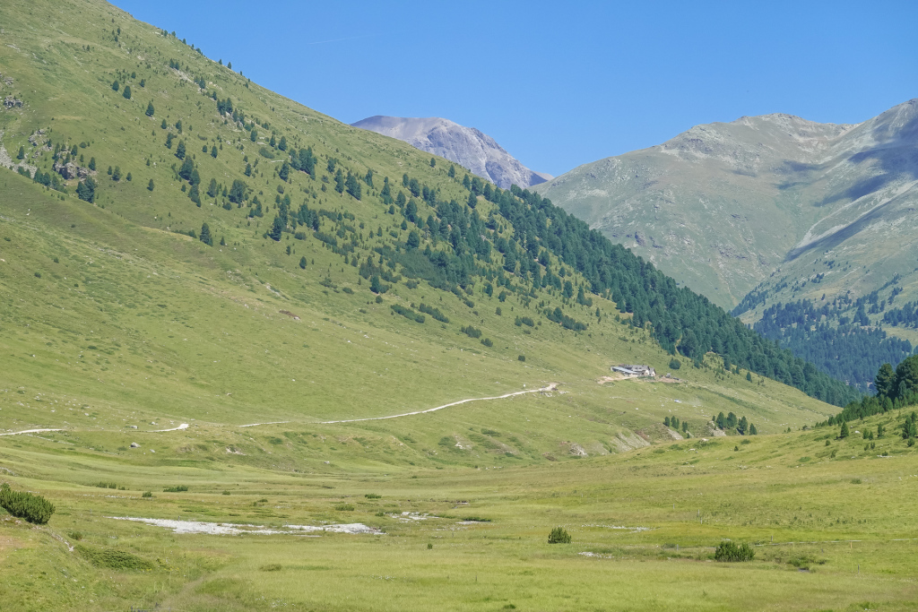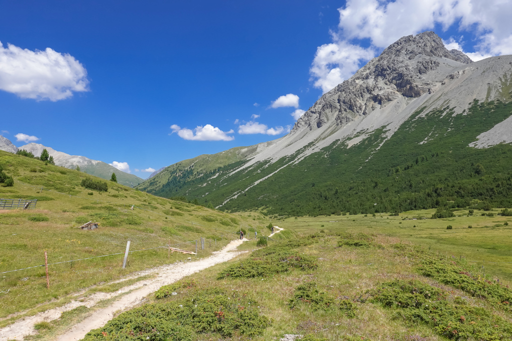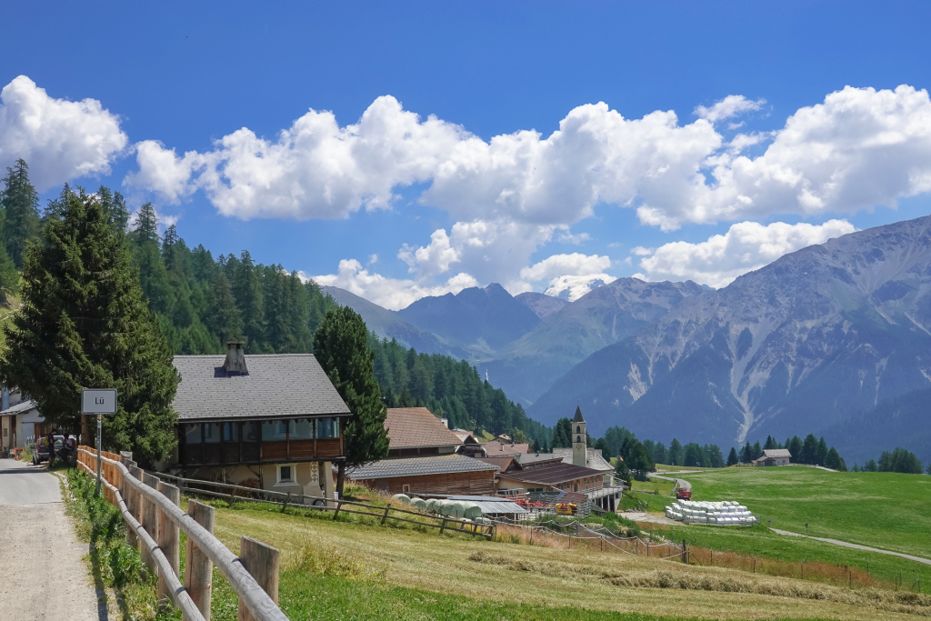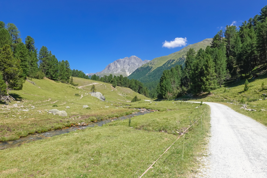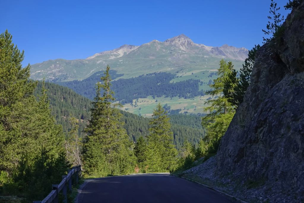 Nach insgesamt 12 km um 640 hm erreiche ich das kleine S-charl. Das kleine Dorf S-charl liegt idyllisch auf 1.800 Meter und dieses Jahr ist hier oben kaum was los. Ich weiß noch, dass 2006 hier oben sehr viele Einheimische & Touristen waren, vielleicht ist es heute einfach zu warm. Ich gönne mir ein kühles, alkfreies Weißbier und genieße die Aussicht. Mein Mitfahrer will weiter, wir werden uns noch öfter „über den Weg“ laufen. Am Dorfbrunnen fülle ich noch meine Flasche und es geht weiter.