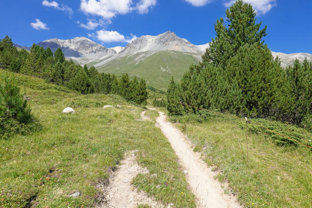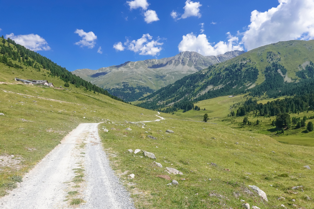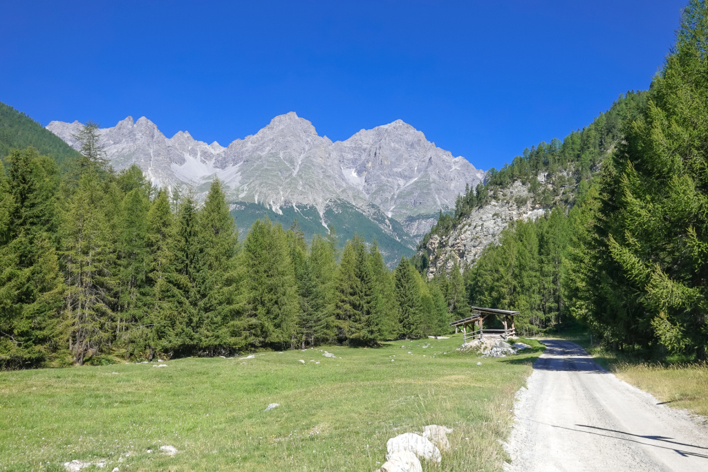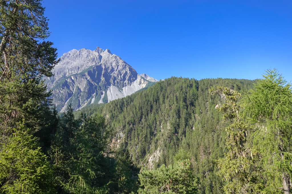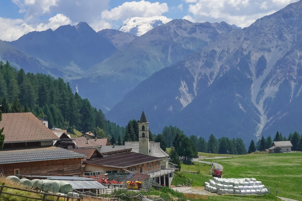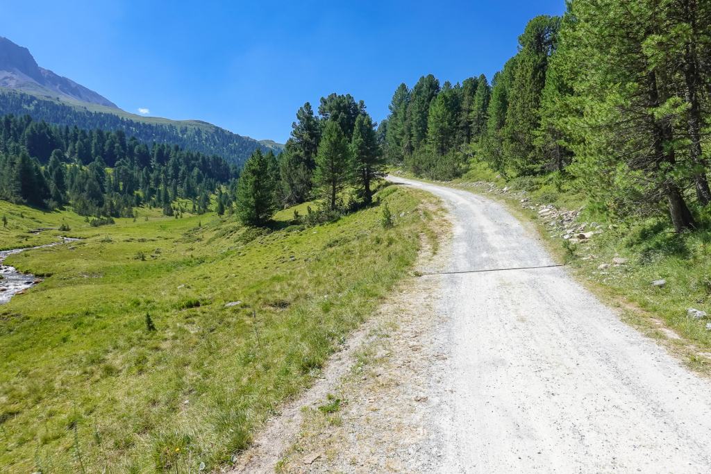 Nach insgesamt 12 km um 640 hm erreiche ich das kleine S-charl. Das kleine Dorf S-charl liegt idyllisch auf 1.800 Meter und dieses Jahr ist hier oben kaum was los. Ich weiß noch, dass 2006 hier oben sehr viele Einheimische & Touristen waren, vielleicht ist es heute einfach zu warm. Ich gönne mir ein kühles, alkfreies Weißbier und genieße die Aussicht. Mein Mitfahrer will weiter, wir werden uns noch öfter „über den Weg“ laufen. Am Dorfbrunnen fülle ich noch meine Flasche und es geht weiter.