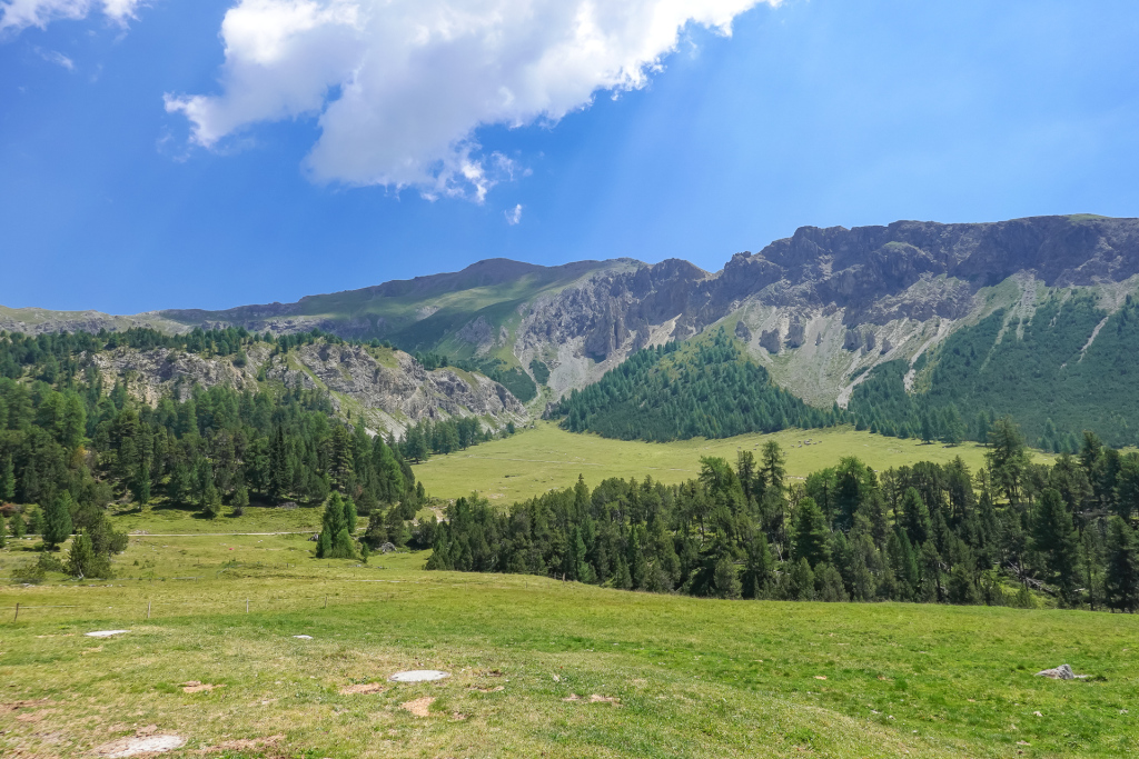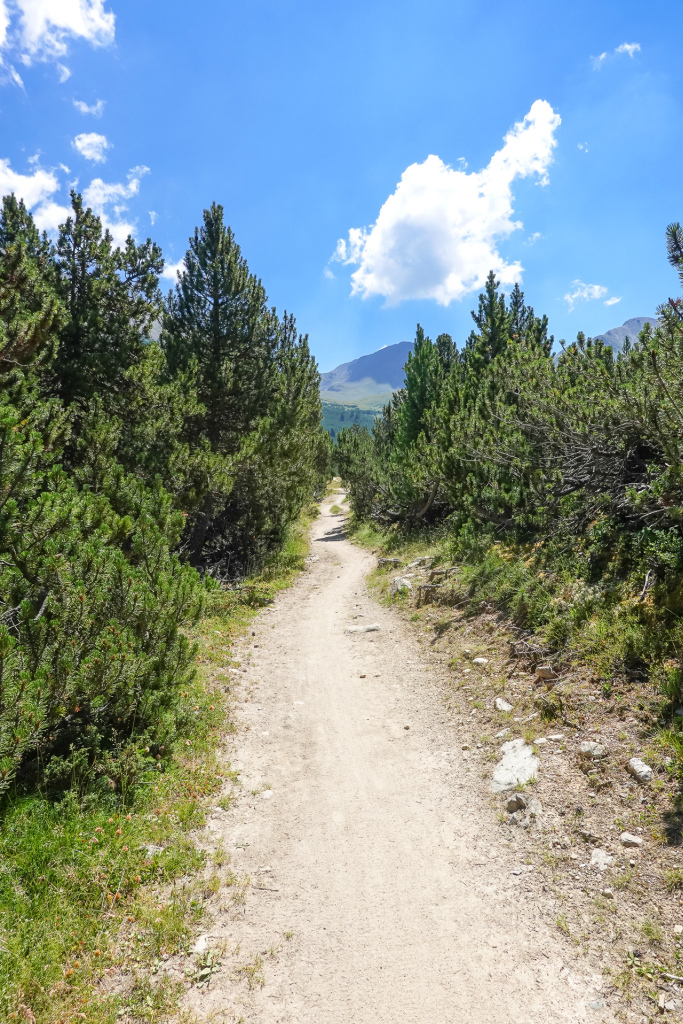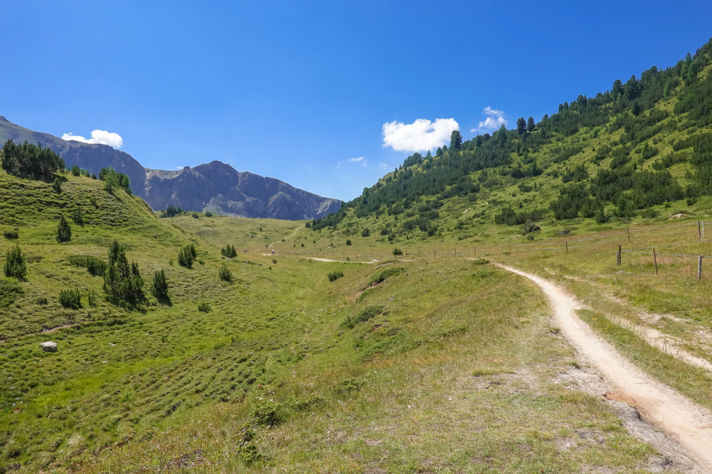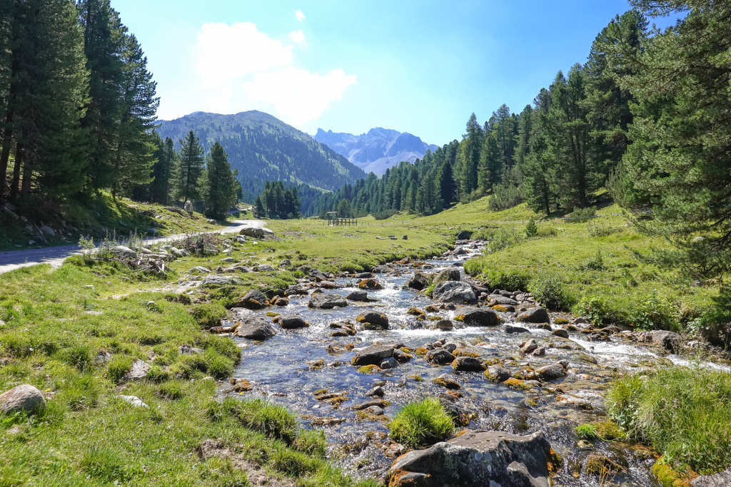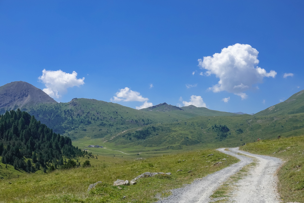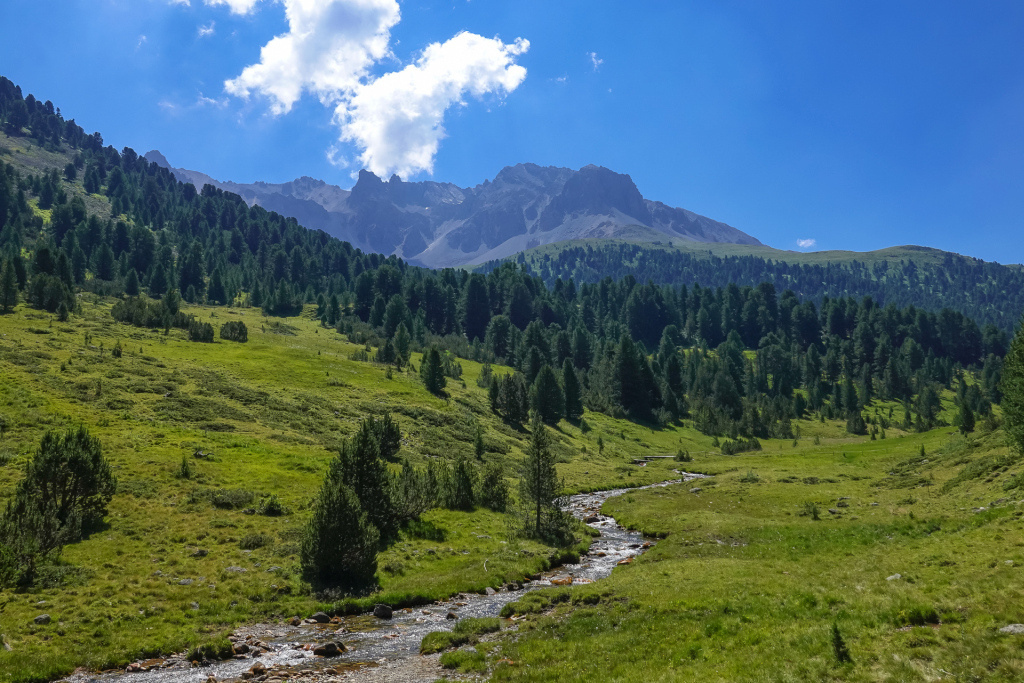 Nach insgesamt 12 km um 640 hm erreiche ich das kleine S-charl. Das kleine Dorf S-charl liegt idyllisch auf 1.800 Meter und dieses Jahr ist hier oben kaum was los. Ich weiß noch, dass 2006 hier oben sehr viele Einheimische & Touristen waren, vielleicht ist es heute einfach zu warm. Ich gönne mir ein kühles, alkfreies Weißbier und genieße die Aussicht. Mein Mitfahrer will weiter, wir werden uns noch öfter „über den Weg“ laufen. Am Dorfbrunnen fülle ich noch meine Flasche und es geht weiter.