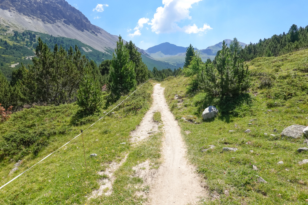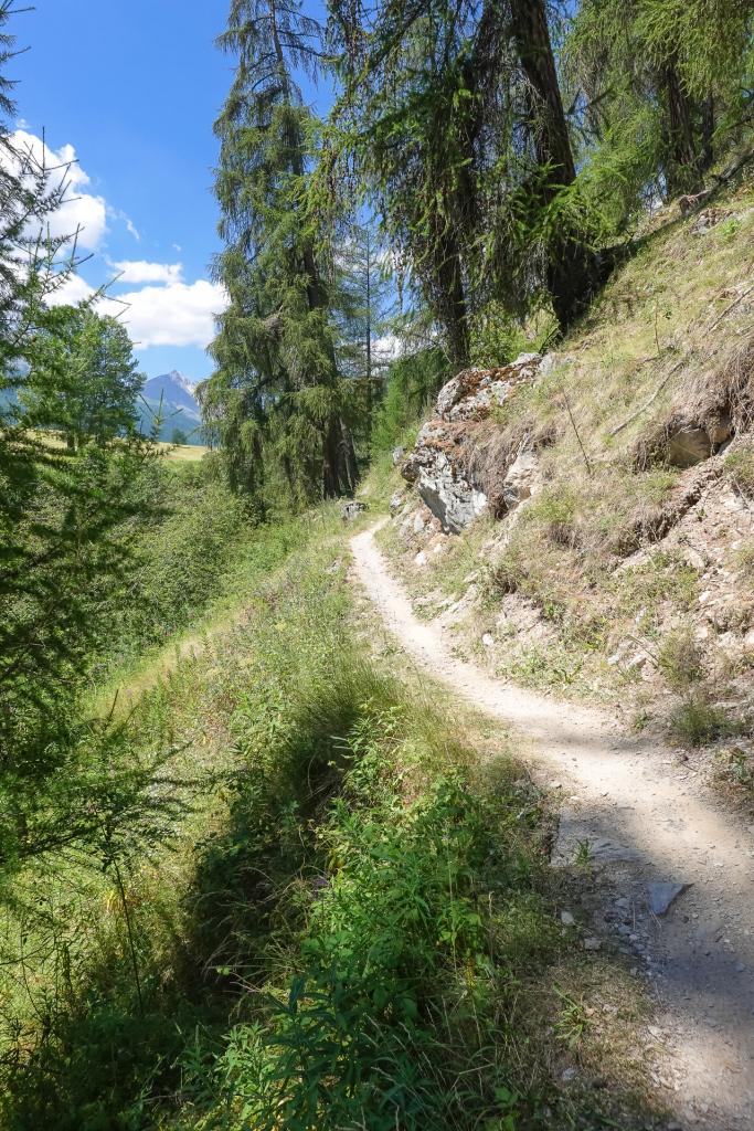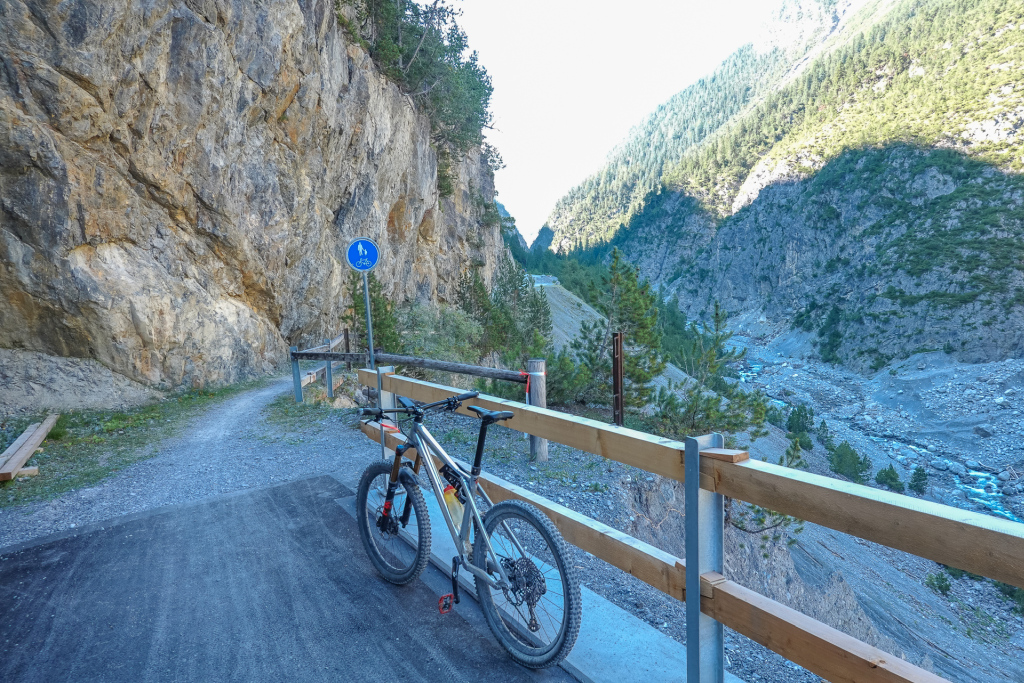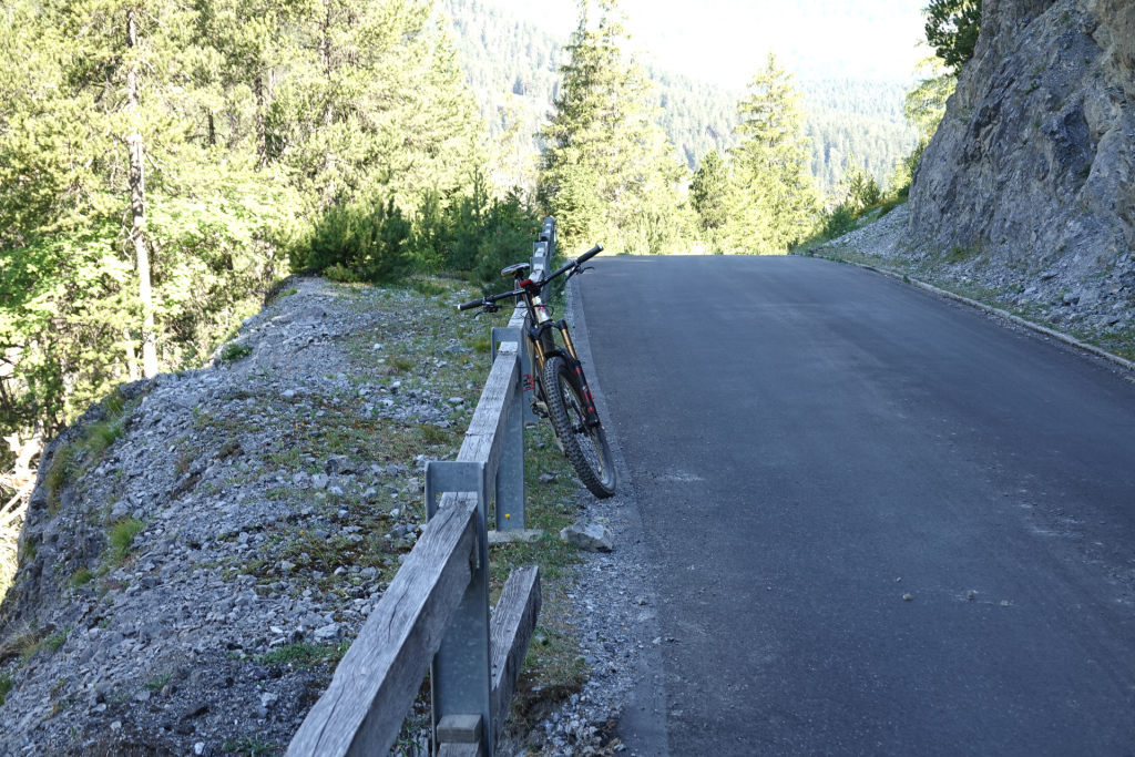 Ab beginnt eine Abfahrt auf Asphalt, hier kann man es richtig laufen lassen. Kurz vor Muglin könnte mal auf der Straße oder Radweg relativ schnell nach Münstair fahren. Ich habe aber einen Tipp von Andreas Albrecht bekommen. Oberhalb der Straße verläuft ein Trail, der von den Einheimischen stets gepflegt wird. Der muss es heute noch sein. Ich verpasse die erste Einfahrt, so steige ich etwas weiter unten in den Trail ein. Andreas hat nix falsches versprochen, echt toll zu fahren, immer am Berghang entlang, kleine Rampen und tolle enge Pfade. Es ist zwar auch sehr anstrengend gerade bei 32 Grad, aber es macht dennoch sehr viel Spass hier zu biken. Der ganze Trail ist fast 10 km lang – super!