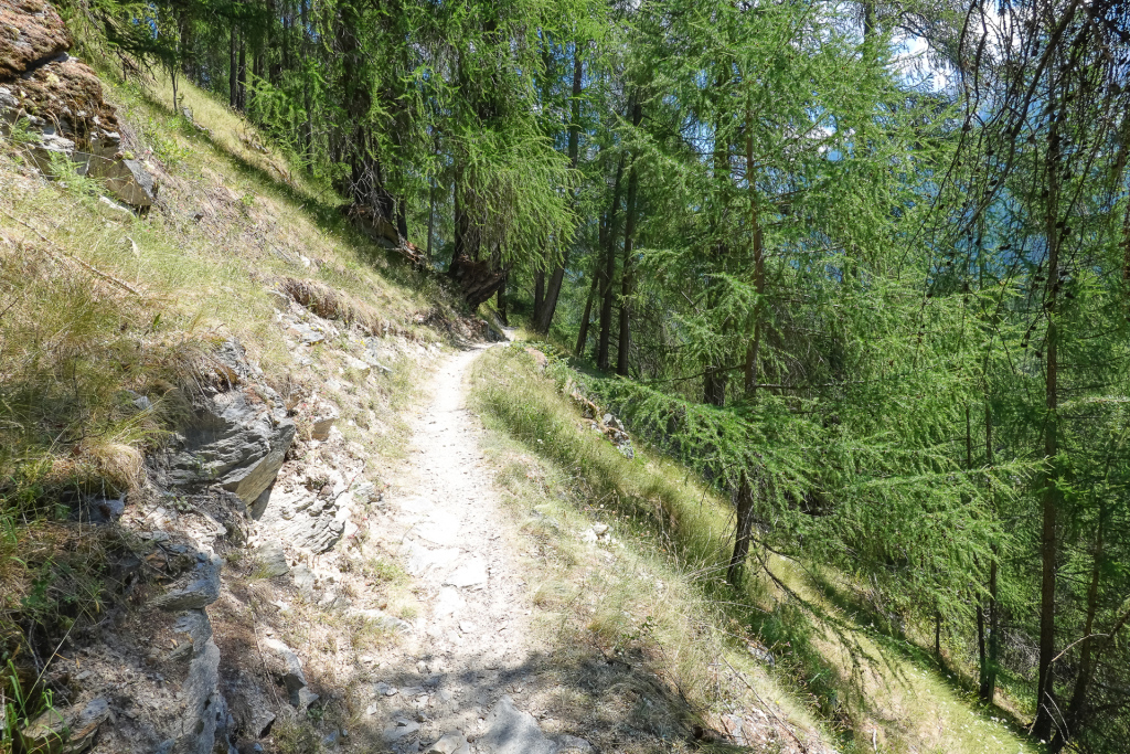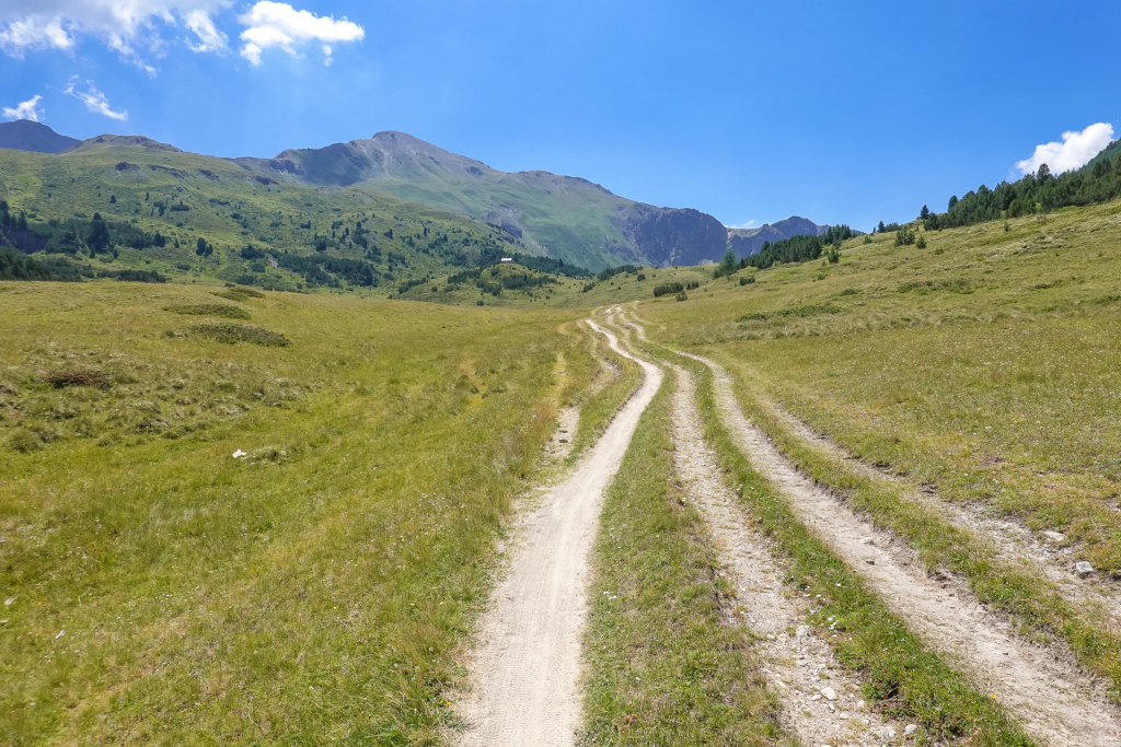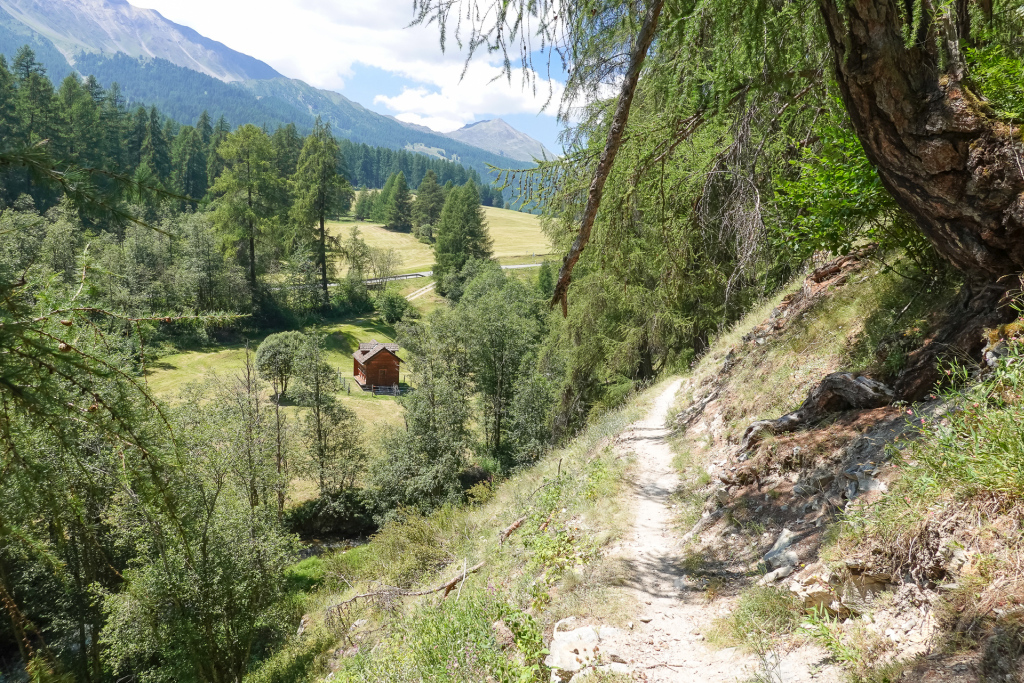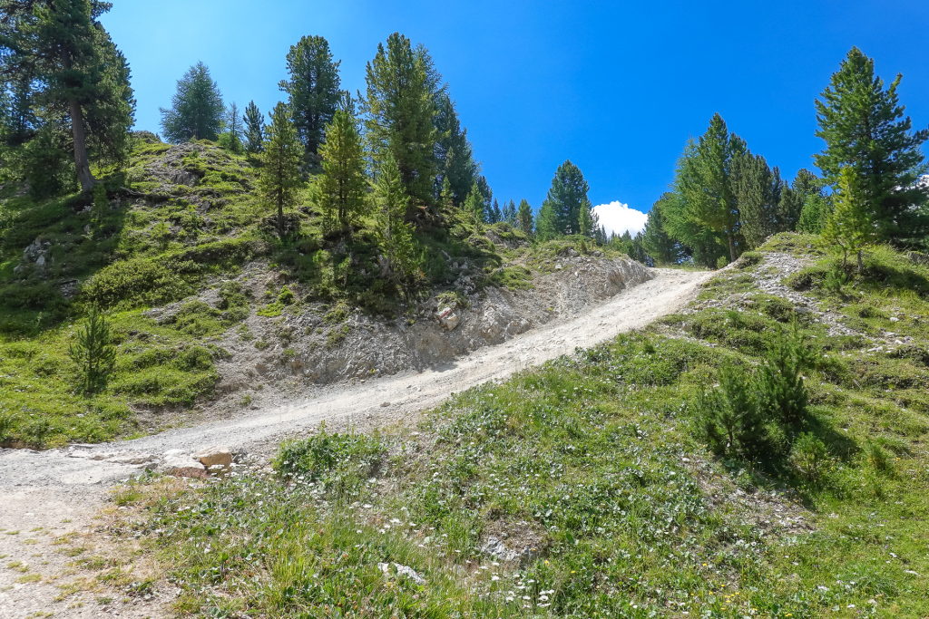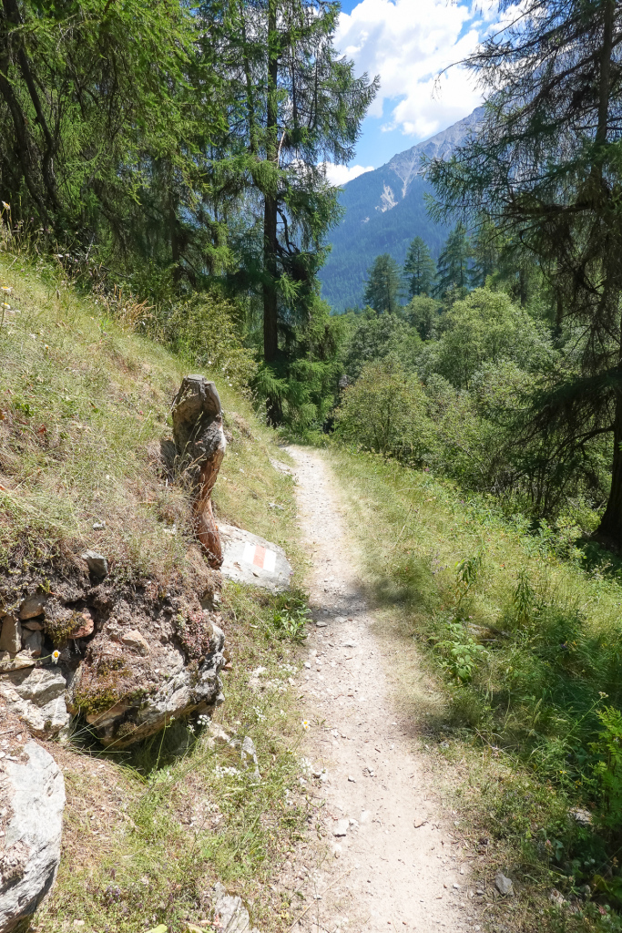 Ab beginnt eine Abfahrt auf Asphalt, hier kann man es richtig laufen lassen. Kurz vor Muglin könnte mal auf der Straße oder Radweg relativ schnell nach Münstair fahren. Ich habe aber einen Tipp von Andreas Albrecht bekommen. Oberhalb der Straße verläuft ein Trail, der von den Einheimischen stets gepflegt wird. Der muss es heute noch sein. Ich verpasse die erste Einfahrt, so steige ich etwas weiter unten in den Trail ein. Andreas hat nix falsches versprochen, echt toll zu fahren, immer am Berghang entlang, kleine Rampen und tolle enge Pfade. Es ist zwar auch sehr anstrengend gerade bei 32 Grad, aber es macht dennoch sehr viel Spass hier zu biken. Der ganze Trail ist fast 10 km lang – super!