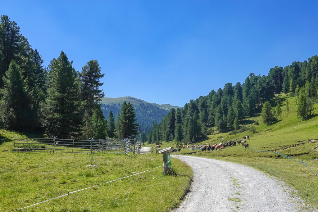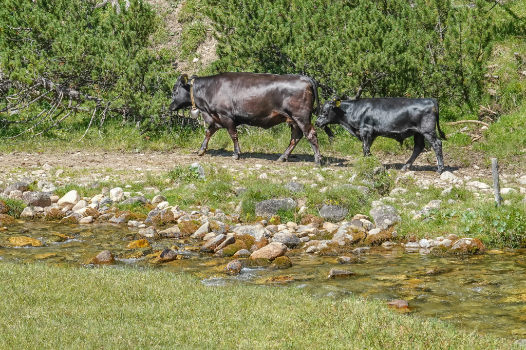 Ab und zu eine kleine Rampe, dann wieder locker, so schlängelt sich der Weg den Berg hinauf. Eine Kuhherde mit jungen Kälbern auf der rechten Seite, ein Bachlauf mit kristallklarem Wasser, Berggipfel, hier könnte man auch einen Heidifilm drehen. Die Hütte Alp Astras lasse ich links liegen, ich will weiter unten einkehren und eine längere pause einlegen.