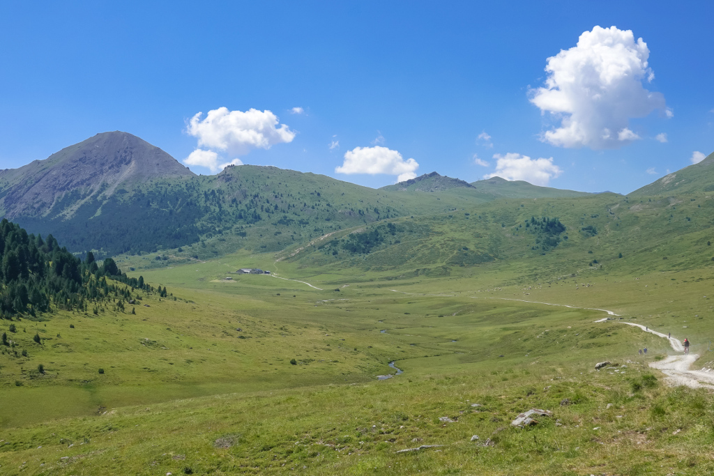 Es ist heute morgen schon anständig heiß, 8:30 Uhr und 26 Grad. Und es geht gleich mal hinauf. Ich bin noch nicht richtig im „Tritt“, brauche noch ein wenig um in Schwung zu kommen. Eigentlich wollte ich nicht gleich die Straße hoch, sondern auf einen Schotterweg links herum Richtung San Jon. Doch ich habe einen Biker getroffen, der den gleichen Weg hinauf zum Passo Costainas fährt, dem hab ich mich einfach angeschlossen.