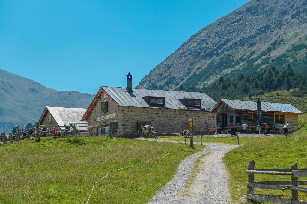 Ich mache einen kleinen Schlecker rechts in einer Abzweigung und besuche die Alp Campatsch, eine Hütte mit exzellentem Ruf für gutes Essen. Ich habe keinen Hunger, aber der frische und gut gekühlter Apfelmost schmeckt echt lecker.