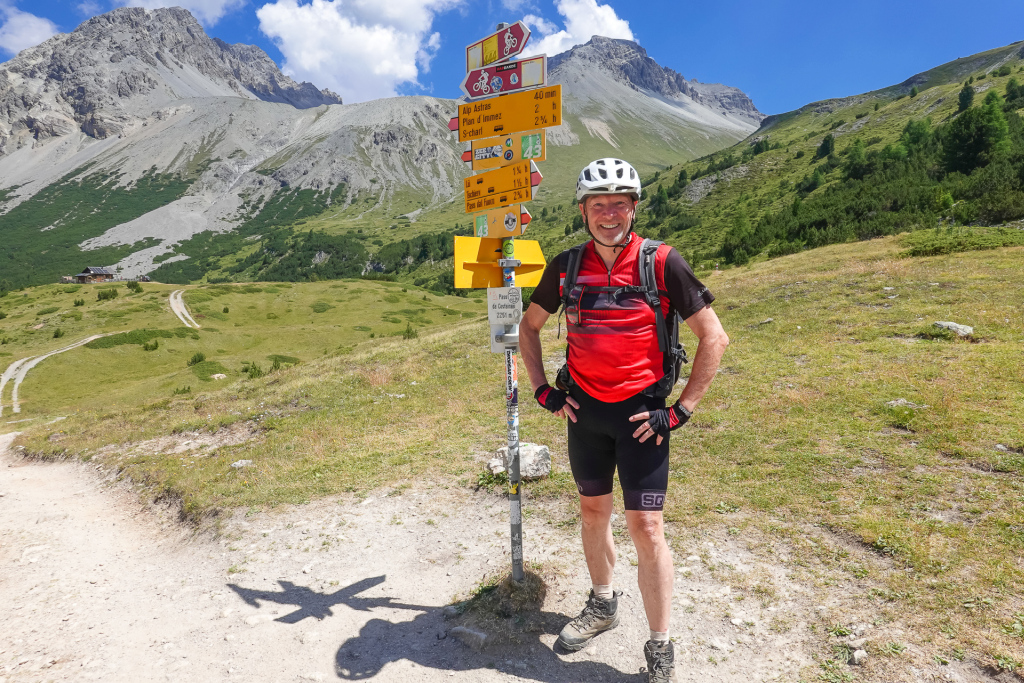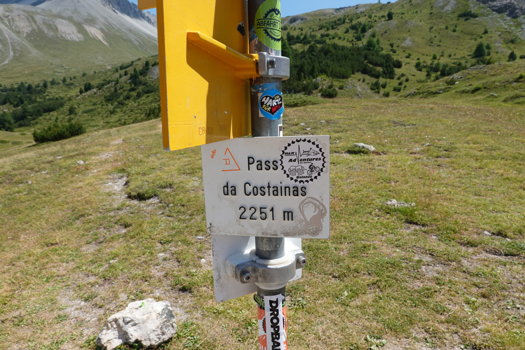 Nach der Hütte beginnt ein wirklich sehr schöner, schmaler und immer fahrbarer Singletrail bis zum Pass da Costainas auf 2.250 Meter. Es ist eine der wenigen Pässe der Alpen, der komplett fahrbar ist. Die Bilder dürfen natürlich nicht fehlen und die Schotterabfahrt, die vor mir liegt ist zwar schwer und teilweise extrem steil, aber fahrbar und macht einen höllischen Spaß!