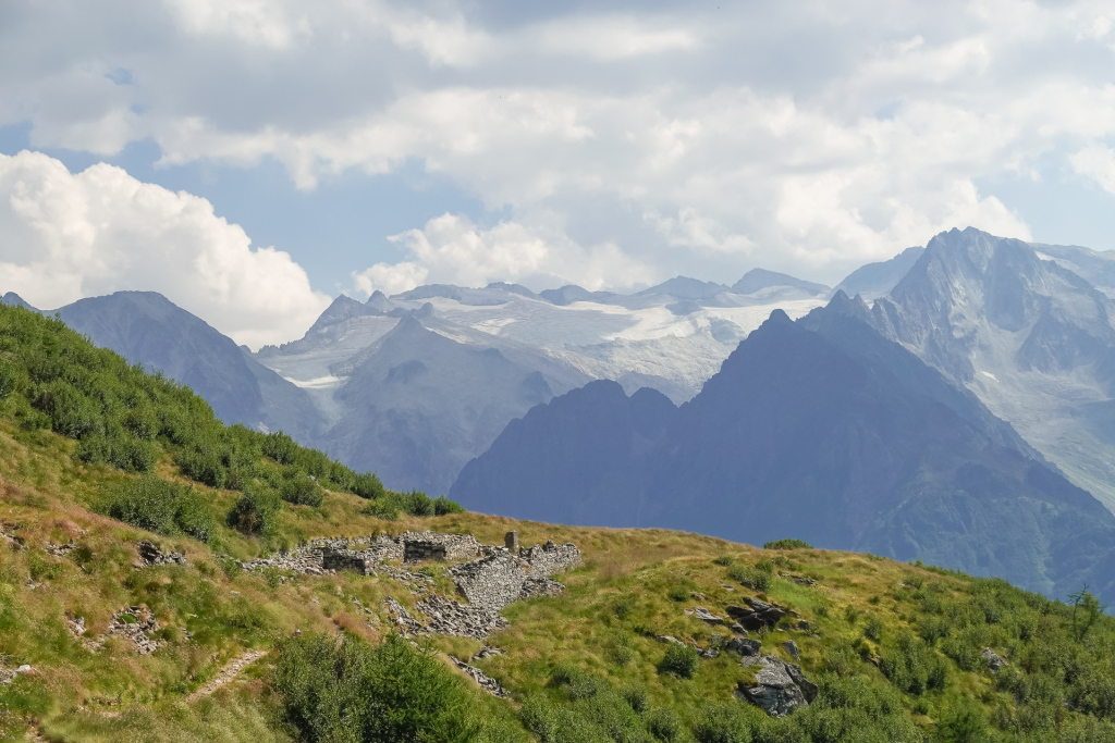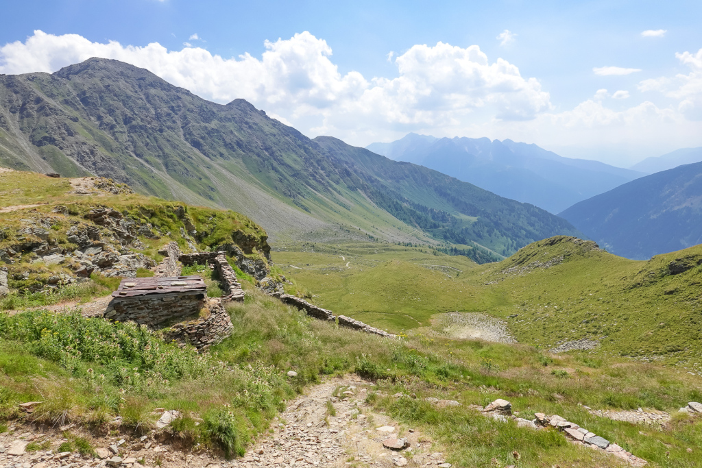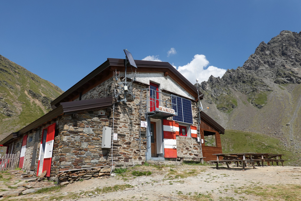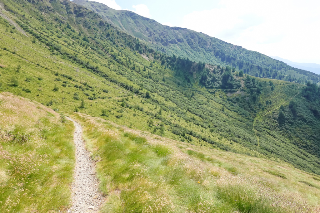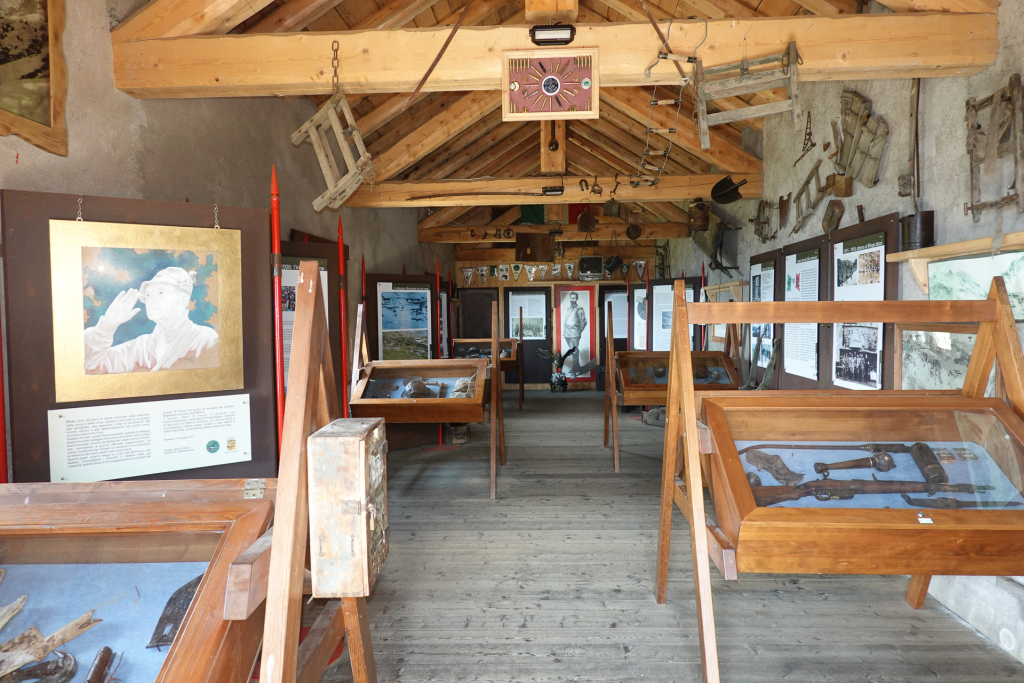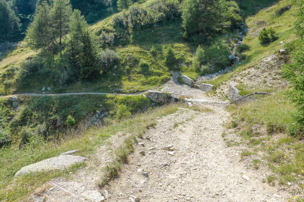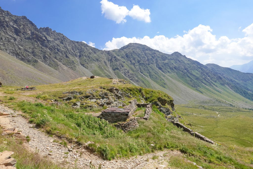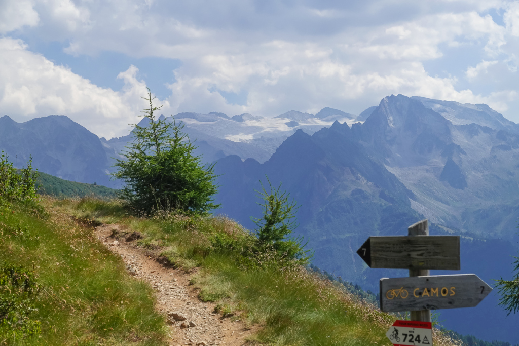 Jetzt kommt es nochmal dicke, ich kenn die auffahrt schon. Zunächst rein ins Seitental nach Case di Viso, 3 km und 200 hm sind vollbracht, fehle zur Bozzi Hütte nur noch 7km und 700 hm. Die Sonne brutzelt mir auf den Kopf, der Schweiß rinnt gerade so herab, oft ist es mir zu steil und ich laufe schneller als ich fahren würde. nach unendlich vorkommende 2 Stunden habe ich es geschafft und bestelle mir 2 kalte Getränke aus dem Kühlschrank, Schwupps waren die weg. Ein paar Fotos von den alten Kriegsgraben, kurzer Blick ins Museum, dann geht es auch schon wieder runter. Nicht über die Montozzo Scharte, sondern ein Stück des Weges zurück und auf den Trail nach Passo Tonale. Dieser Weg wurde mal wegen der Transalp Challenge optimiert, vieles davon ist fahrbar, aber es gibt auch einige kleine Rampen zum hochlaufen. Komplett ist dieser Weg 12 km lang, 170 hm bergauf und 700 hm bergab. Es macht spaß ist aber auch nach dem Aufstieg von Pezzo kräfteraubend.