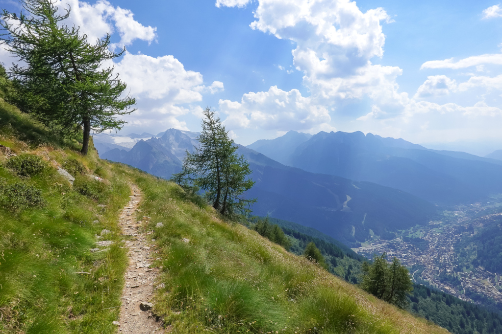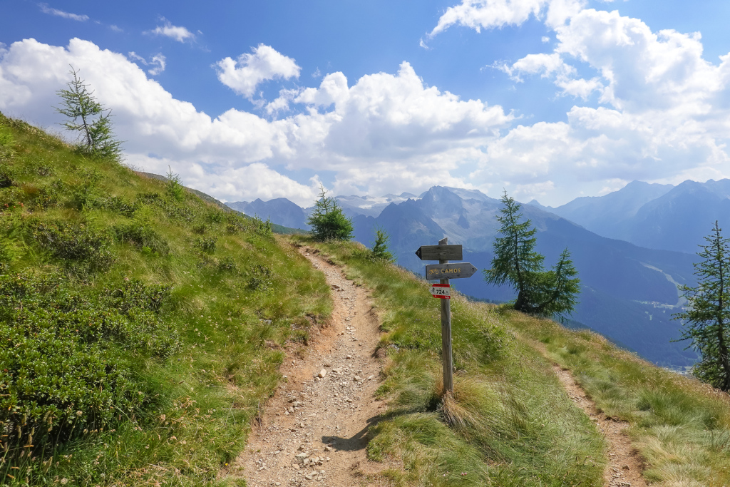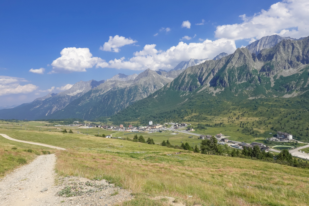 Jetzt rollen wir hinunter zur Talstation, lassen uns auf 2.700 m hochfahren und genießen erst einmal den Ausblick. Unten erkennt man des Sunny Valley, ein exklusives Hotel im Mitten der Berge. Für uns viel zu teuer. Erst rollen wir ein Stück runter, dann geht es knapp 80 hm laufend hinauf zum Traileinstieg.