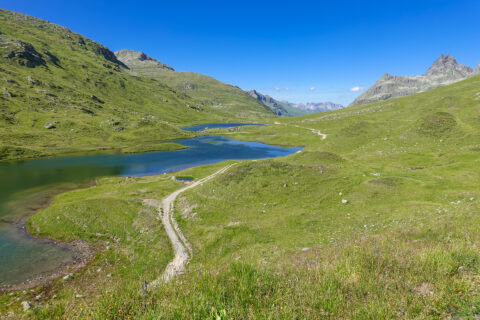 Die Wanderpassage hoch zum Fimberpass war ordentlich, selbst in der Höhe war es verdammt warm. Die Kaltstarts von Ischgl, Scuol und St. Maria haben unsere Körper recht früh zu Höchstleistungen gefordert. Der Trail vom Fimberpass war mit einer meiner Highlight. Aber einen so schönen flowigen Trail wie der zum Grenzübertritt nach Italien (großer Stausee) war einfach der Hammer.