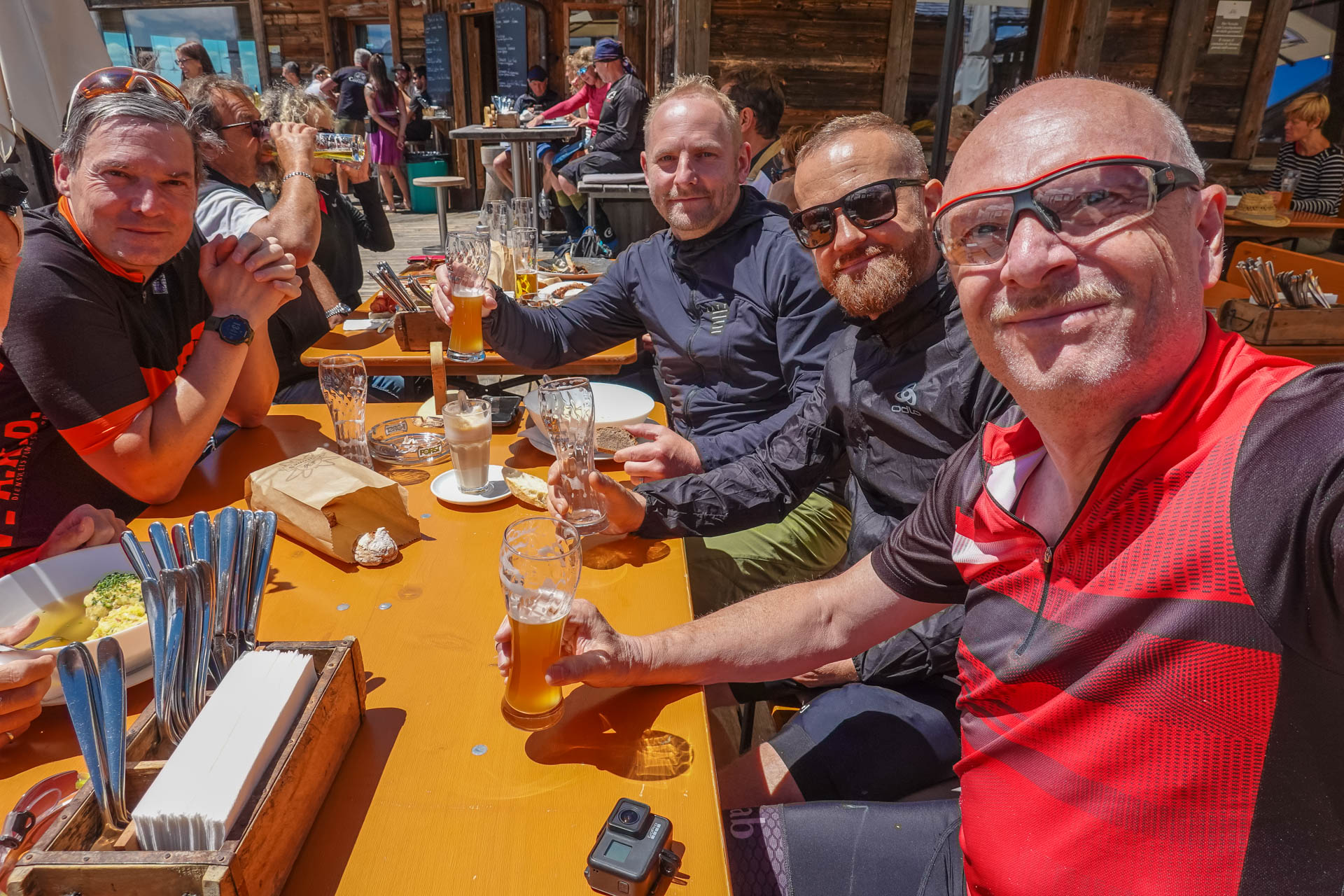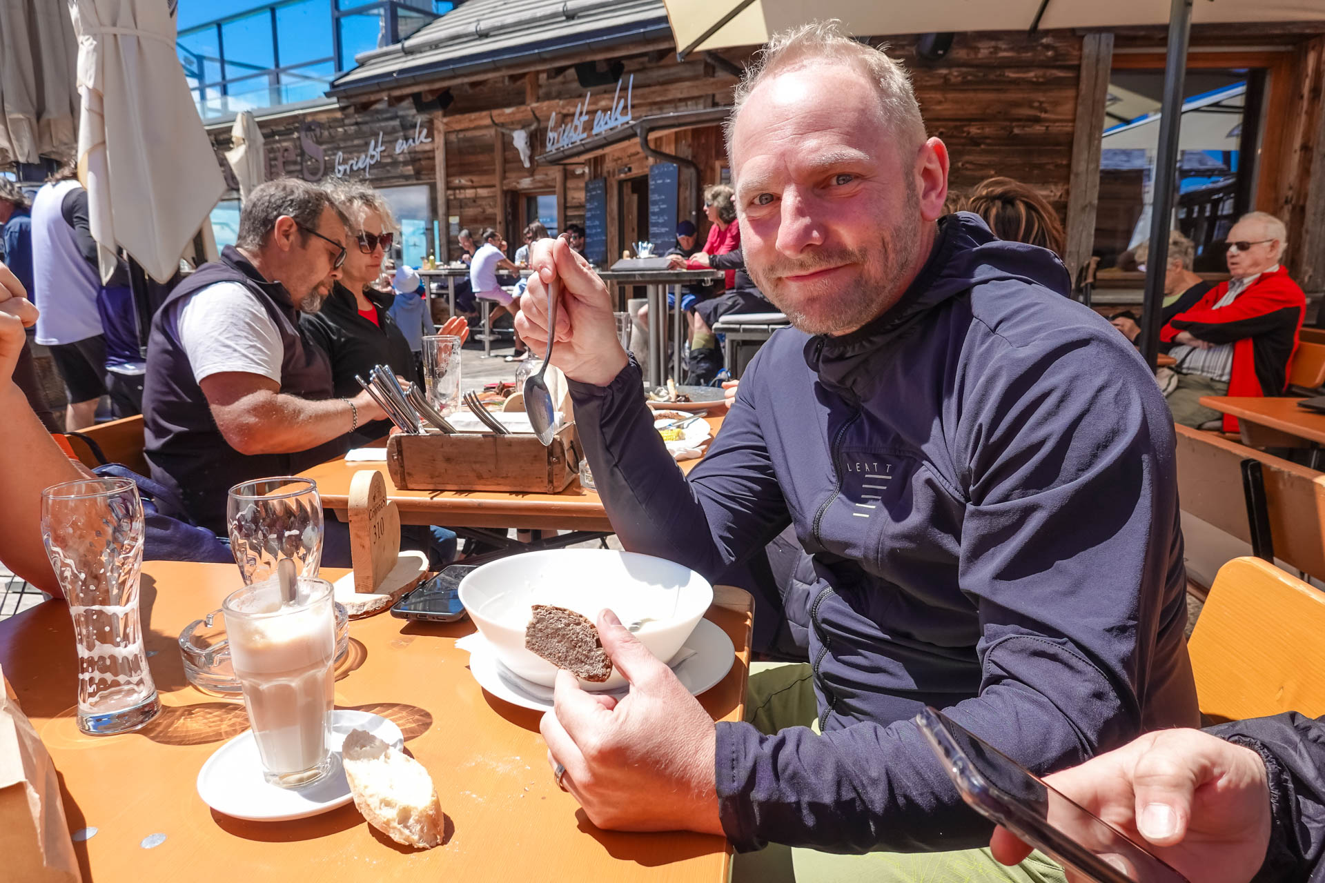 Die Seilbahn bringt uns auf 2.250 Meter hinauf. Wow, was für ein 360-Grad-Rundblick mit einer atemberaubenden Fernsicht hier oben. Unsere Kameras können gar nicht genug davon bekommen. Wir beschließen spontan, auf der Hütte etwas zu trinken und eine Kleinigkeit zu essen.