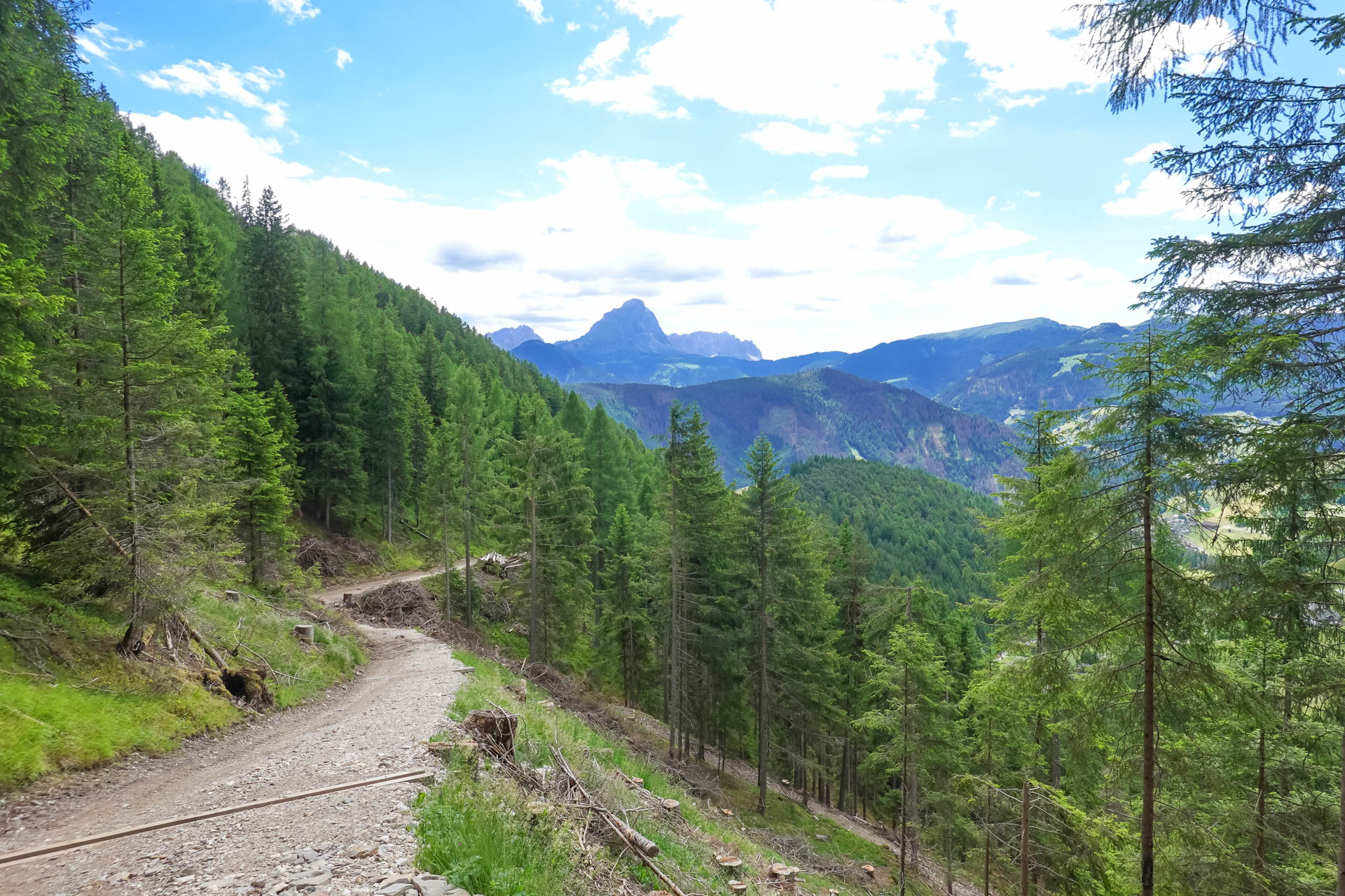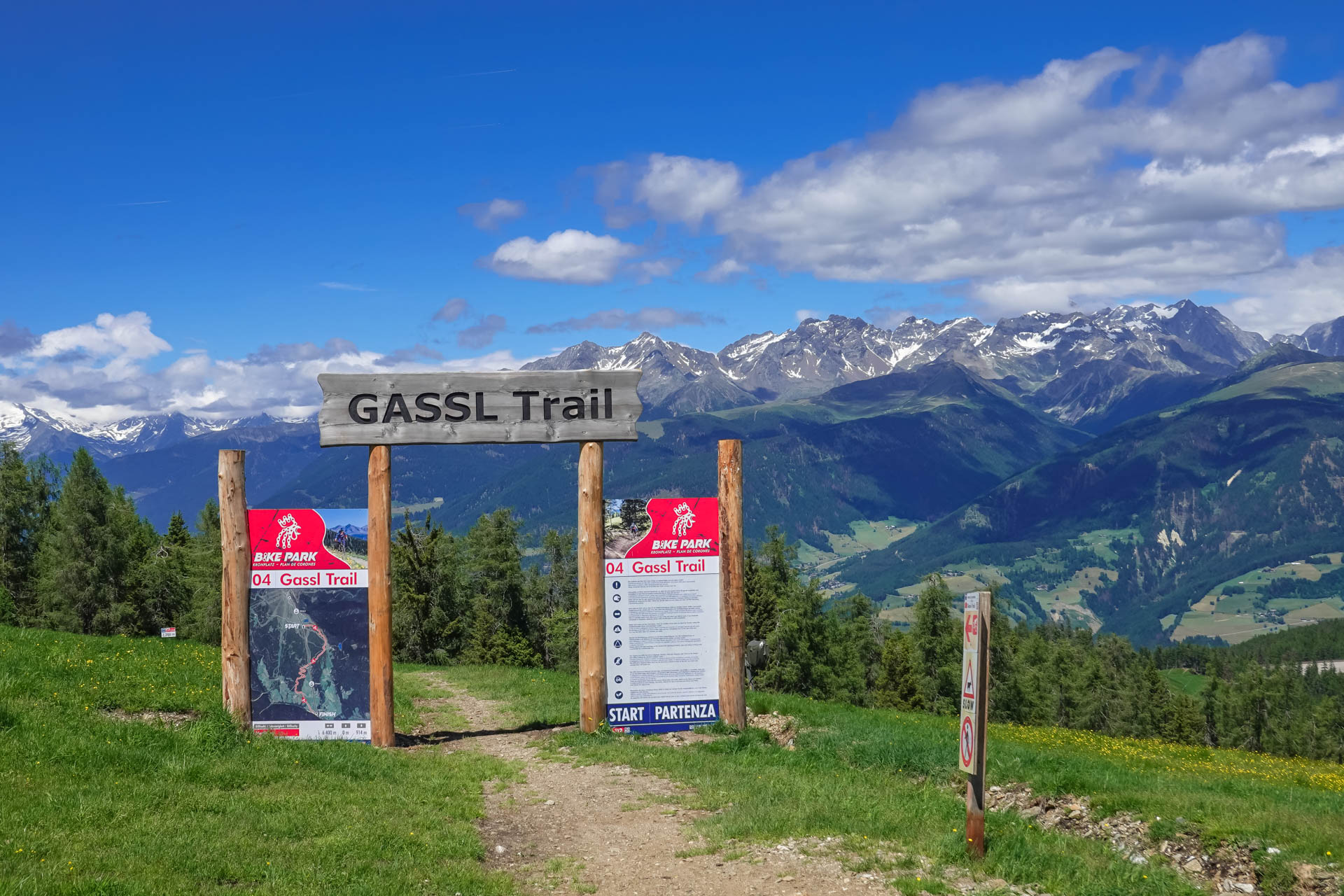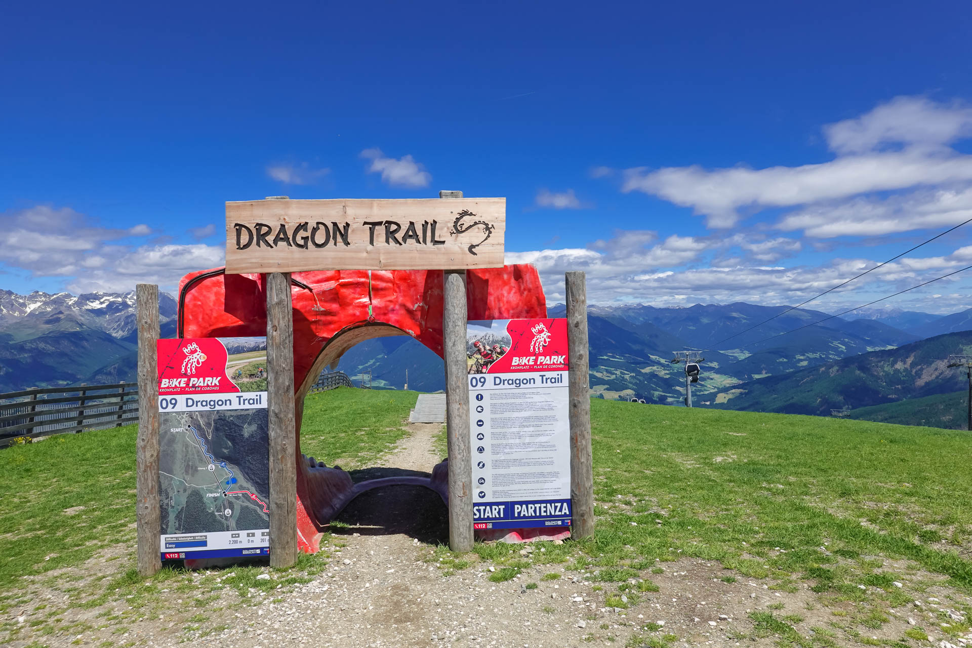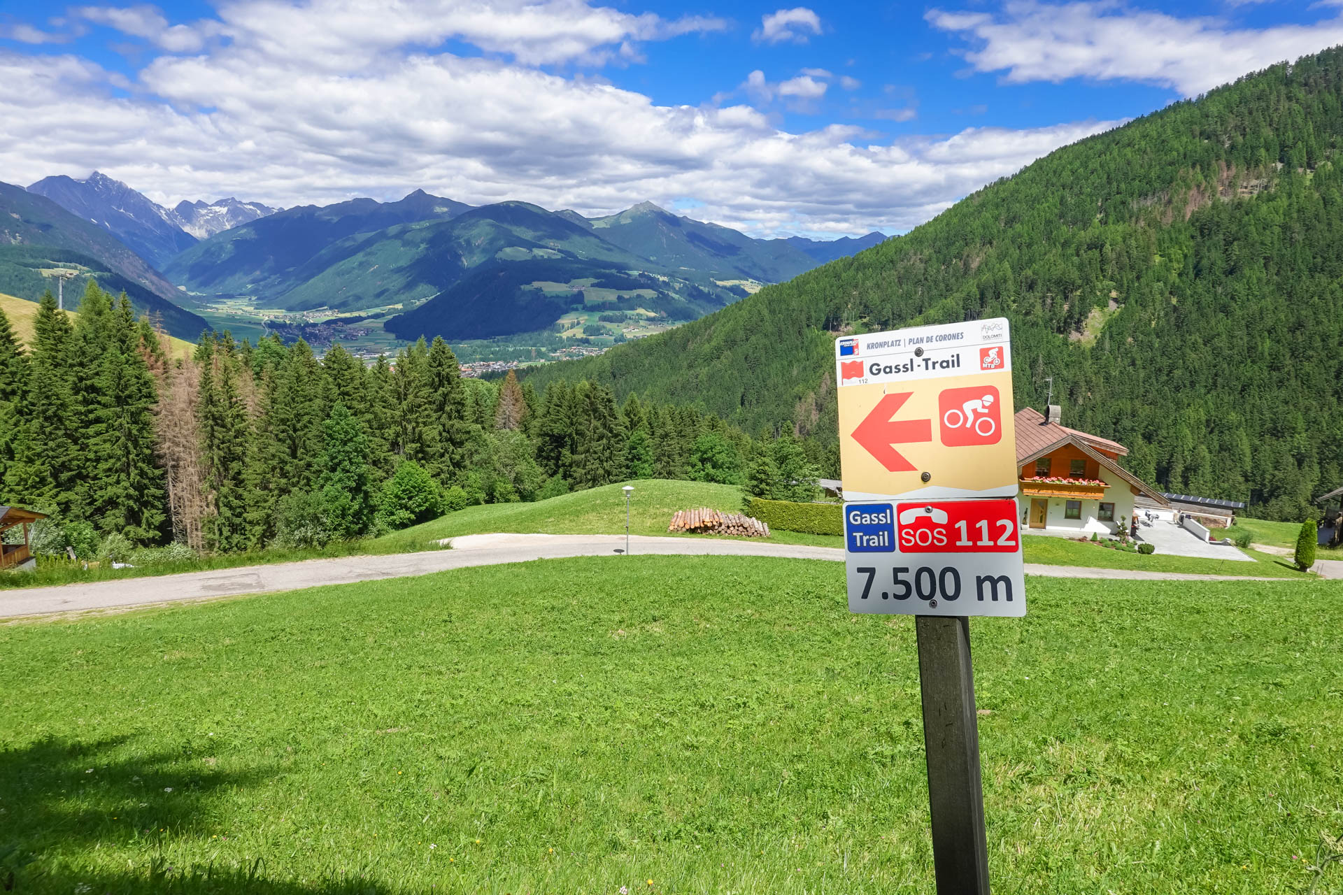 Die leichte Steigung entlang des Radwegs spürt man kaum. Bei angenehmen 25 Grad begleiten uns weiße Schleierwolken und machen diesen Biketag zu einem wahren Genuss. Kurz vor Schloß Ehrenburg verlassen wir den Radweg und fahren auf einem Schotterweg weiter. Hinter einer kleinen Steigung stehen wir vor diesem beeindruckenden Gebäude. Nach einigen Fotos und dem Auffüllen unserer Trinkflaschen am dortigen Brunnen setzen wir unsere Tour fort bis zur Talstation der Kronplatz 2000 Bahn. Dort gönnen wir uns eine Fahrt mit der Gondel, denn oben erwartet uns ein fantastischer, sehr langer Trail.