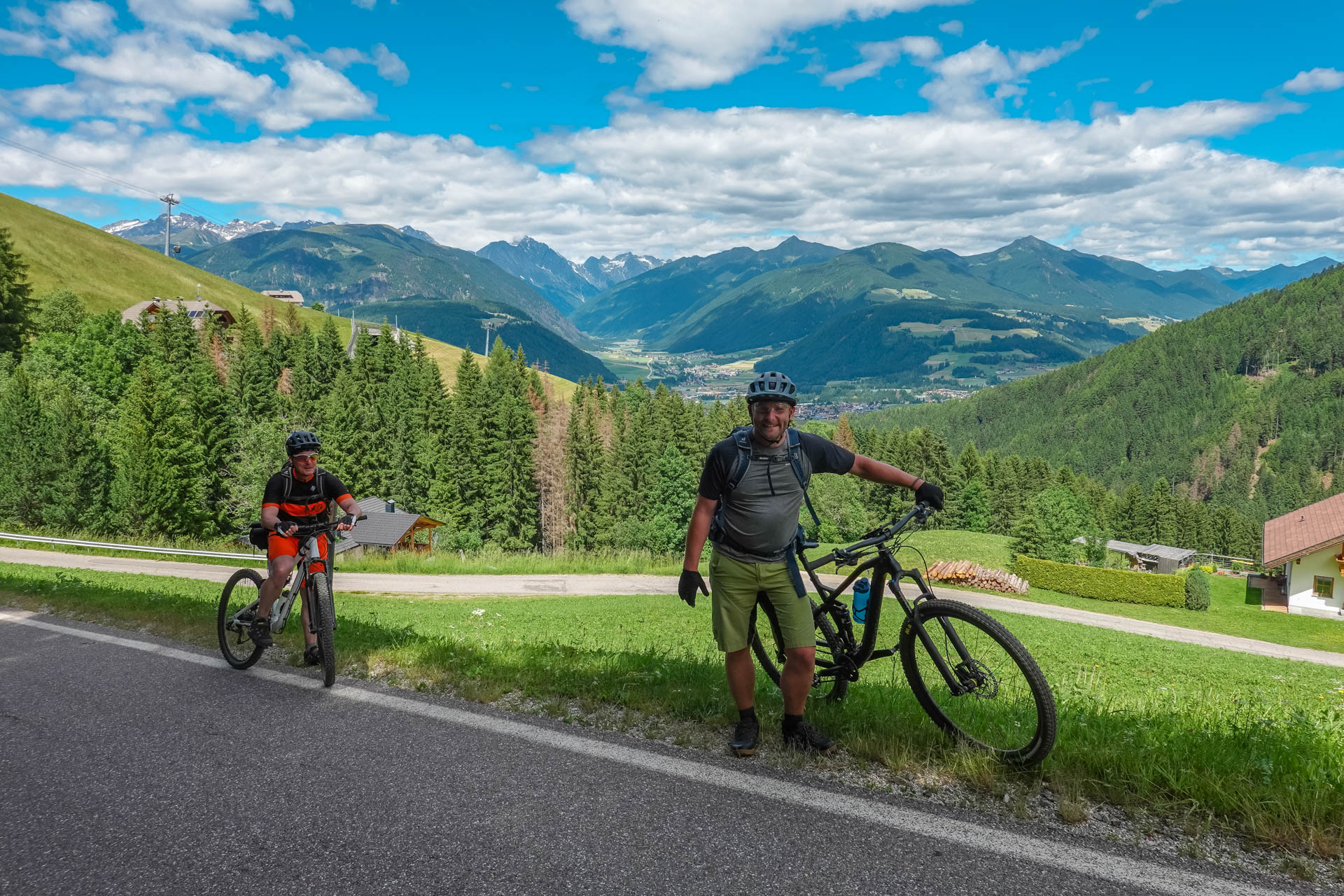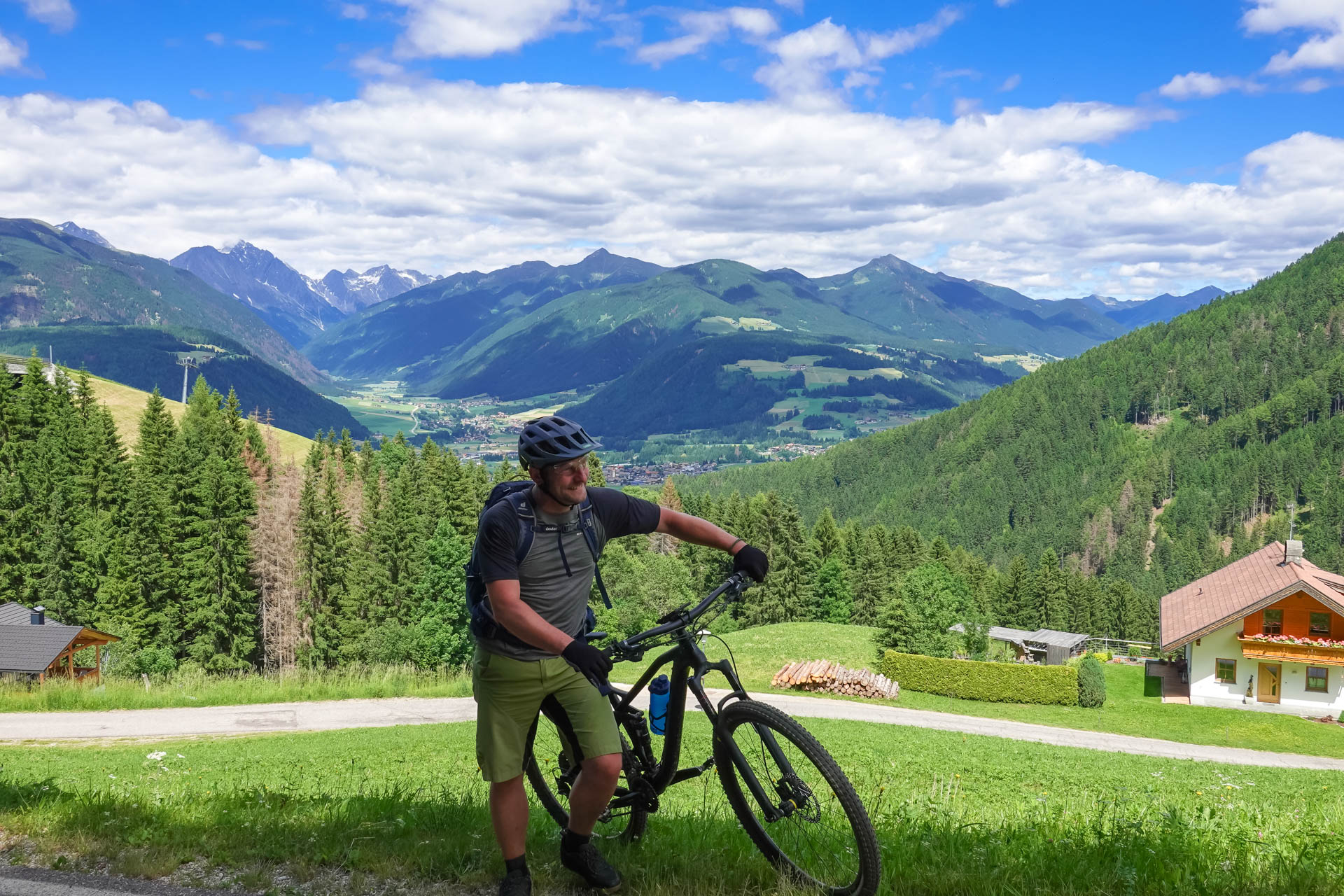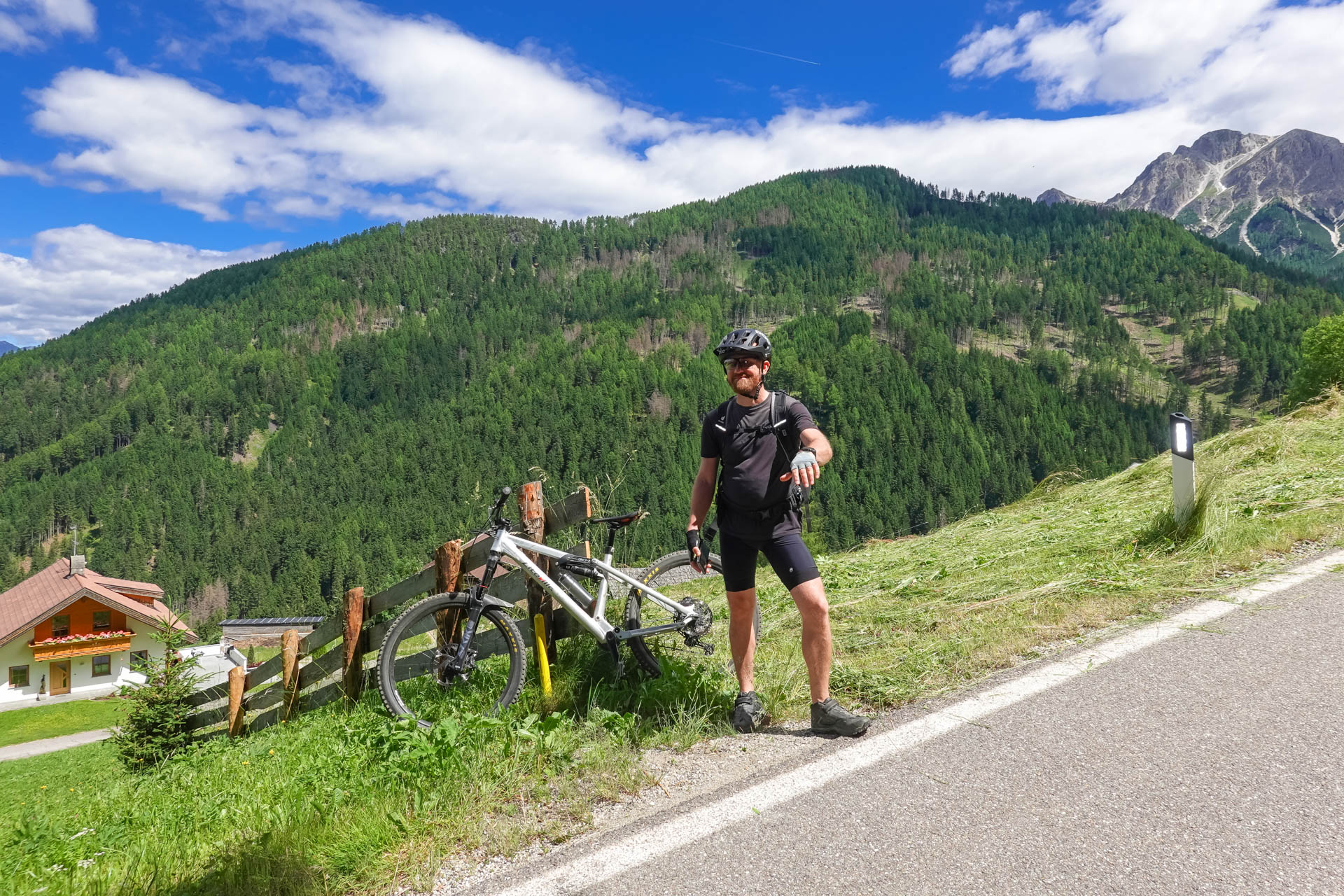 Der Weg führt uns weiter auf eine Straße, die uns die ersten 200 Höhenmeter hinaufführt. Kurz vor einem Schotterweg entdecken wir einen Aussichtspunkt. Ein lebensgroßer „Tiroler Standschütze“ steht dort auf einer kleinen Plattform, daneben eine Schautafel, die uns einen Einblick in die Geschichte und die Bedeutung dieses Symbols gewährt. Wir machen einige Fotos, gönnen uns eine kurze Pause und setzen dann unsere Fahrt fort. Es folgt ein gut befahrbarer Schotterweg und ein kleiner Trail über Almwiesen, bis wir schließlich in Mühlbach ankommen.