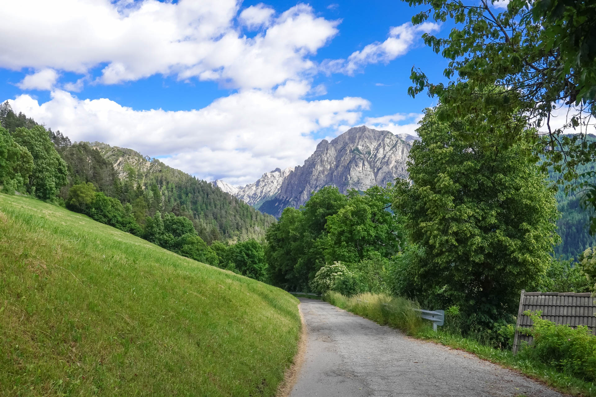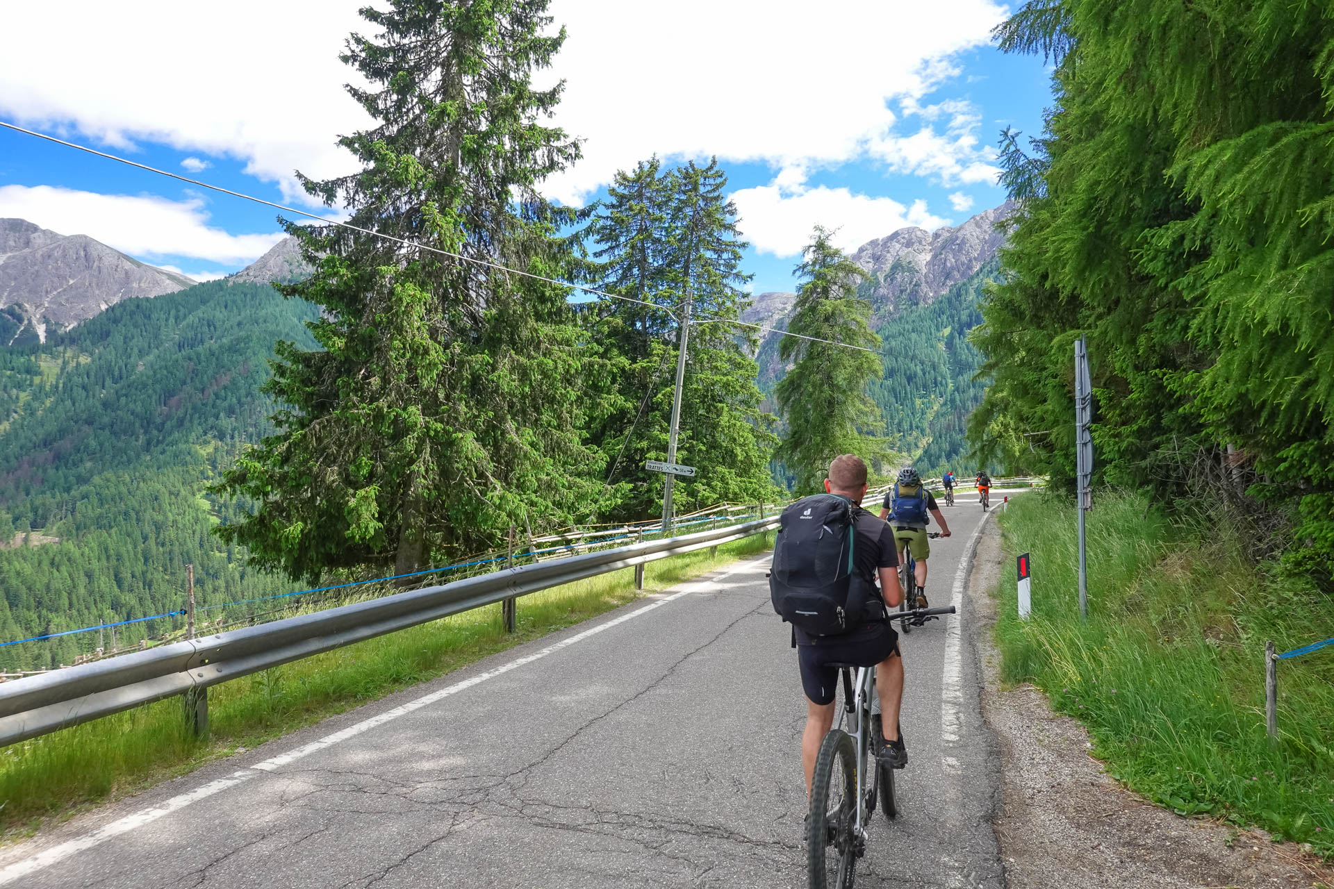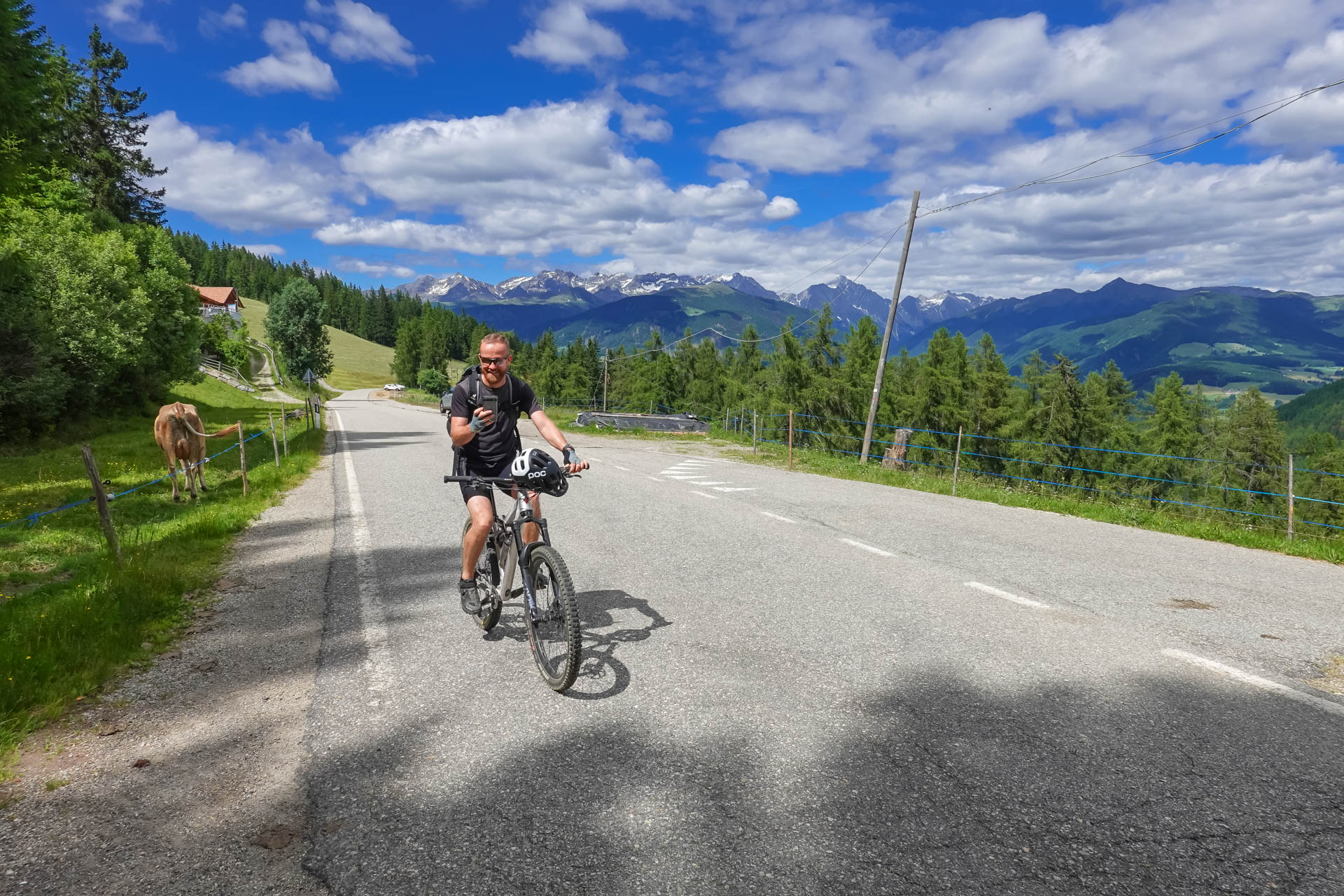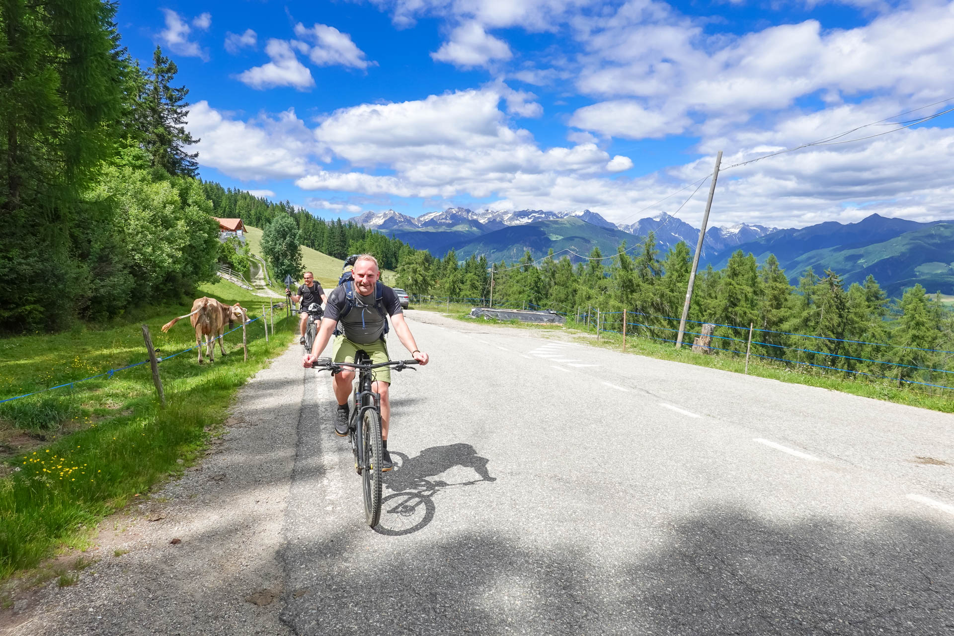 Der Weg führt uns weiter auf eine Straße, die uns die ersten 200 Höhenmeter hinaufführt. Kurz vor einem Schotterweg entdecken wir einen Aussichtspunkt. Ein lebensgroßer „Tiroler Standschütze“ steht dort auf einer kleinen Plattform, daneben eine Schautafel, die uns einen Einblick in die Geschichte und die Bedeutung dieses Symbols gewährt. Wir machen einige Fotos, gönnen uns eine kurze Pause und setzen dann unsere Fahrt fort. Es folgt ein gut befahrbarer Schotterweg und ein kleiner Trail über Almwiesen, bis wir schließlich in Mühlbach ankommen.