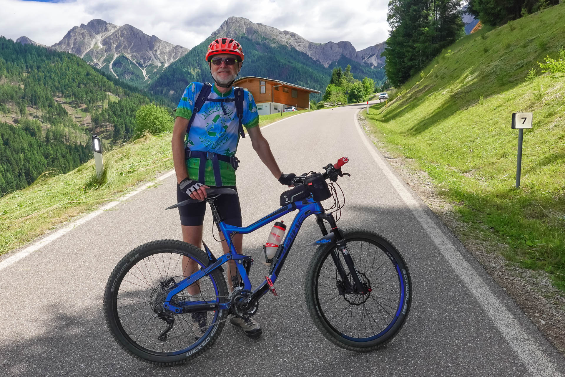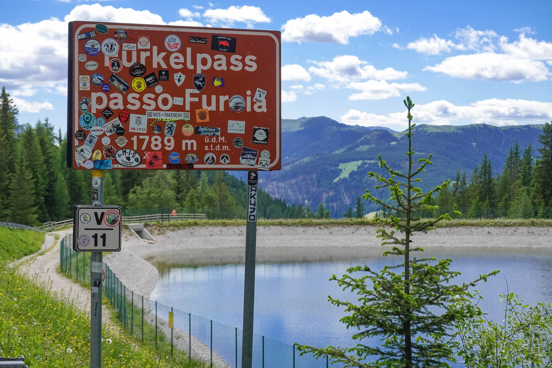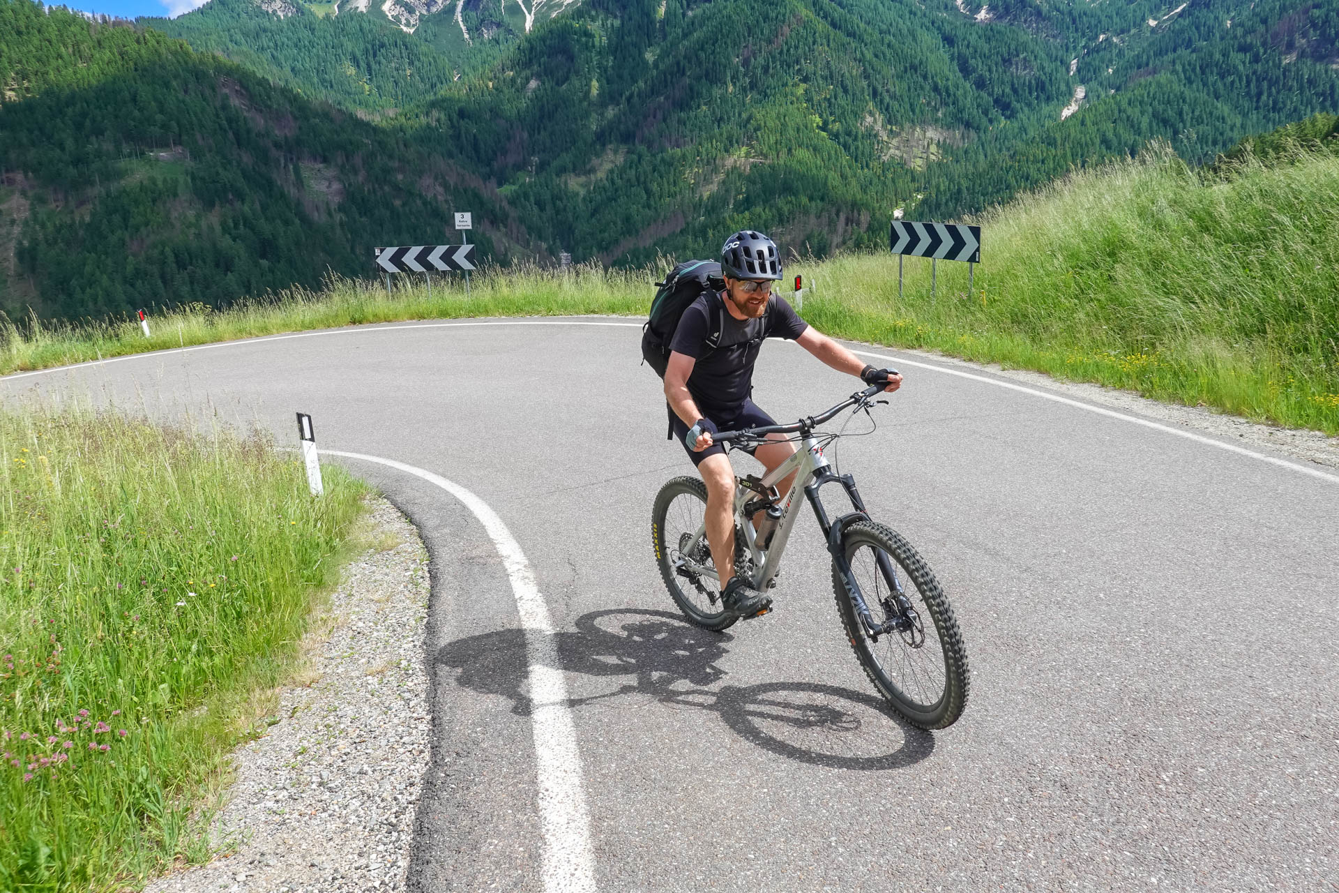 Jetzt geht es aber erst bergauf, diesmal auf Asphalt. 4,1 Kilometer und 410 Höhenmeter bringen uns zum Furkelpass. Die 10% Steigung fordern uns in der Mittagssonne, aber die wunderschöne Landschaft um uns herum entschädigt uns für die Anstrengung. Schließlich erreichen wir sehnsüchtig das Passschild auf 1.789 Metern, machen dort ein Beweisfoto und freuen uns auf die Abfahrt. Ein leicht schottriger Weg mit den Schwierigkeitsgraden S1-S2 führt uns auf 1.550 Meter hinab, dann wechseln wir zwischen kleinen Asphaltstraßen und Waldwegen. Ursprünglich wollten wir einen kleinen Trail ins Tal fahren, aber er war so verblockt und mit alten Ästen versehen, dass wir kurzerhand umdrehten und auf der Schotterpiste ins Tal fuhren.