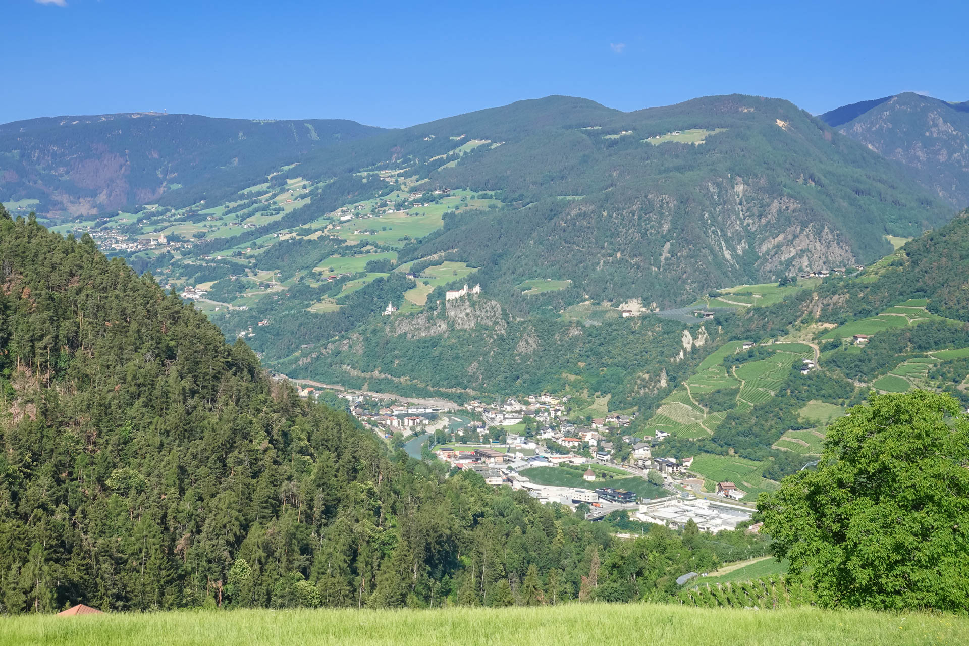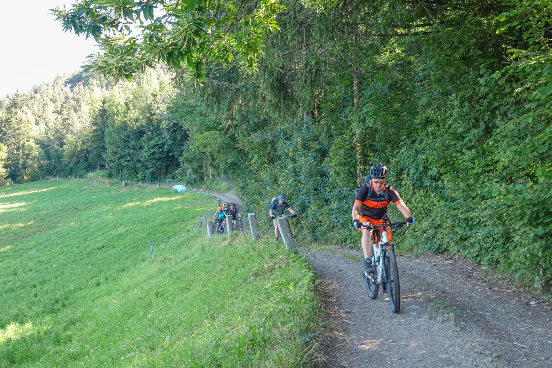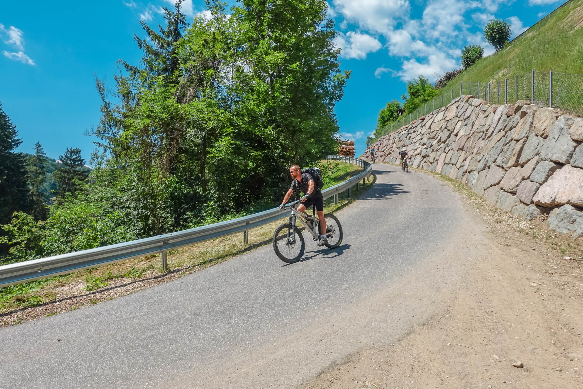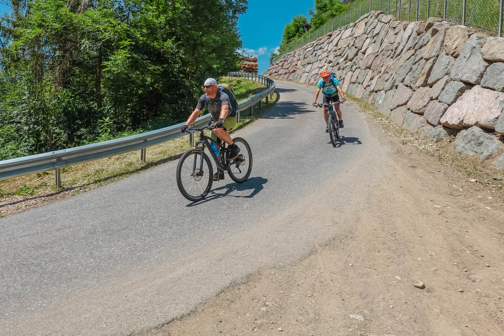 In Gudo führt uns die Route von der Straße auf einen Wanderweg, der sich zu einem aufregenden Pfad entwickelt, der ständig auf und ab verläuft. Das Radfahren macht hier besonders viel Spaß, auch wenn die Temperaturen bereits morgens 27 Grad erreichen. Glücklicherweise führt uns der Großteil der Strecke aktuell durch schattigen Wald, was die Hitze erträglicher macht. Doch als wir die Waldfläche verlassen und am Hang entlangfahren, sind wir mitten in der Sonne, während wir hinab ins Tal und auf den Ort Klausen blicken.