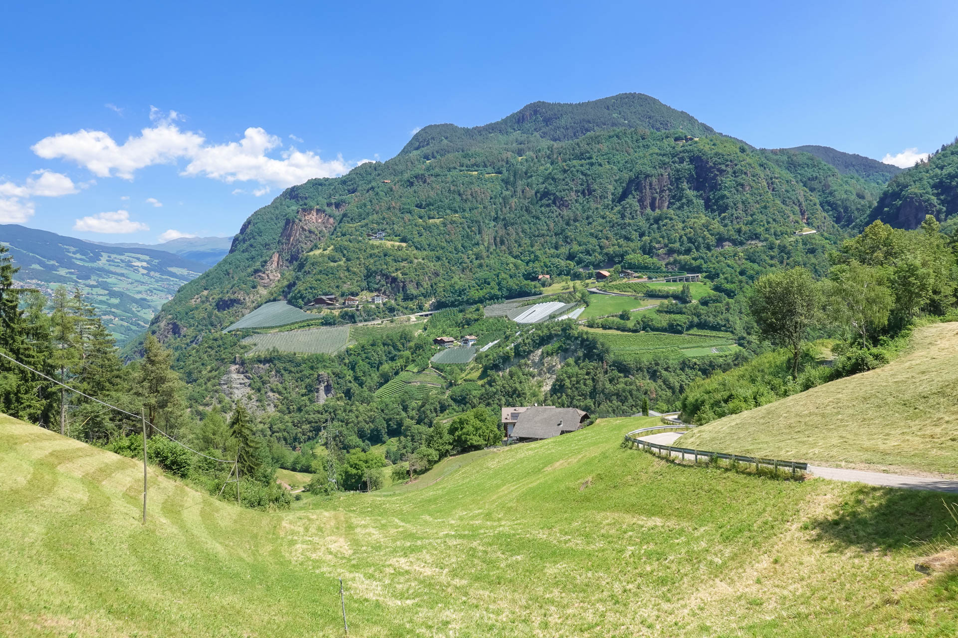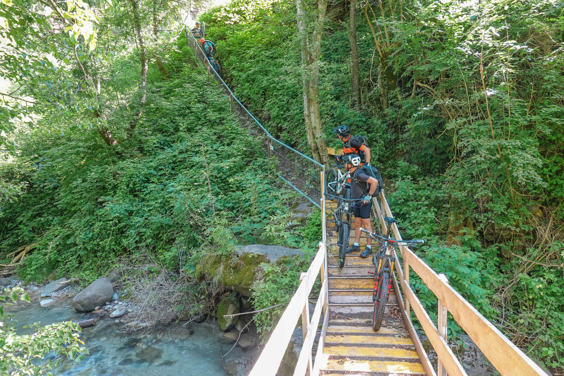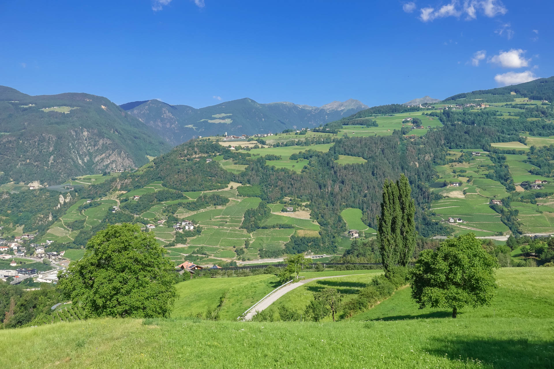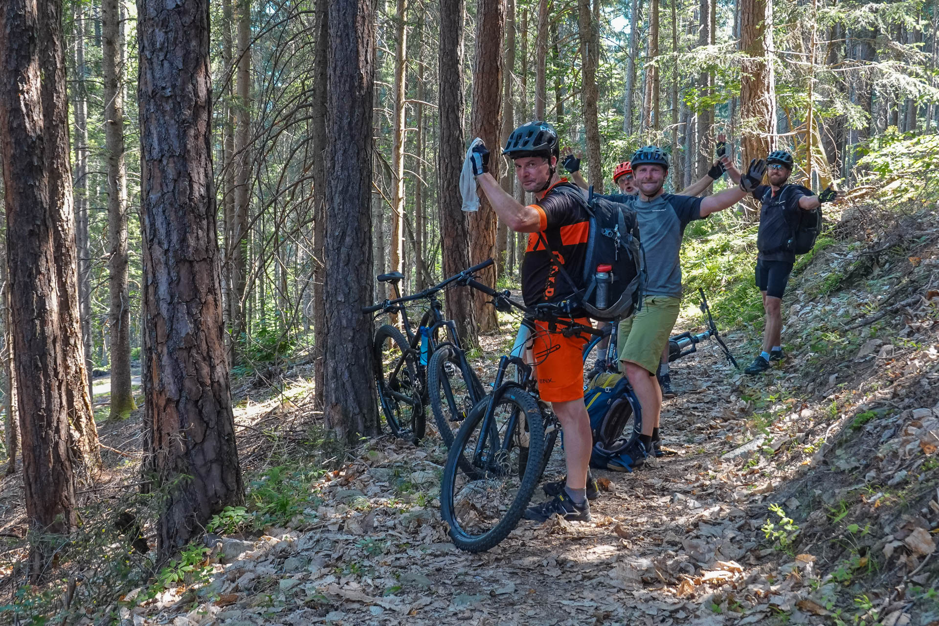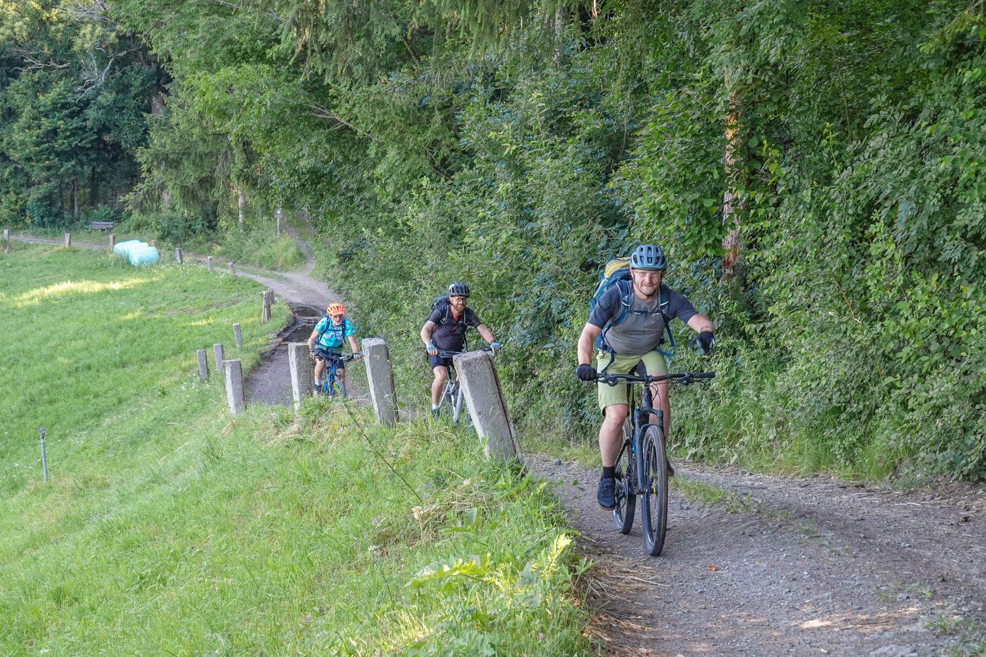 In Gudo führt uns die Route von der Straße auf einen Wanderweg, der sich zu einem aufregenden Pfad entwickelt, der ständig auf und ab verläuft. Das Radfahren macht hier besonders viel Spaß, auch wenn die Temperaturen bereits morgens 27 Grad erreichen. Glücklicherweise führt uns der Großteil der Strecke aktuell durch schattigen Wald, was die Hitze erträglicher macht. Doch als wir die Waldfläche verlassen und am Hang entlangfahren, sind wir mitten in der Sonne, während wir hinab ins Tal und auf den Ort Klausen blicken.