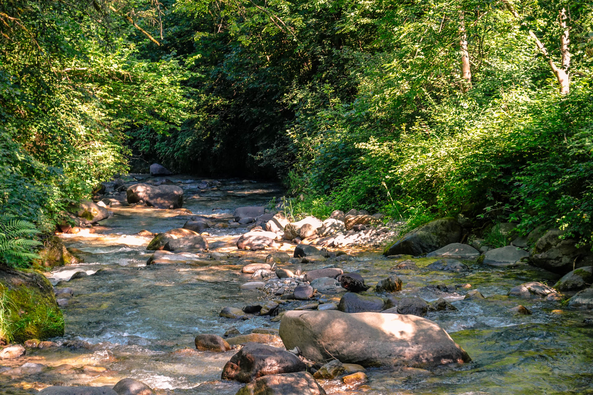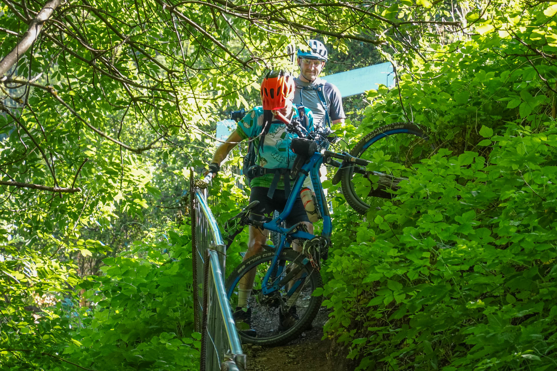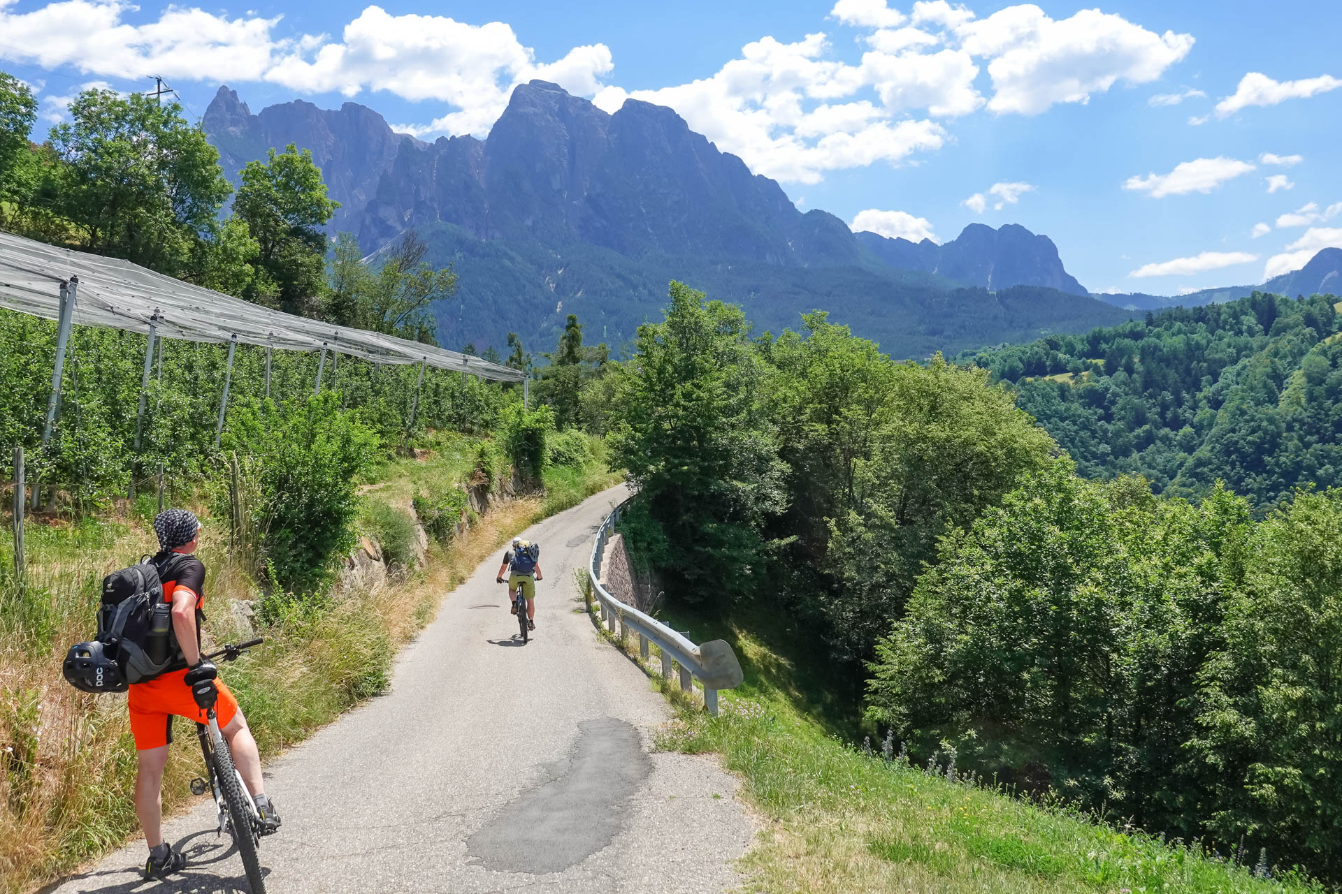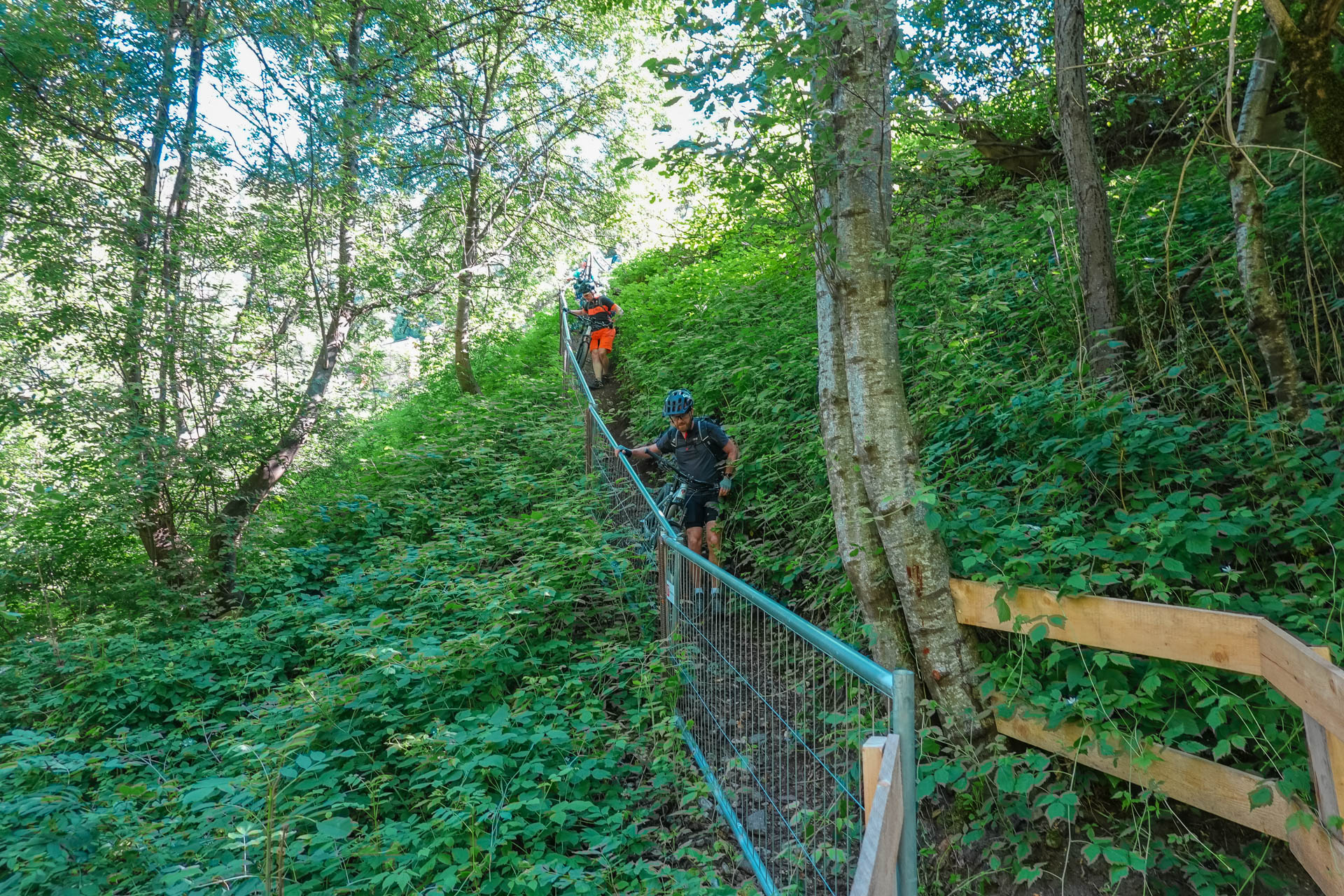 In Gudo führt uns die Route von der Straße auf einen Wanderweg, der sich zu einem aufregenden Pfad entwickelt, der ständig auf und ab verläuft. Das Radfahren macht hier besonders viel Spaß, auch wenn die Temperaturen bereits morgens 27 Grad erreichen. Glücklicherweise führt uns der Großteil der Strecke aktuell durch schattigen Wald, was die Hitze erträglicher macht. Doch als wir die Waldfläche verlassen und am Hang entlangfahren, sind wir mitten in der Sonne, während wir hinab ins Tal und auf den Ort Klausen blicken.