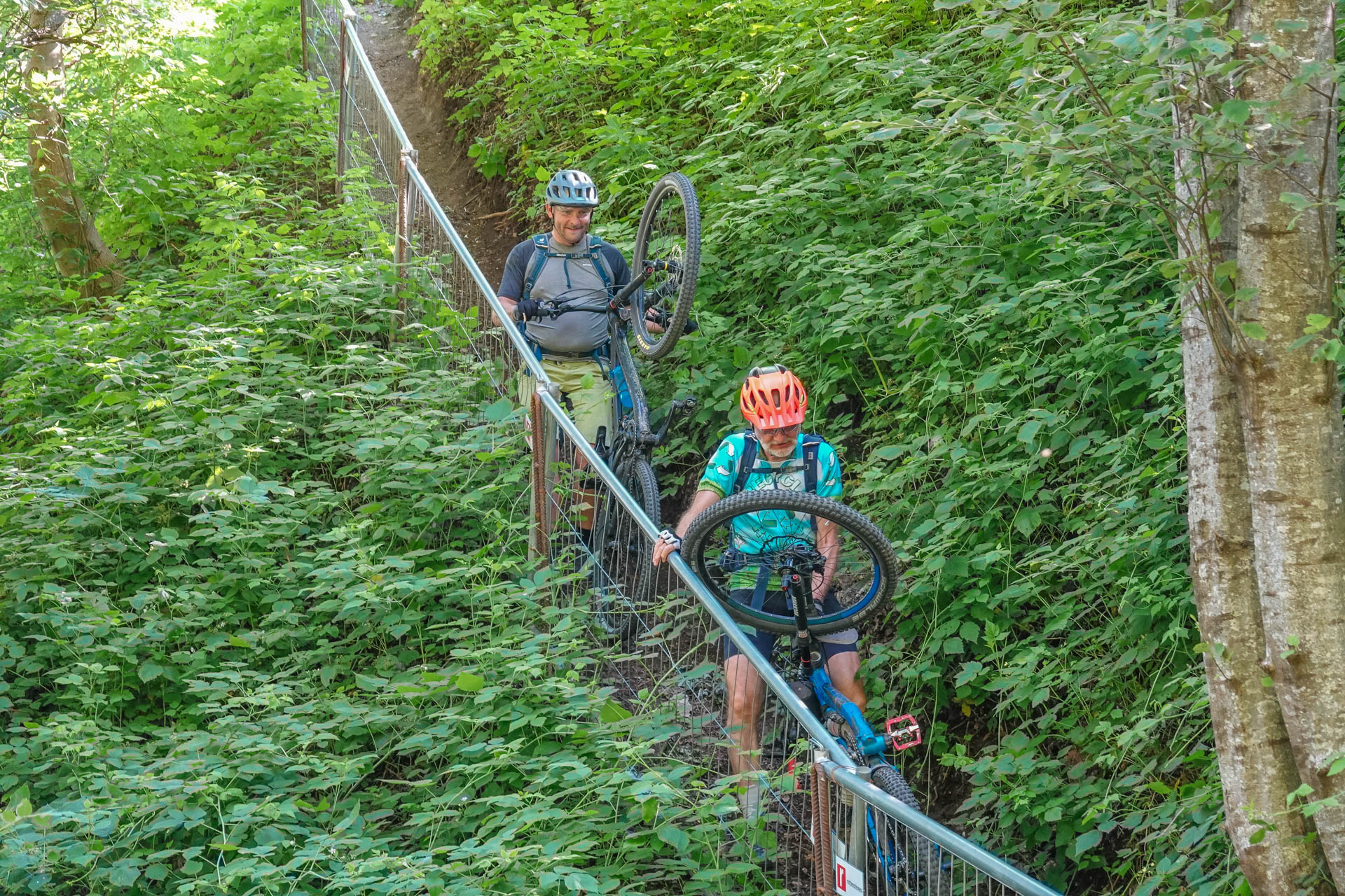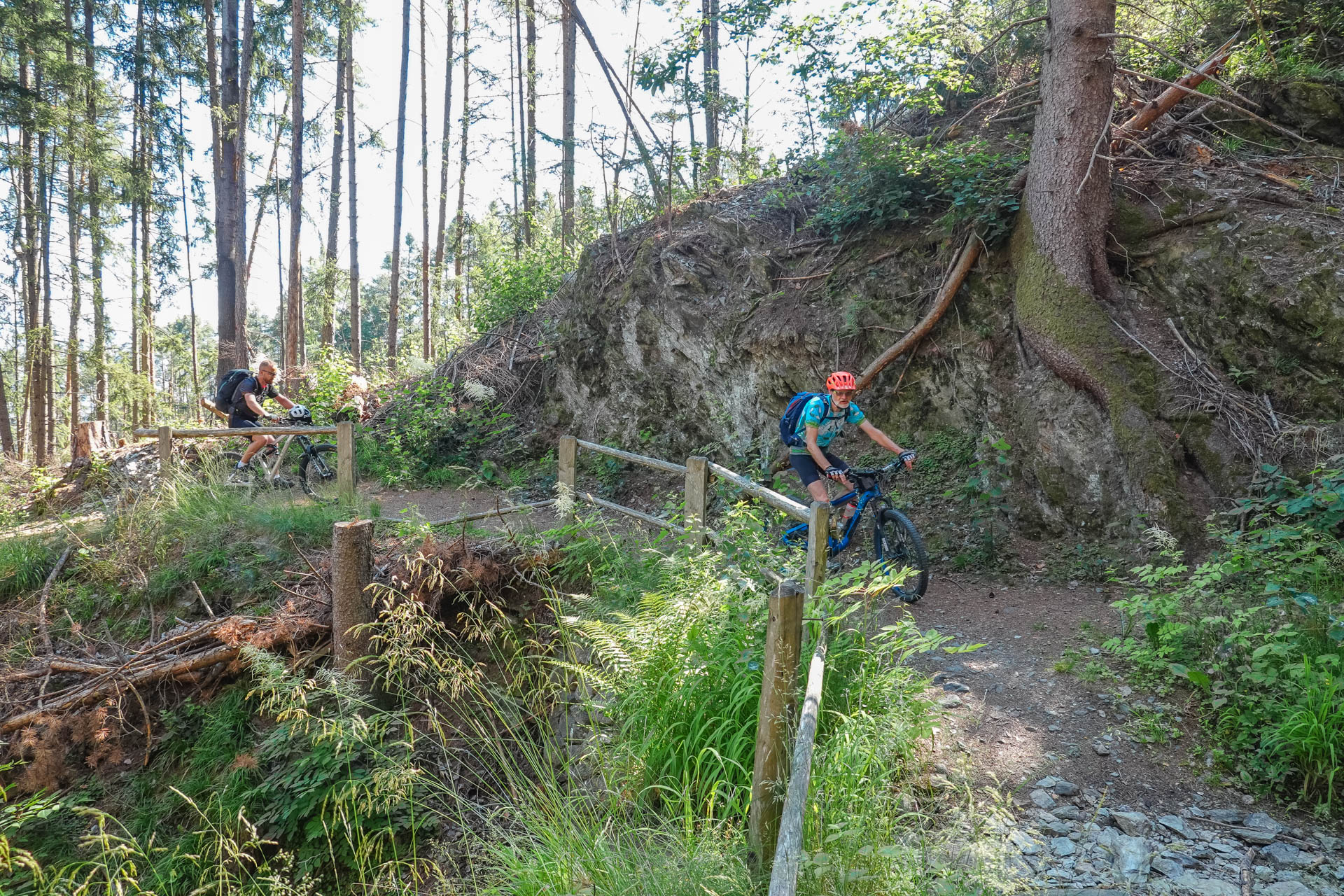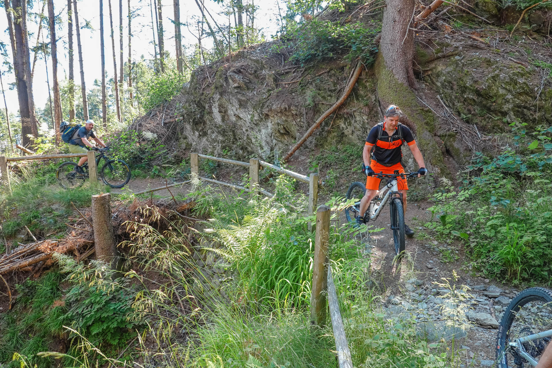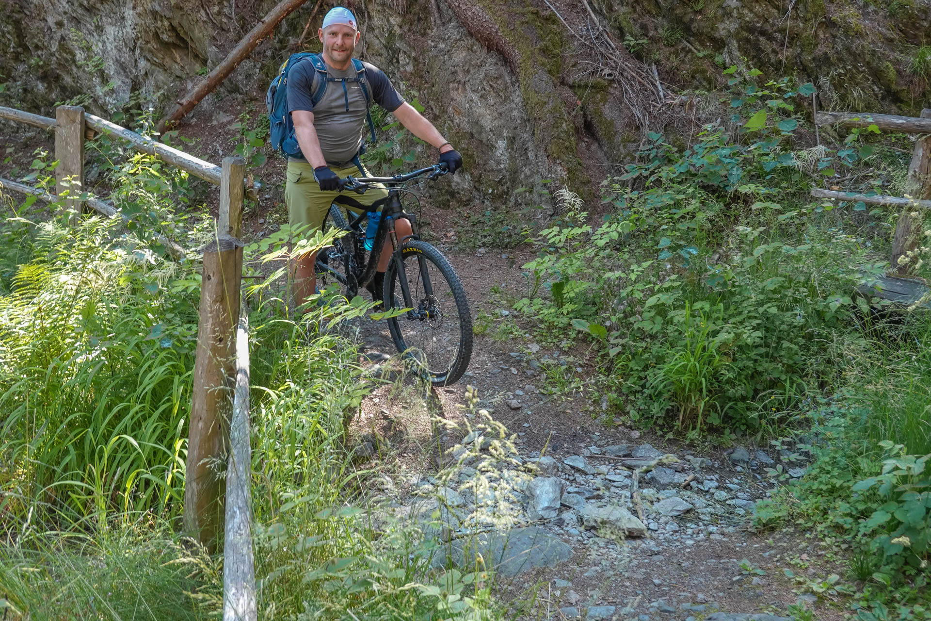 Am Morgen die Sonne zu genießen und den Wind bei einer erfrischenden Abfahrt zu spüren, ohne dabei viel Anstrengung aufbringen zu müssen, ist einfach herrlich. Die Strecke führt zunächst auf Schotter und dann auf einer kleinen Nebenstraße entlang des idyllischen Gehöfts Außermühl. Eine Brücke ist gesperrt, aber wir finden problemlos eine Umleitung auf einem kleinen Pfad, der uns über einen Bach führt. Die Behelfsbrücke aus Holz sorgt für ein abenteuerliches Gefühl und wir wissen nun, dass auf dieser Straße uns keine Autos entgegen kommen, geschweige denn überholen.