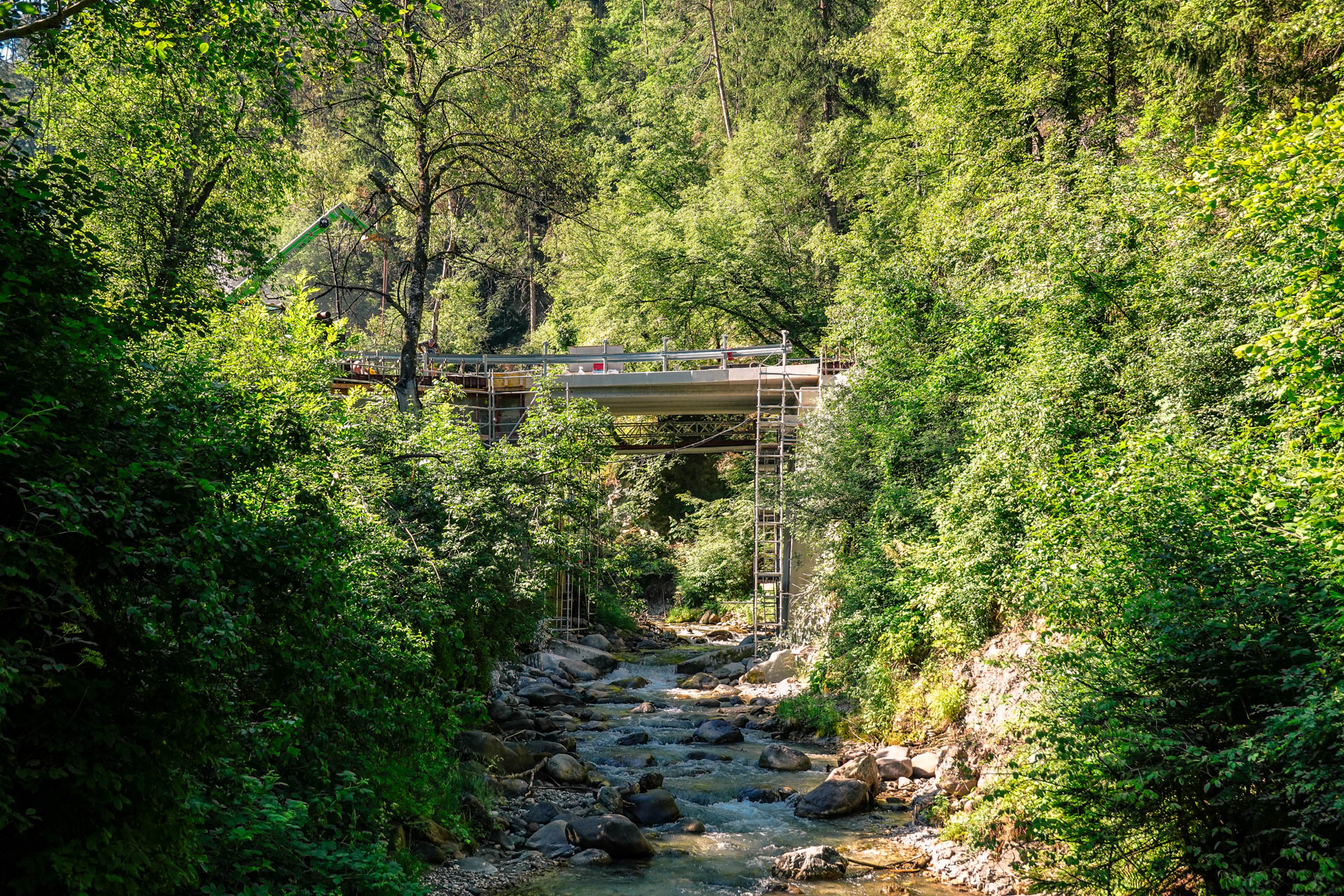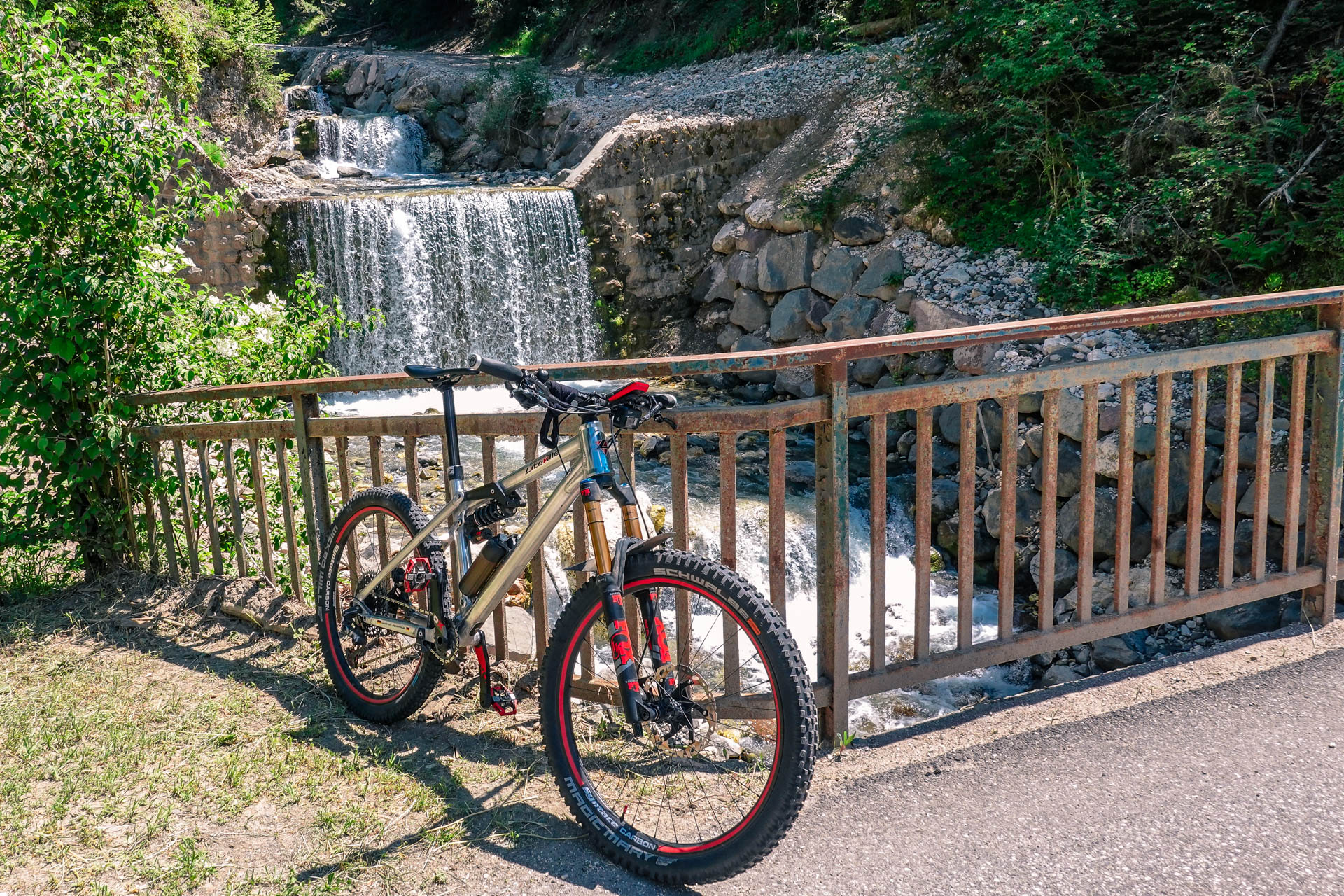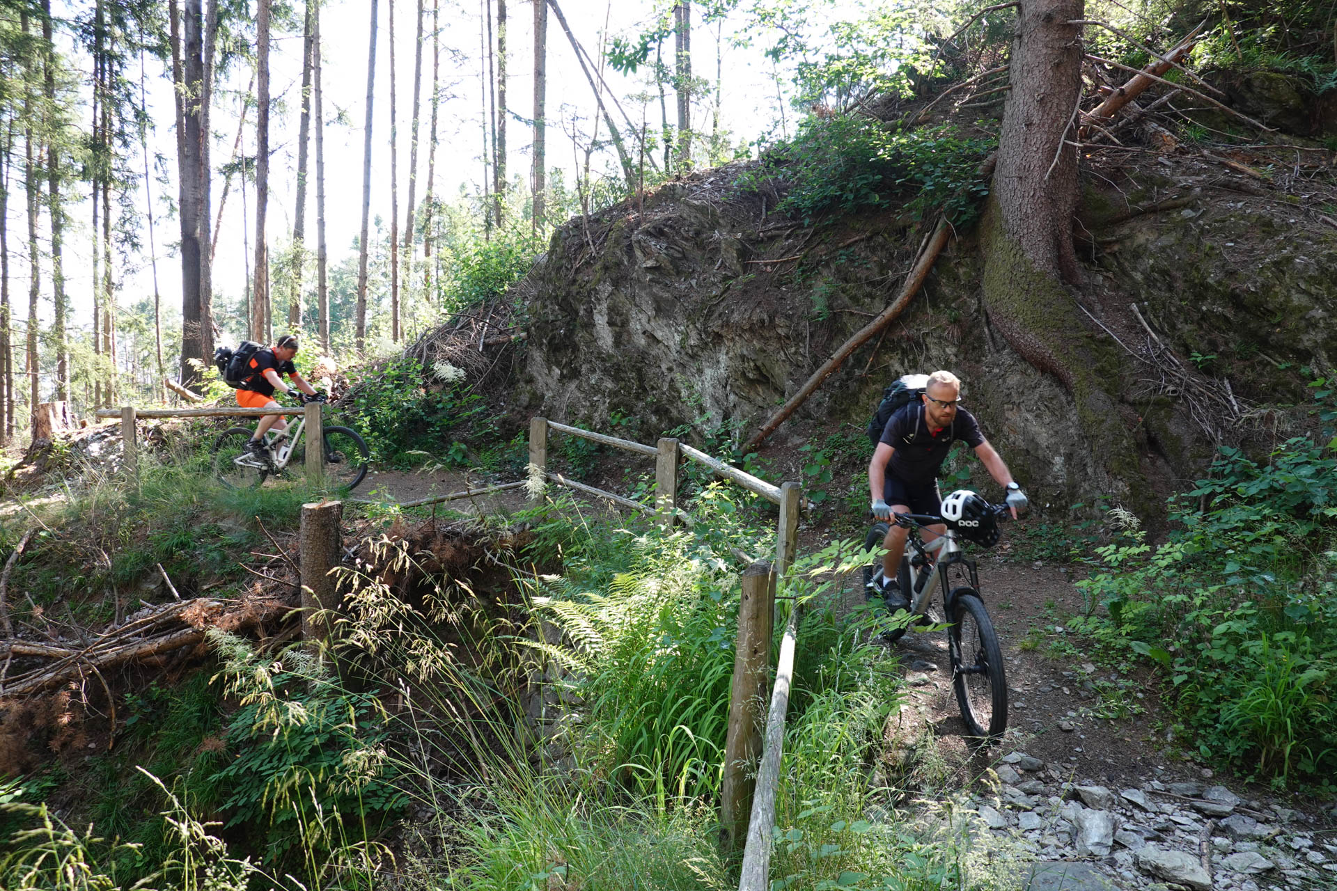 Am Morgen die Sonne zu genießen und den Wind bei einer erfrischenden Abfahrt zu spüren, ohne dabei viel Anstrengung aufbringen zu müssen, ist einfach herrlich. Die Strecke führt zunächst auf Schotter und dann auf einer kleinen Nebenstraße entlang des idyllischen Gehöfts Außermühl. Eine Brücke ist gesperrt, aber wir finden problemlos eine Umleitung auf einem kleinen Pfad, der uns über einen Bach führt. Die Behelfsbrücke aus Holz sorgt für ein abenteuerliches Gefühl und wir wissen nun, dass auf dieser Straße uns keine Autos entgegen kommen, geschweige denn überholen.