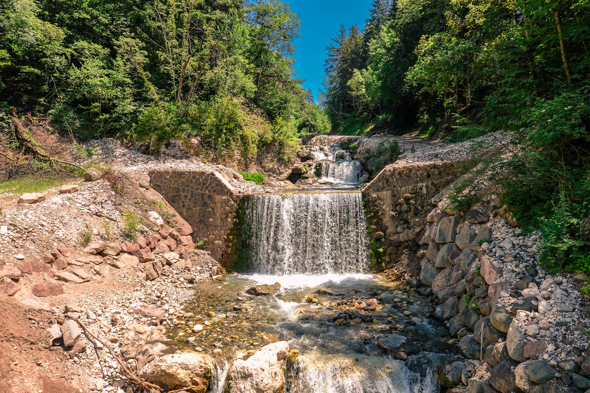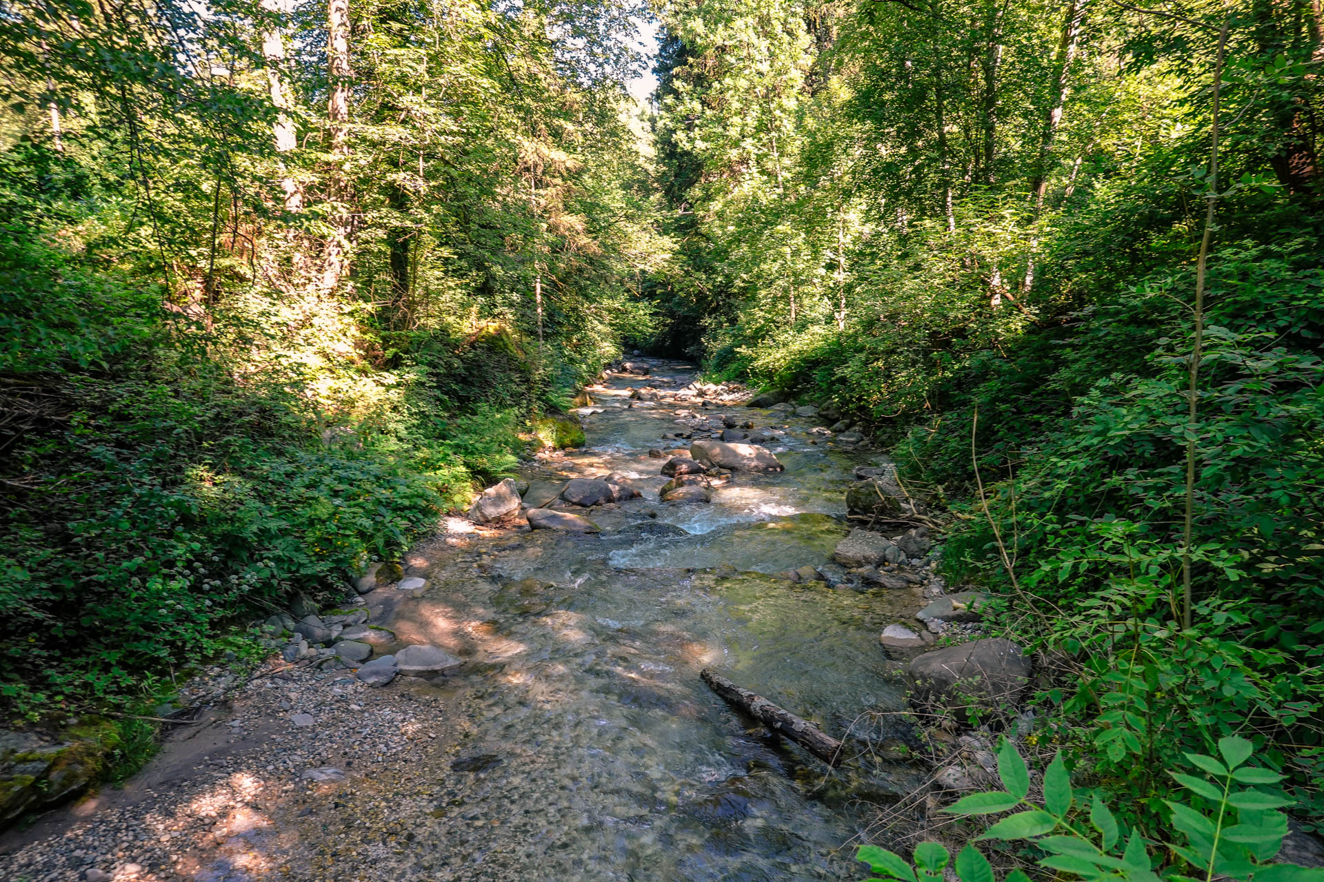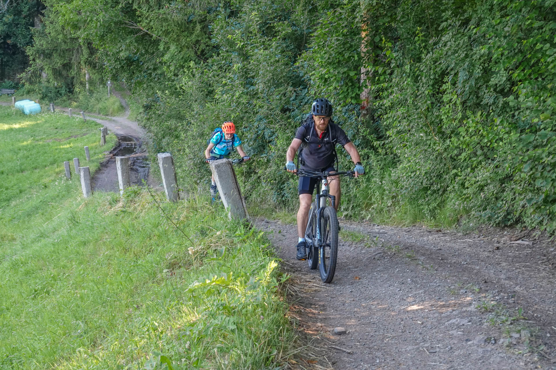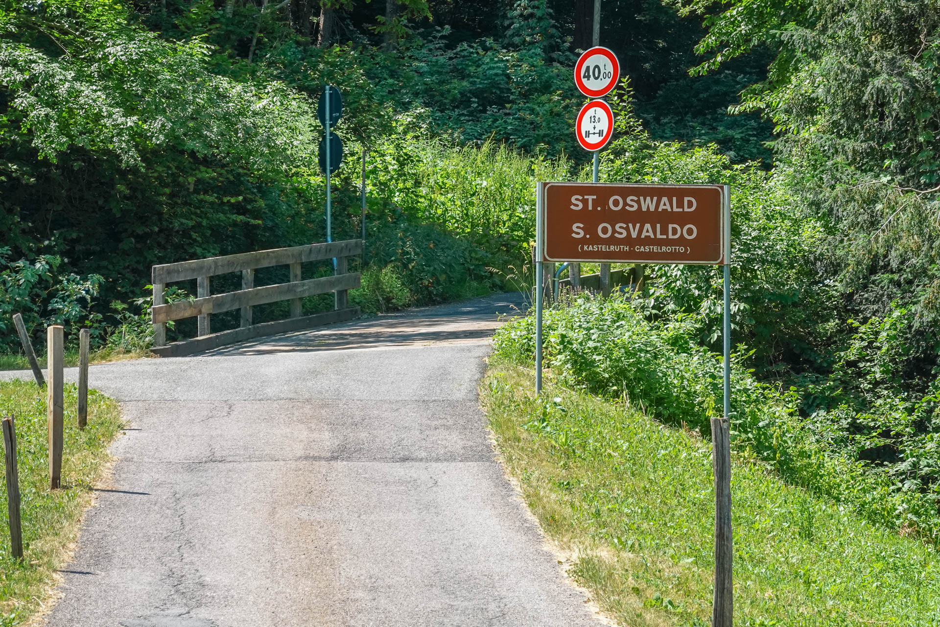 Am Morgen die Sonne zu genießen und den Wind bei einer erfrischenden Abfahrt zu spüren, ohne dabei viel Anstrengung aufbringen zu müssen, ist einfach herrlich. Die Strecke führt zunächst auf Schotter und dann auf einer kleinen Nebenstraße entlang des idyllischen Gehöfts Außermühl. Eine Brücke ist gesperrt, aber wir finden problemlos eine Umleitung auf einem kleinen Pfad, der uns über einen Bach führt. Die Behelfsbrücke aus Holz sorgt für ein abenteuerliches Gefühl und wir wissen nun, dass auf dieser Straße uns keine Autos entgegen kommen, geschweige denn überholen.