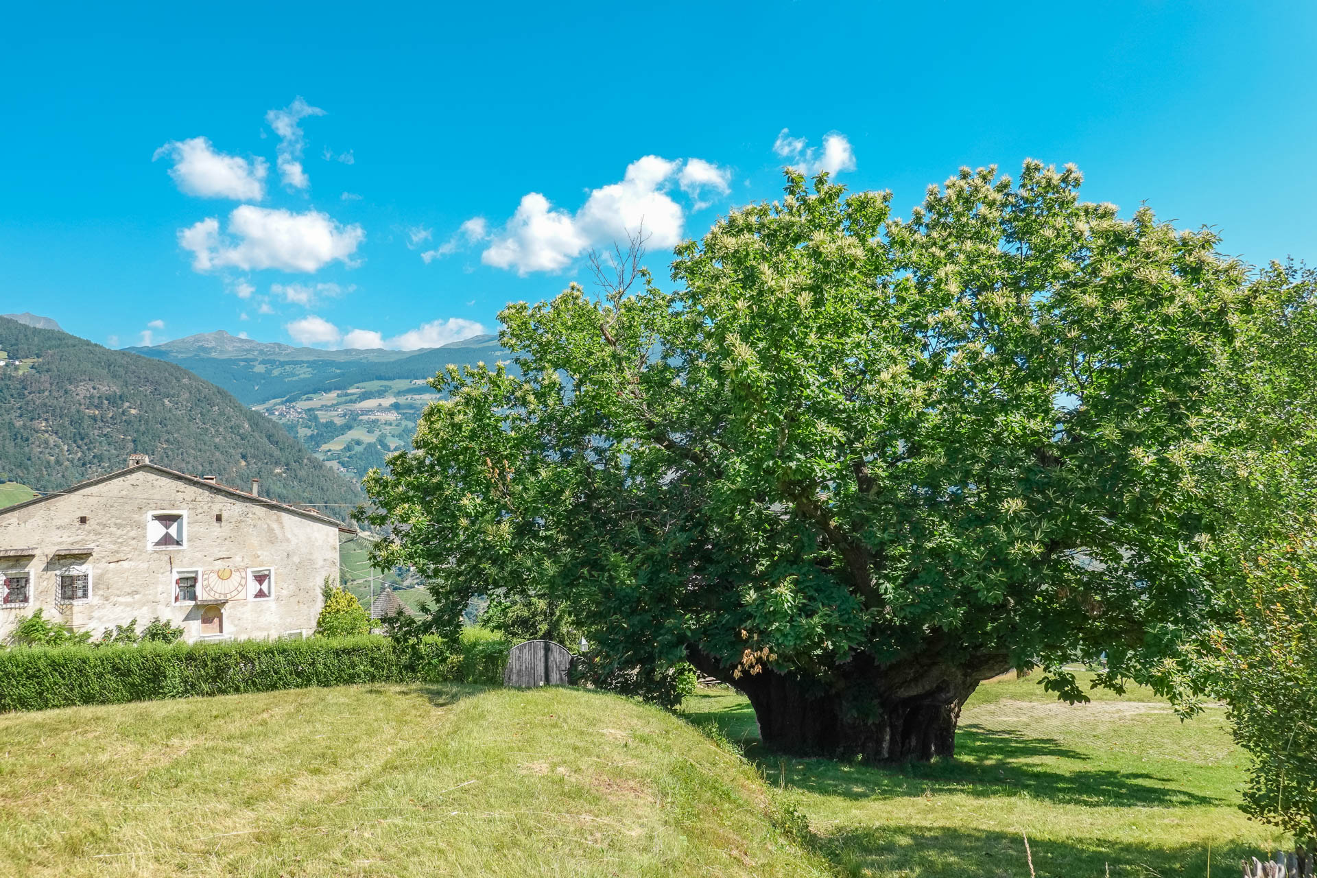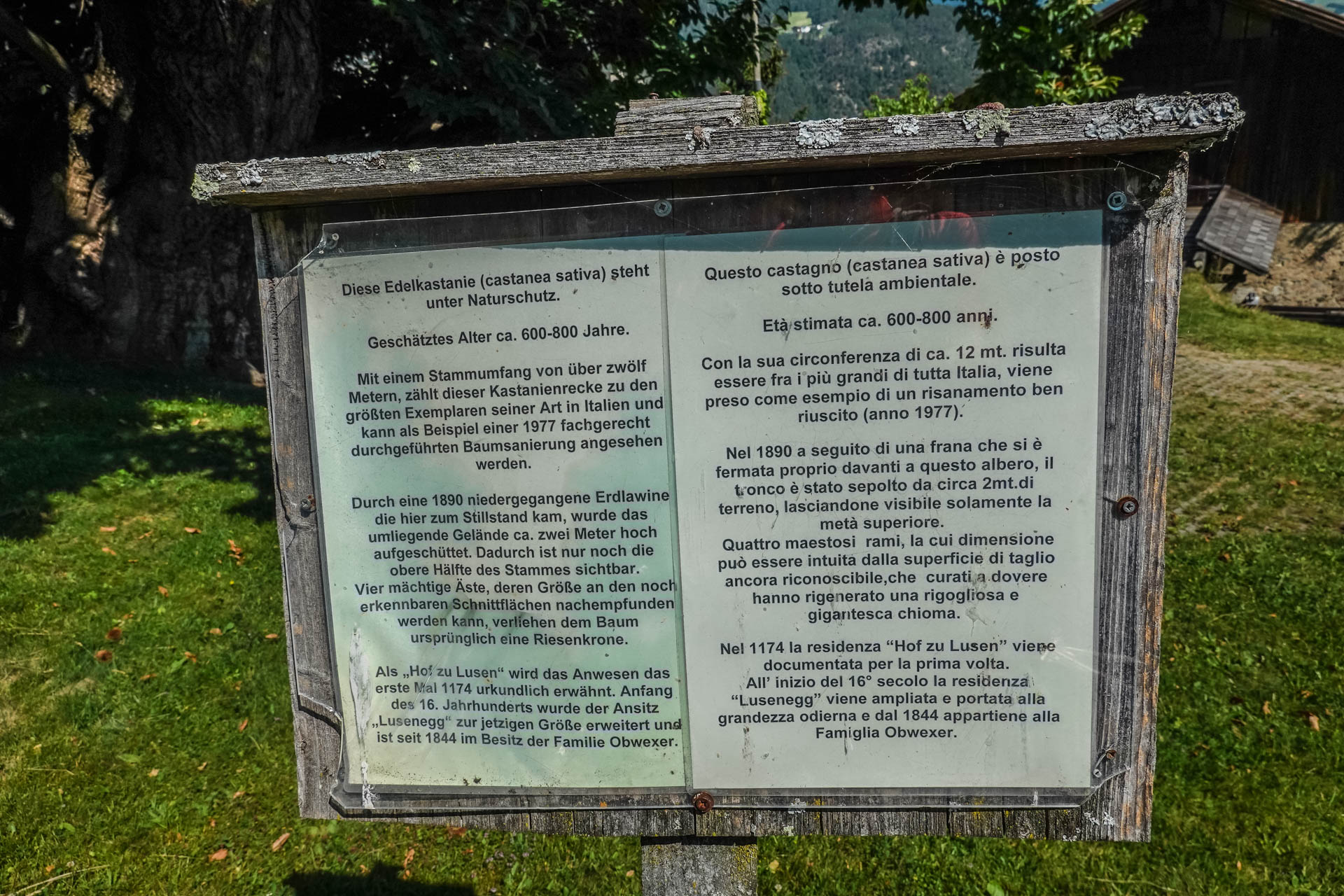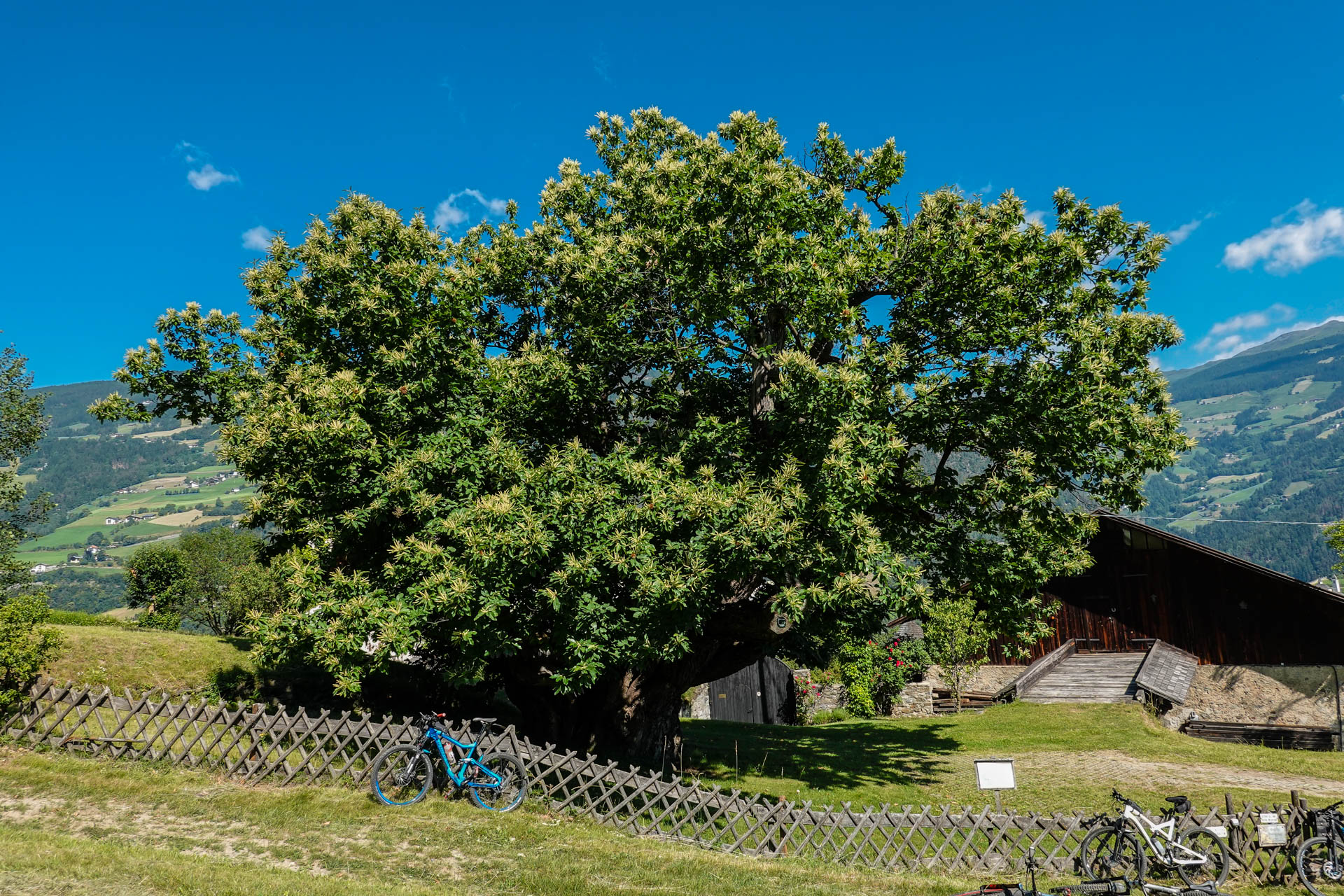 Beim Ansitz Lusenegg in Lajen treffen wir auf Europas größten Kastanienbaum. Mit einem Umfang von 13,30 Meter und einem Alter von 600-800 Jahren steht der Baum sehr stattlich vor uns. Beeindruckt von seiner Größe und majestätischen Erscheinung machen wir einige Fotos und genießen die Ruhe inmitten der Natur, bevor wir auf kleinen Wegen und Straßen nach Waidbruck weiterfahren. Dort legen wir an einem Supermarkt eine Rast ein, kaufen uns kalte Getränke und Snacks, um uns für die bevorstehenden 650 Höhenmeter am Stück zu stärken.