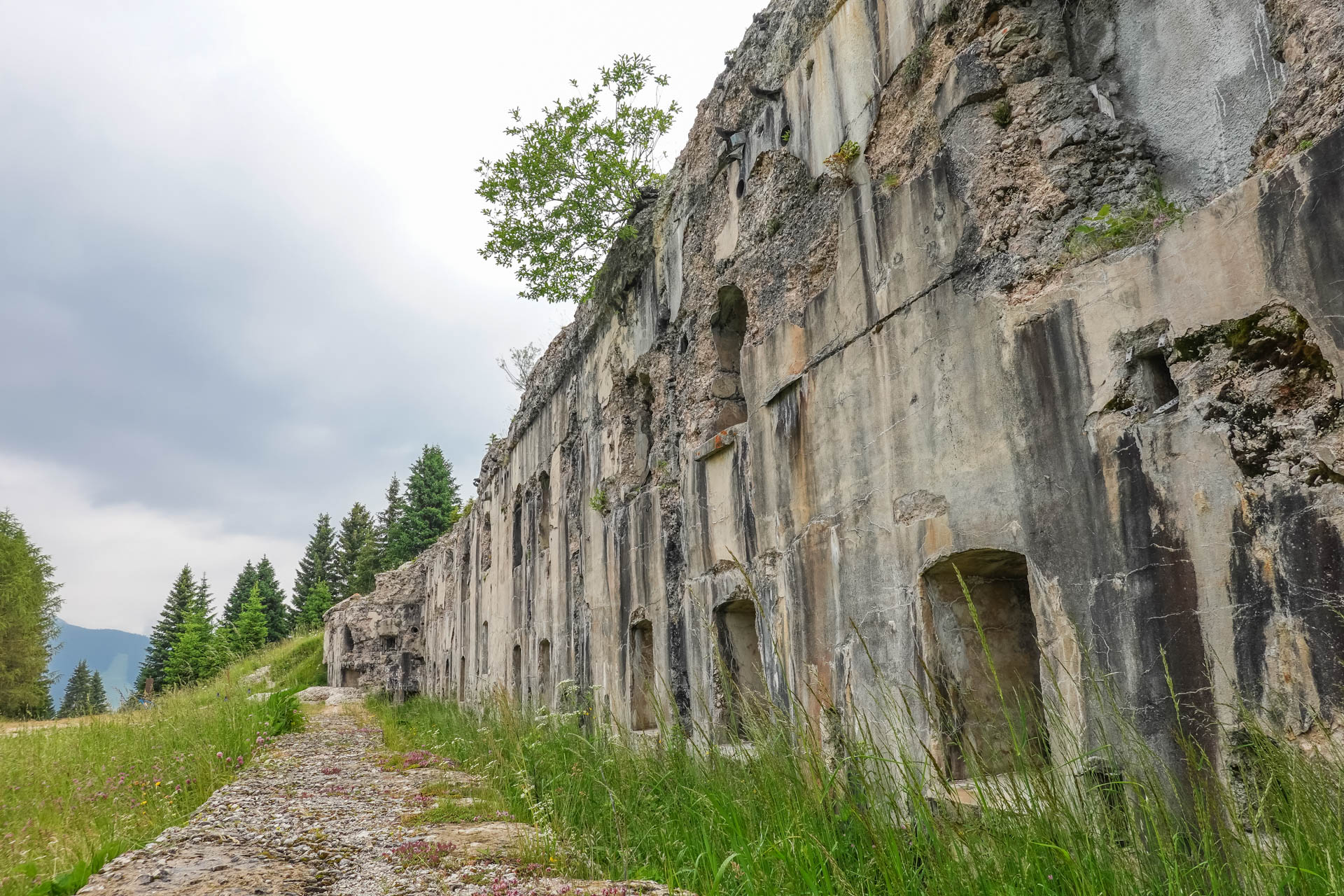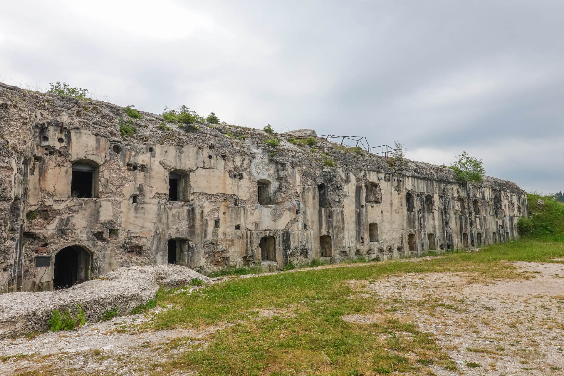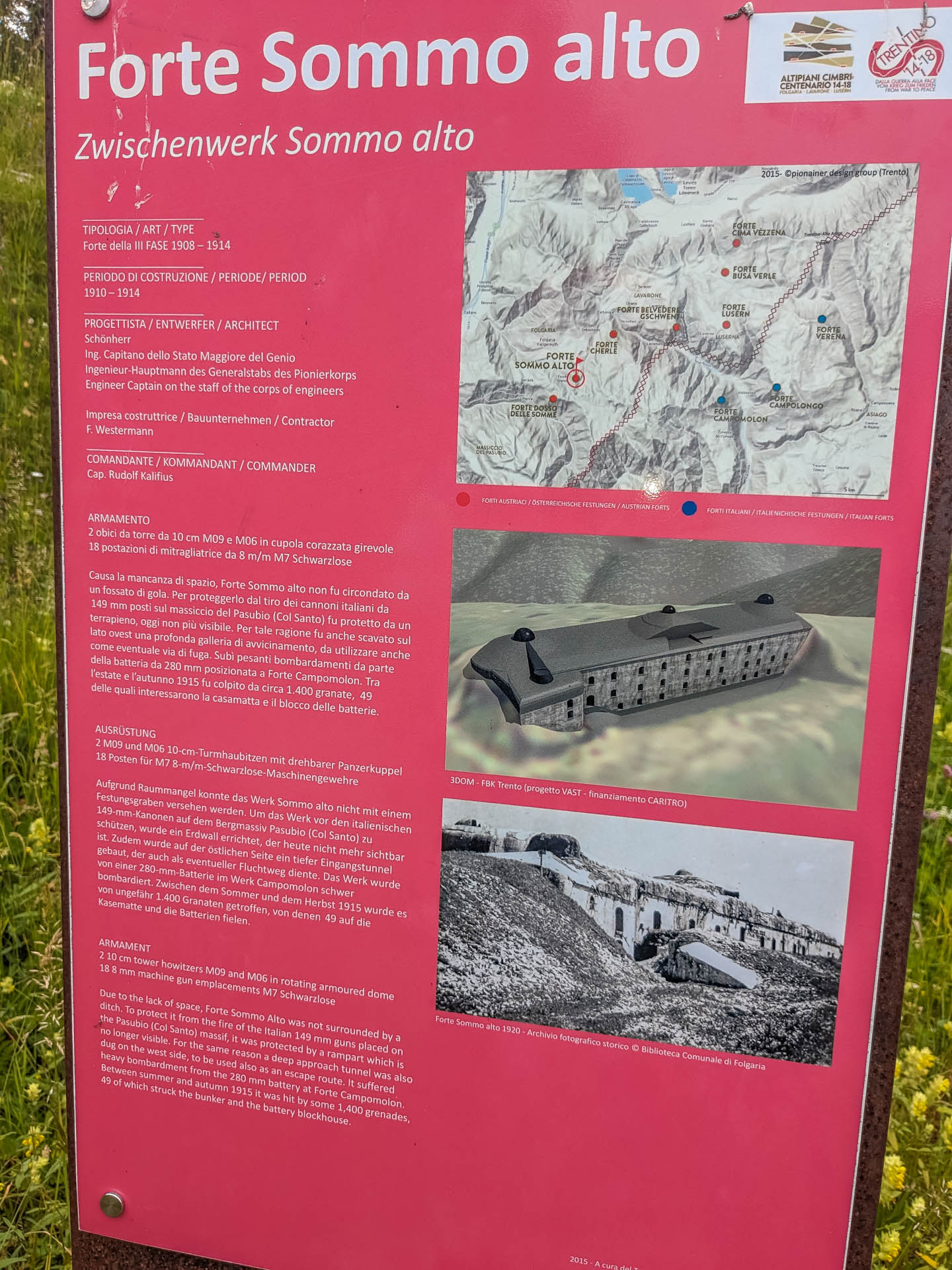 Zitat: „Zwischenwerk Sommo“ genannt, wurde diese Festung zwischen 1911 und 1914 auf dem gleichnamigen Hügel auf 1613 m Höhe erbaut. Auf drei Etagen angeordnet, war sie mit zwei 10 cm Haubitzen in einer gepanzerten Kuppel und einem Aussichtsturm ausgestattet. Die Nahverteidigung wurde stattdessen 18 Maschinengewehrpositionen anvertraut. Als befestigte Kaserne konzipiert, wurde sie später in eine echte Festung verwandelt. Ohne Graben, aber durch einen Erdwall geschützt, kontrollierte er die Furche unterhalb des Orsara-Tals und in Absprache mit dem nahegelegenen Forte Dosso delle Somme den Passo Coe. Es war mit vier fortschrittlichen gepanzerten Stationen ausgestattet, die durch zwei lange unterirdische Tunnel mit der zentralen Instanz verbunden waren, die noch genutzt werden können.
