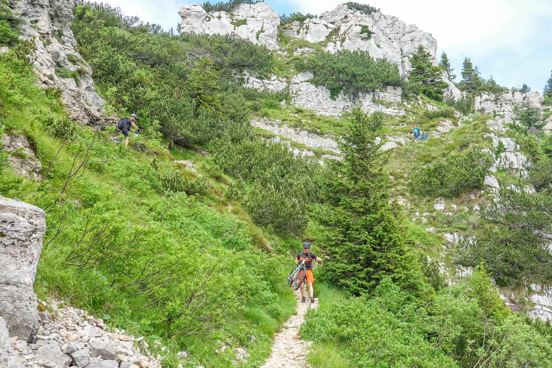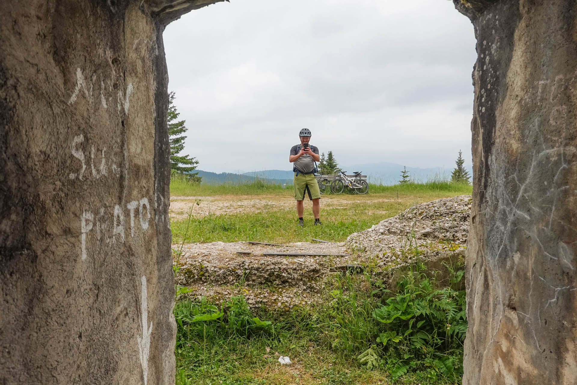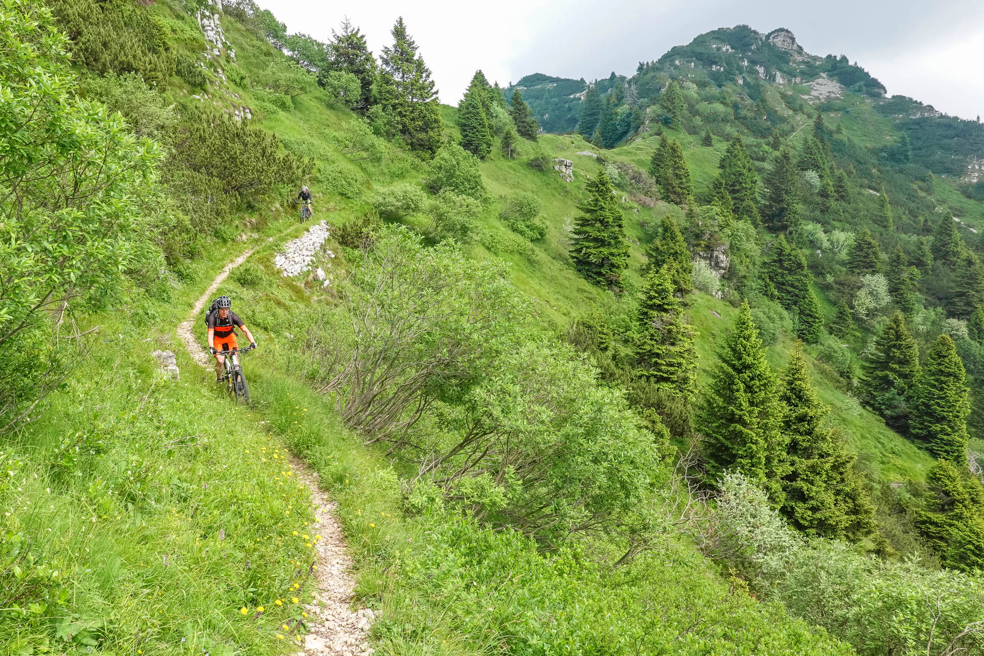 Als der Weg in den Wald führt, ist es immer noch steil und rutschig durch das viele Laub, aber es wird deutlich fahrbarer. Je weiter wir hinunterkommen, desto flowiger wird der Weg. Wir staunen, als wir auf einen verlassenen Militär-LKW mitten im Wald stoßen, der einfach vor sich hin rostet. Nachdem wir ein paar spaßige Bilder gemacht haben, führt uns der Weg schließlich auf die Straße zum Passübergang Borcola auf 1.250 Meter Höhe. Somit haben wir vom „Eisernen Kreuz“ aus 11 Kilometer und 1.200 Höhenmeter bewältigt.