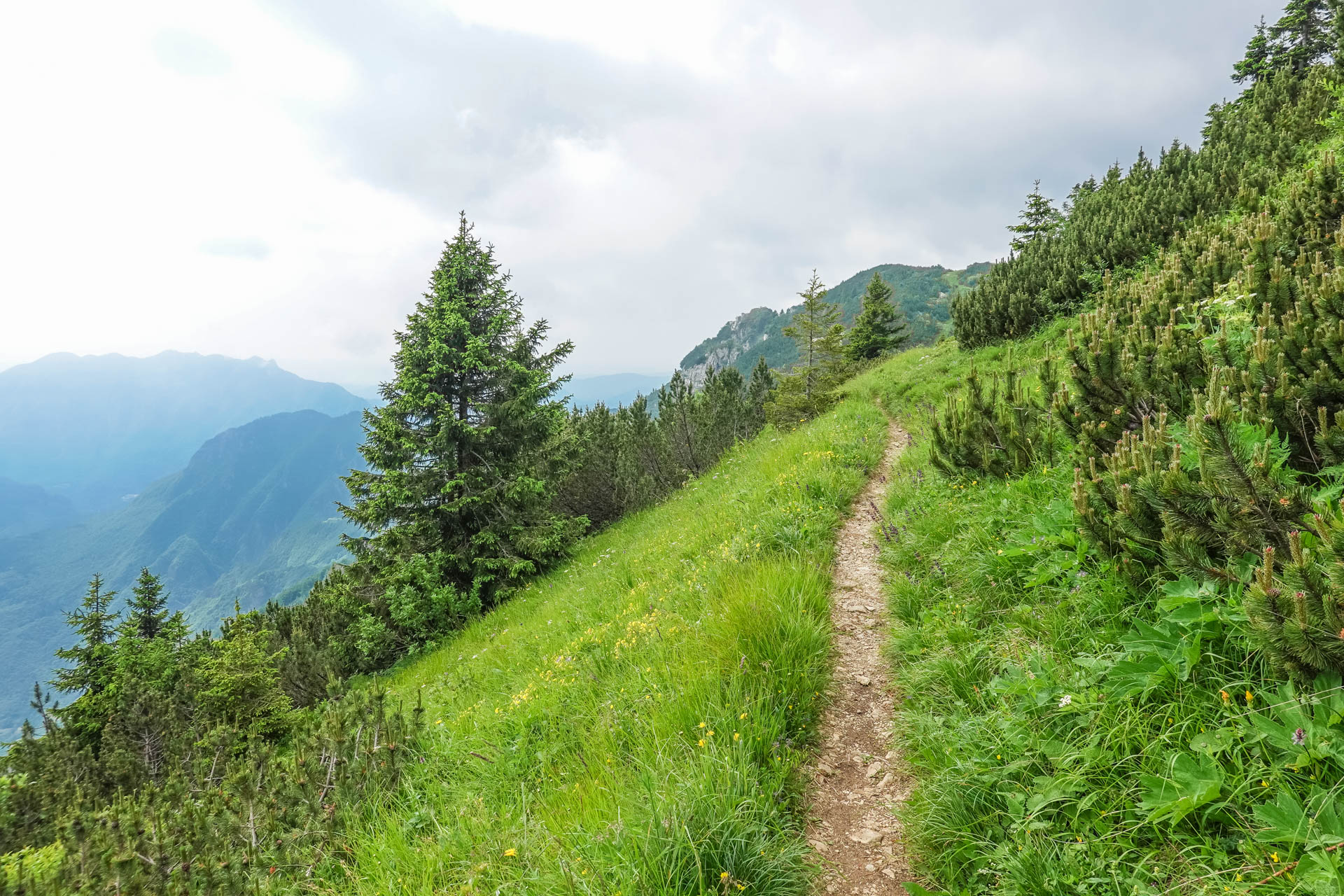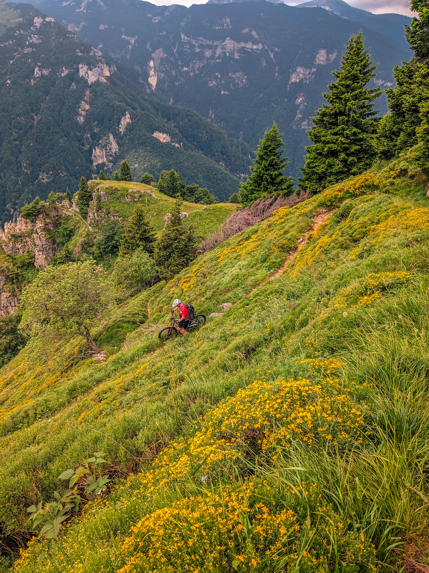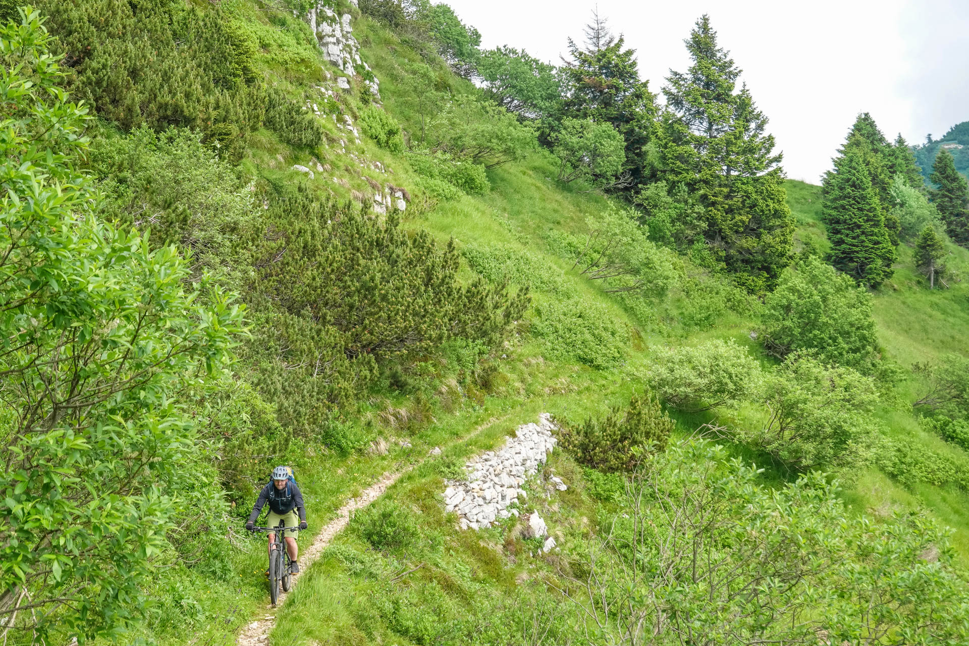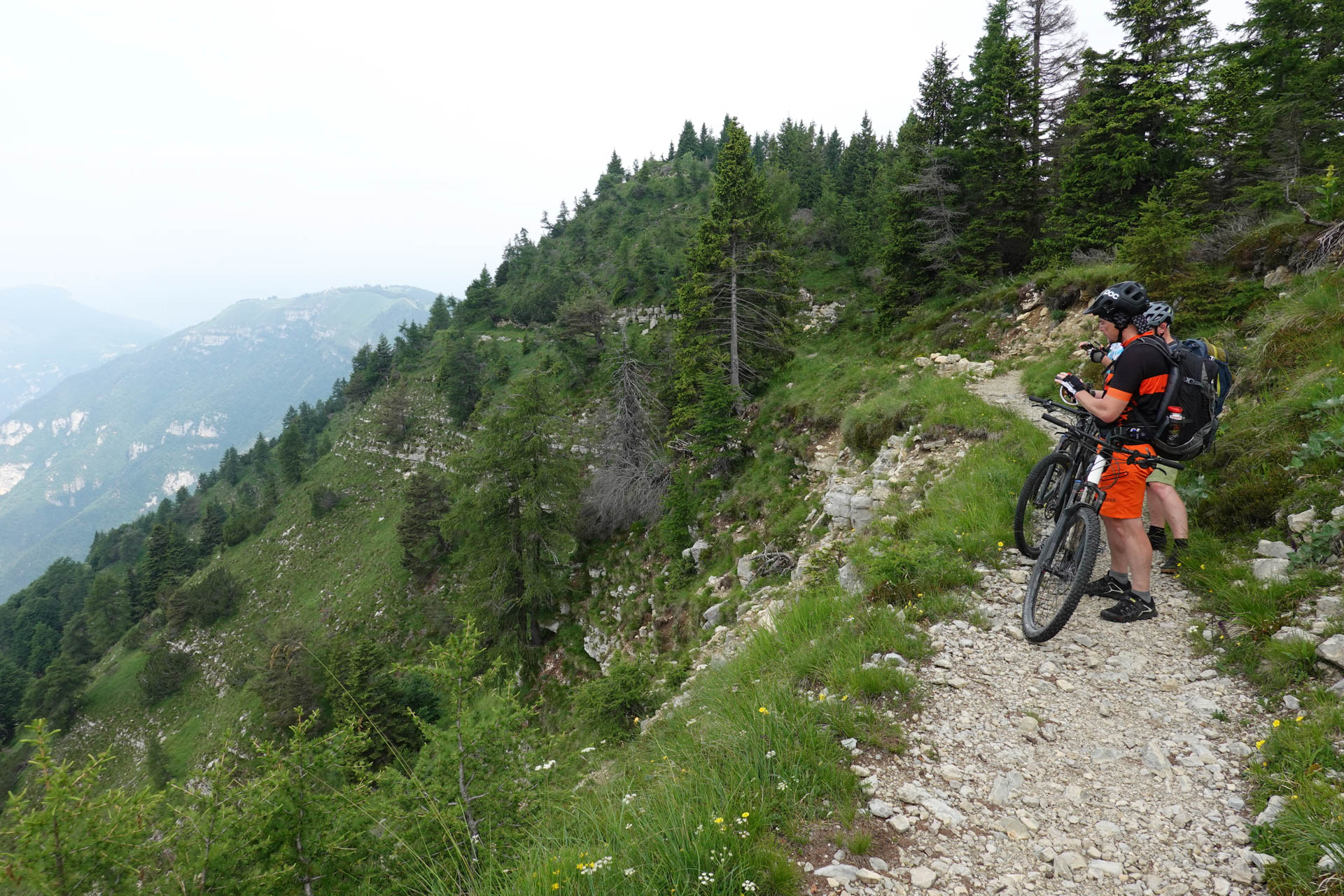 Der folgende Anstieg führt teilweise durch Skigebiete und wird dann schmaler und ausgesetzter. Auf insgesamt 6 Kilometern müssen wir 330 Höhenmeter überwinden. Klingt nicht dramatisch, aber die kleinen Rampen tun mittlerweile in den Beinen weh. Dennoch ist es herrlich hier. Der Weg verläuft am Steilhang entlang und ist mittlerweile zu einem Singletrail geworden. Wir befinden uns fast die ganze Zeit an der Kante, wo das Gelände steil ins Val Terragnolo abbricht, und die Aussicht begleitet uns die ganze Strecke über. Dieser Wegabschnitt gehört offiziell zum Sentiero della Pace, den grob 500 km langen Fernwanderweg durch die Dolomiten, der sich von den Sextner Dolomiten über den nördlichen Gardasee bis hin zum Stilfserjoch zieht. Der Friedensweg ist einfach ein Genuss! Unser Zwischenziel ist der Monte Maggio mit seinem markanten großen Kreuz aus Stahl. Dort machen wir einen Fotostopp und genießen die atemberaubende Aussicht, während es hier oben ruhig und abgelegen ist, weit und breit kein Wanderer zu sehen.