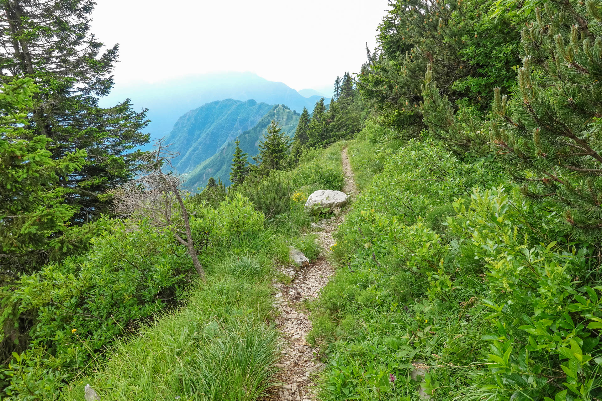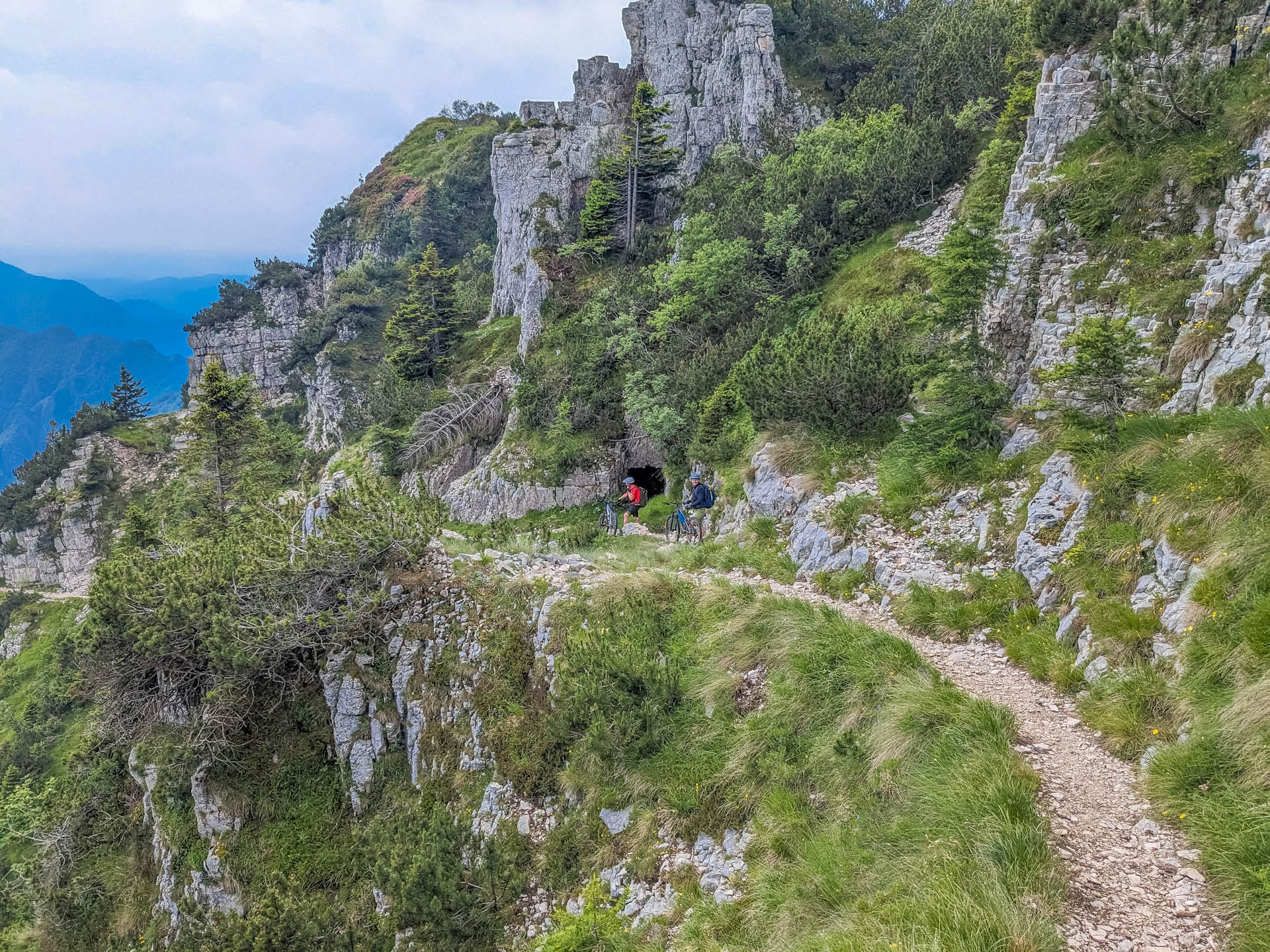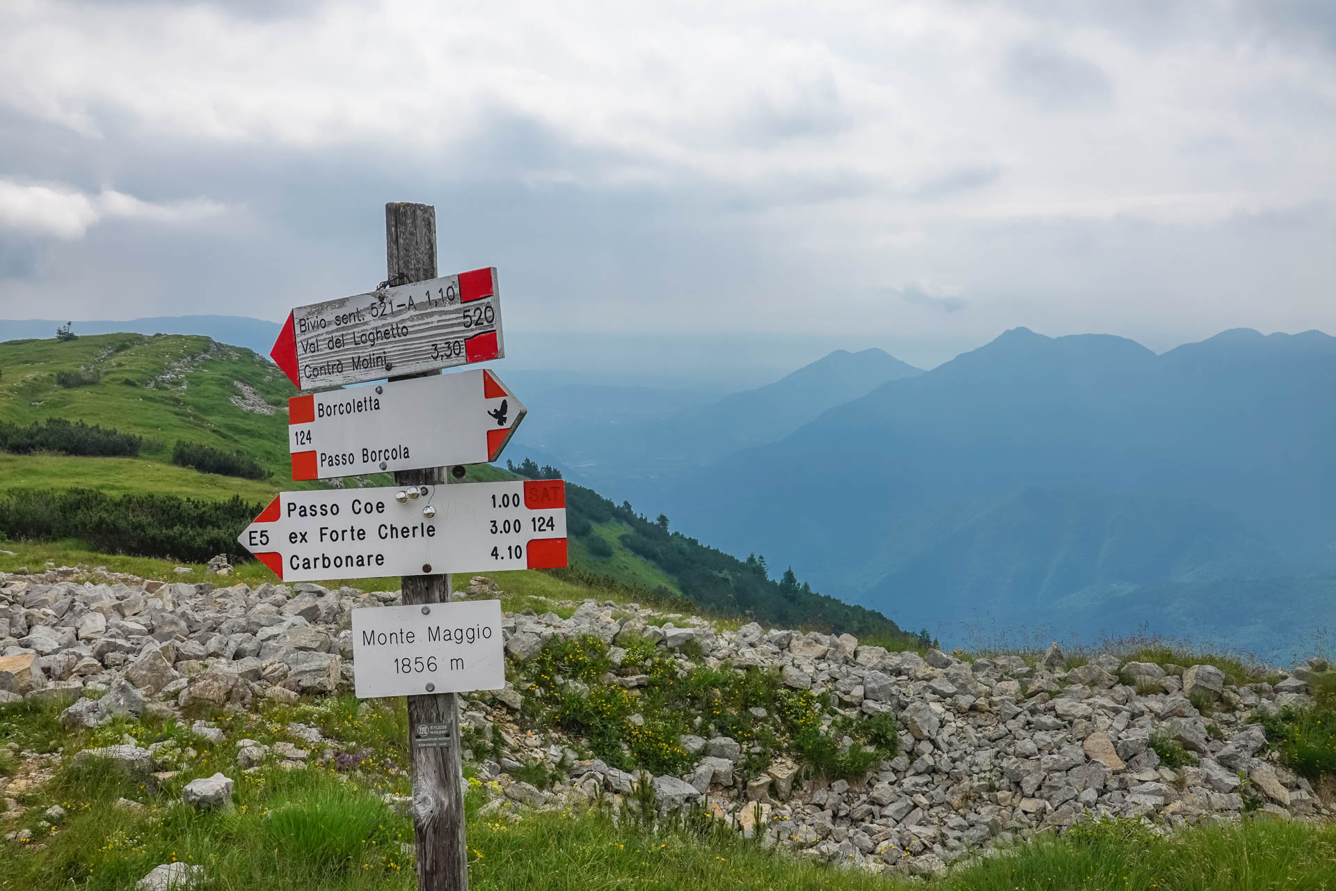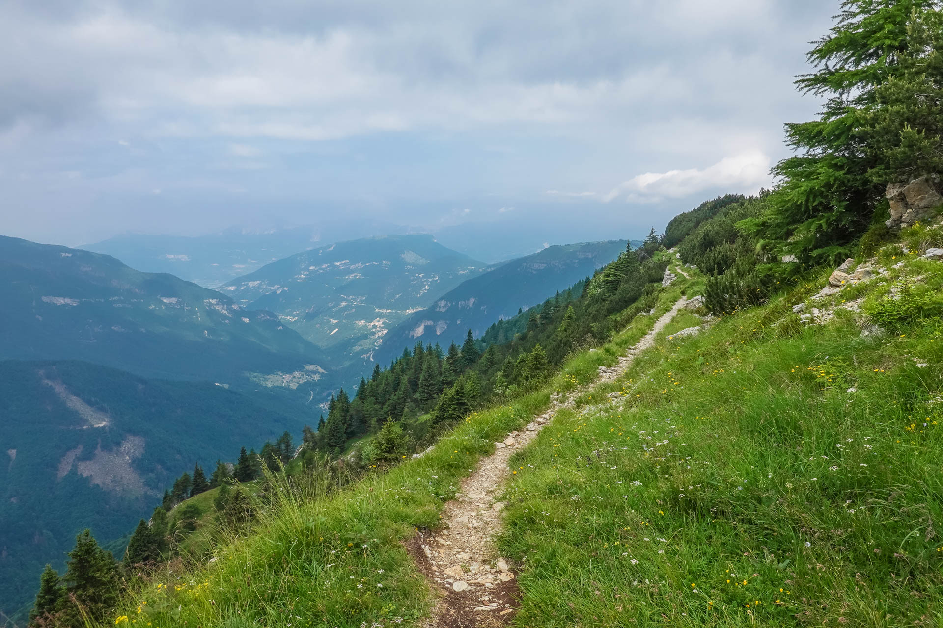 Der folgende Anstieg führt teilweise durch Skigebiete und wird dann schmaler und ausgesetzter. Auf insgesamt 6 Kilometern müssen wir 330 Höhenmeter überwinden. Klingt nicht dramatisch, aber die kleinen Rampen tun mittlerweile in den Beinen weh. Dennoch ist es herrlich hier. Der Weg verläuft am Steilhang entlang und ist mittlerweile zu einem Singletrail geworden. Wir befinden uns fast die ganze Zeit an der Kante, wo das Gelände steil ins Val Terragnolo abbricht, und die Aussicht begleitet uns die ganze Strecke über. Dieser Wegabschnitt gehört offiziell zum Sentiero della Pace, den grob 500 km langen Fernwanderweg durch die Dolomiten, der sich von den Sextner Dolomiten über den nördlichen Gardasee bis hin zum Stilfserjoch zieht. Der Friedensweg ist einfach ein Genuss! Unser Zwischenziel ist der Monte Maggio mit seinem markanten großen Kreuz aus Stahl. Dort machen wir einen Fotostopp und genießen die atemberaubende Aussicht, während es hier oben ruhig und abgelegen ist, weit und breit kein Wanderer zu sehen.