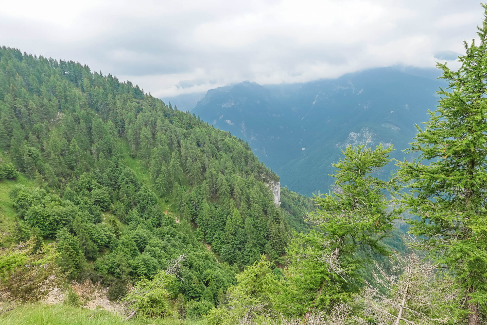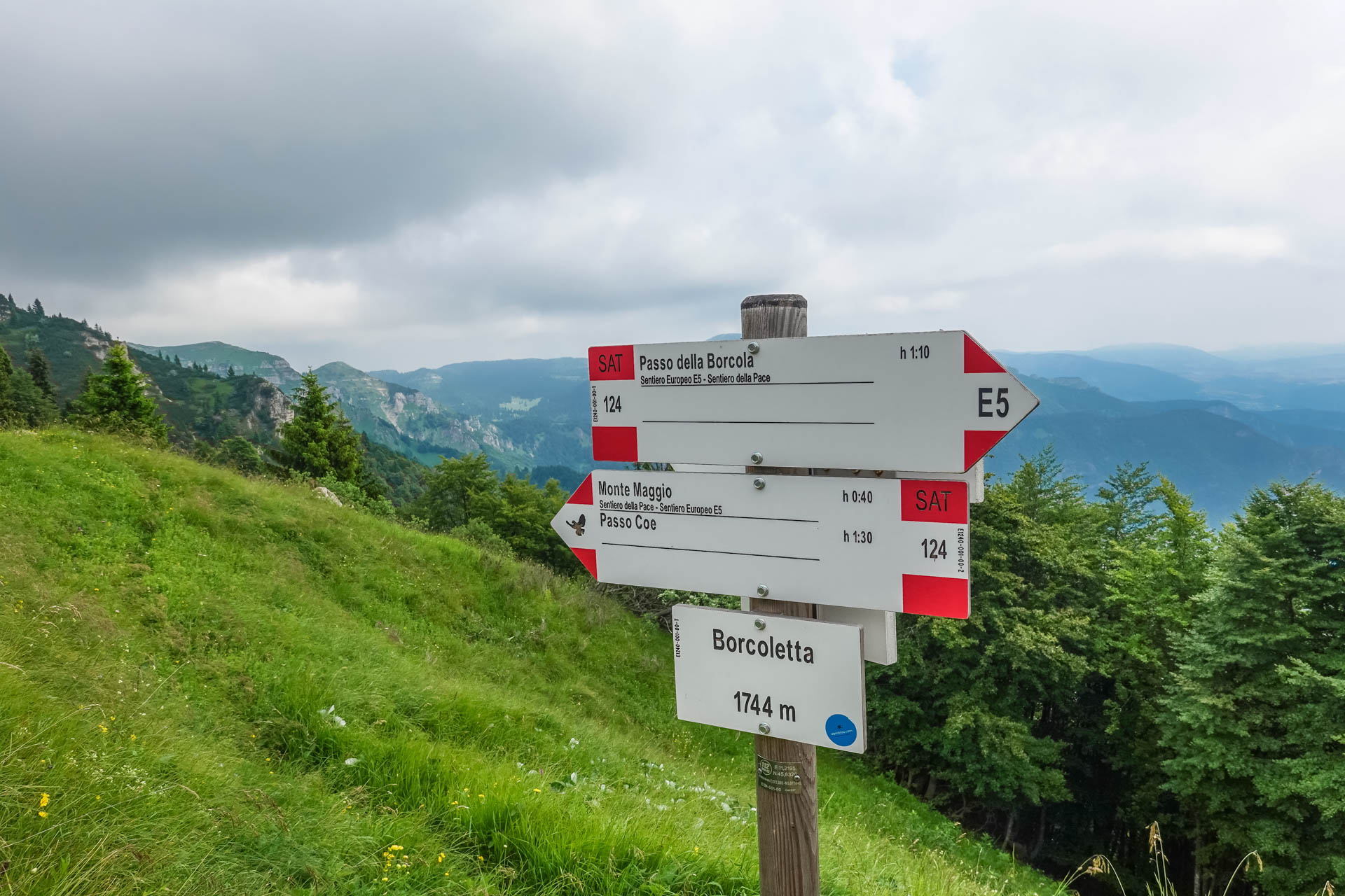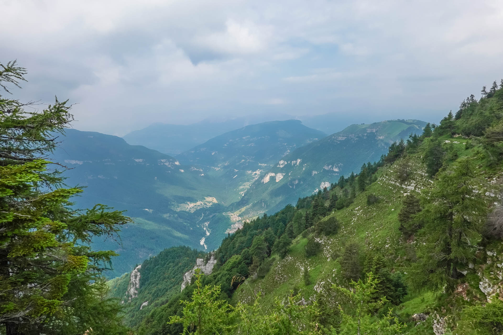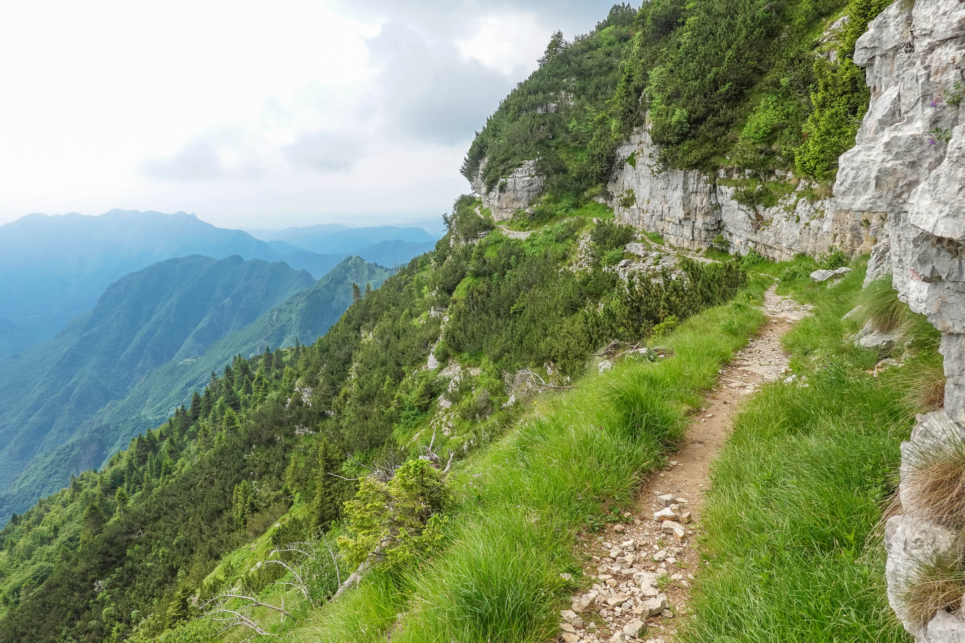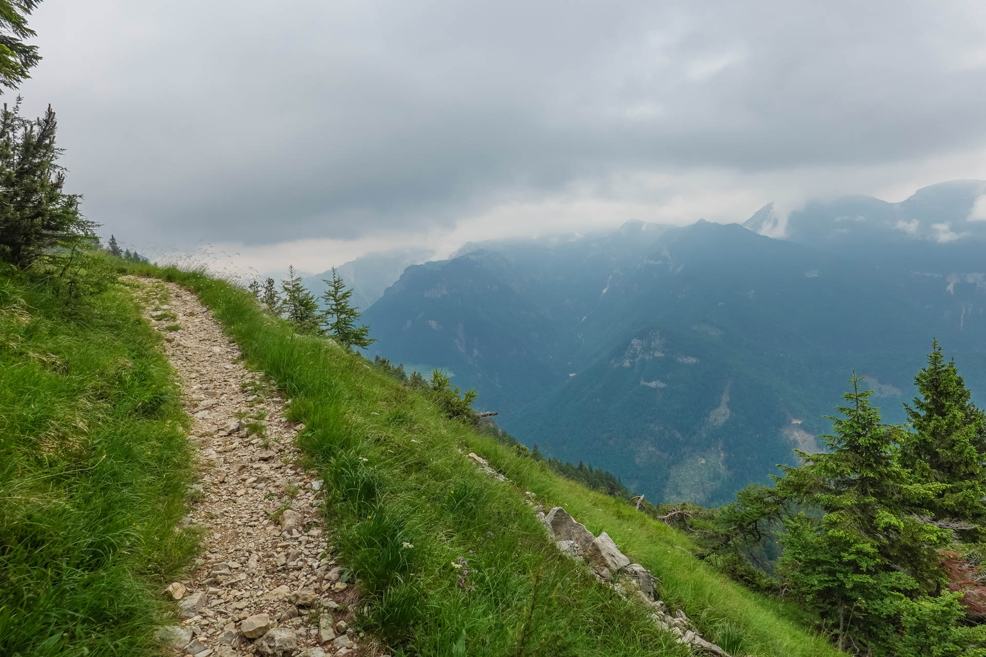 Der folgende Anstieg führt teilweise durch Skigebiete und wird dann schmaler und ausgesetzter. Auf insgesamt 6 Kilometern müssen wir 330 Höhenmeter überwinden. Klingt nicht dramatisch, aber die kleinen Rampen tun mittlerweile in den Beinen weh. Dennoch ist es herrlich hier. Der Weg verläuft am Steilhang entlang und ist mittlerweile zu einem Singletrail geworden. Wir befinden uns fast die ganze Zeit an der Kante, wo das Gelände steil ins Val Terragnolo abbricht, und die Aussicht begleitet uns die ganze Strecke über. Dieser Wegabschnitt gehört offiziell zum Sentiero della Pace, den grob 500 km langen Fernwanderweg durch die Dolomiten, der sich von den Sextner Dolomiten über den nördlichen Gardasee bis hin zum Stilfserjoch zieht. Der Friedensweg ist einfach ein Genuss! Unser Zwischenziel ist der Monte Maggio mit seinem markanten großen Kreuz aus Stahl. Dort machen wir einen Fotostopp und genießen die atemberaubende Aussicht, während es hier oben ruhig und abgelegen ist, weit und breit kein Wanderer zu sehen.