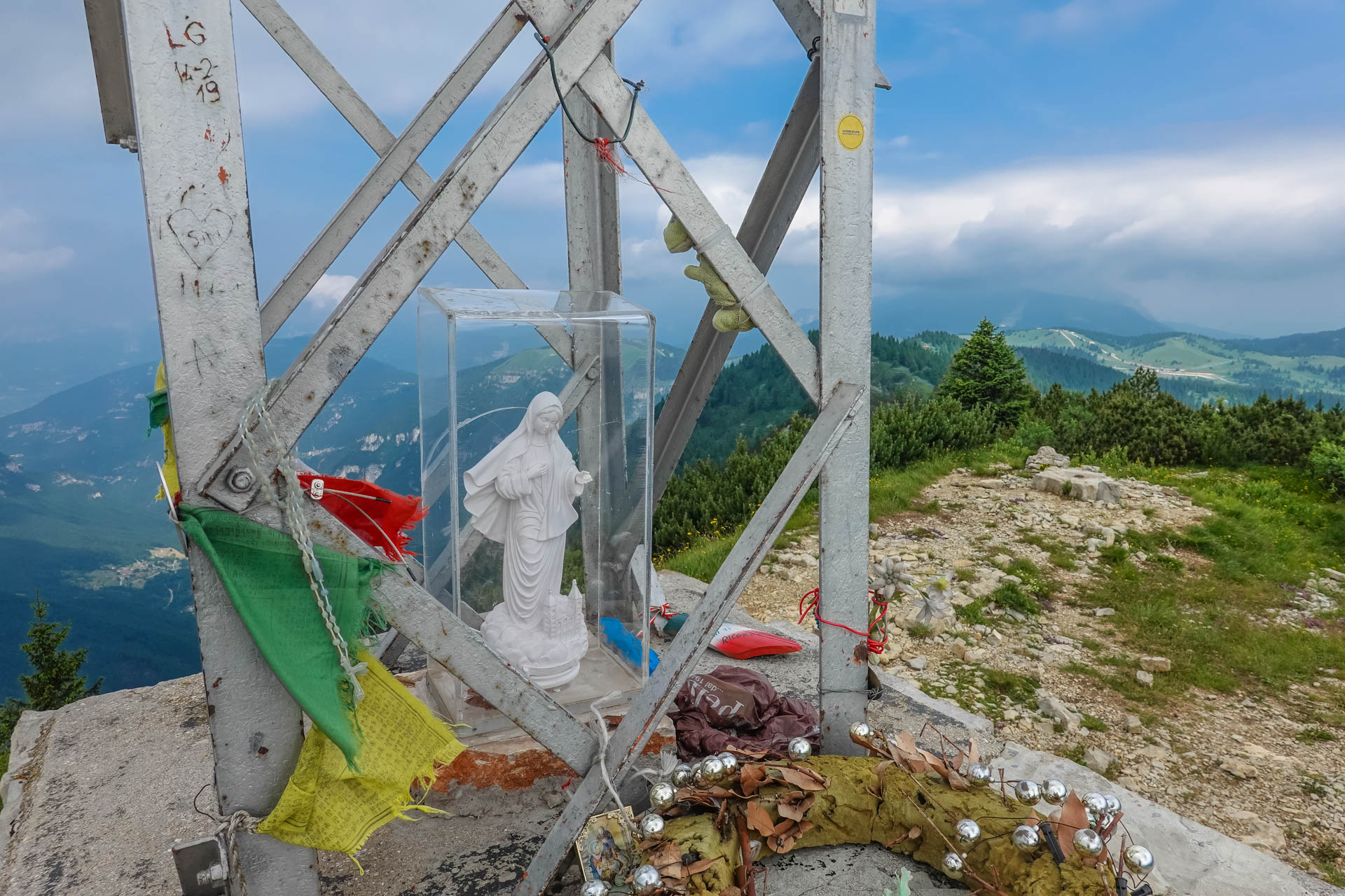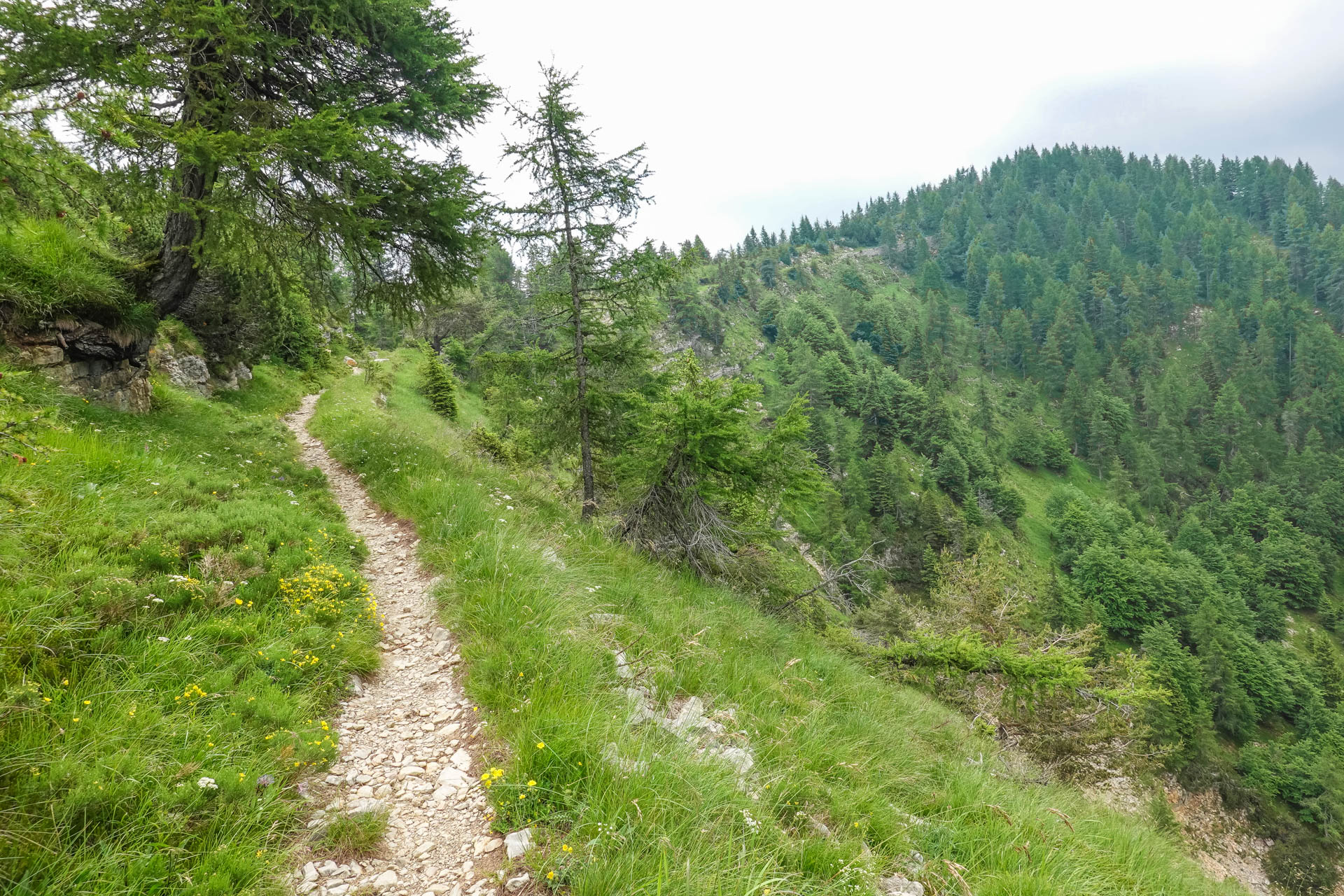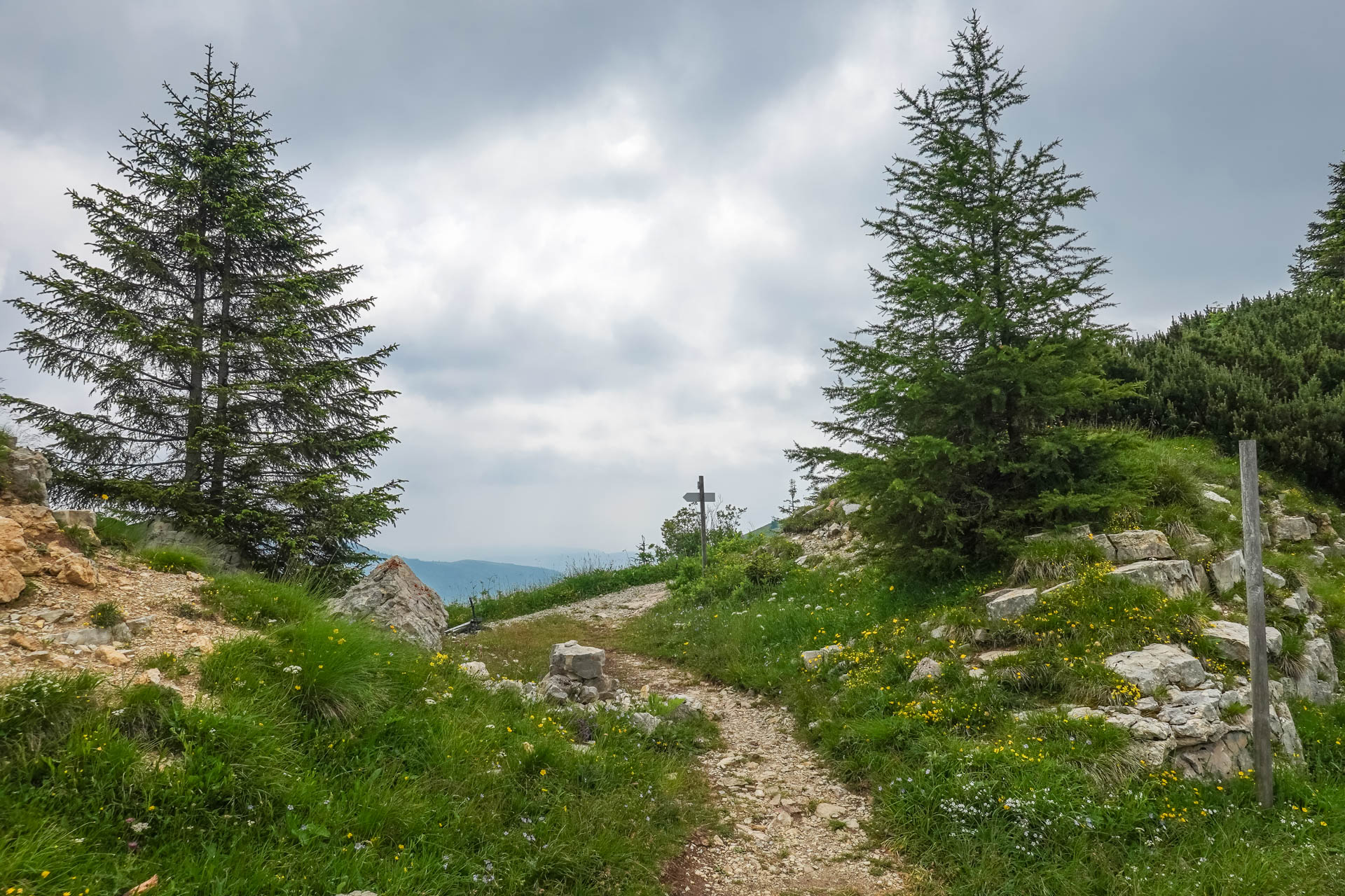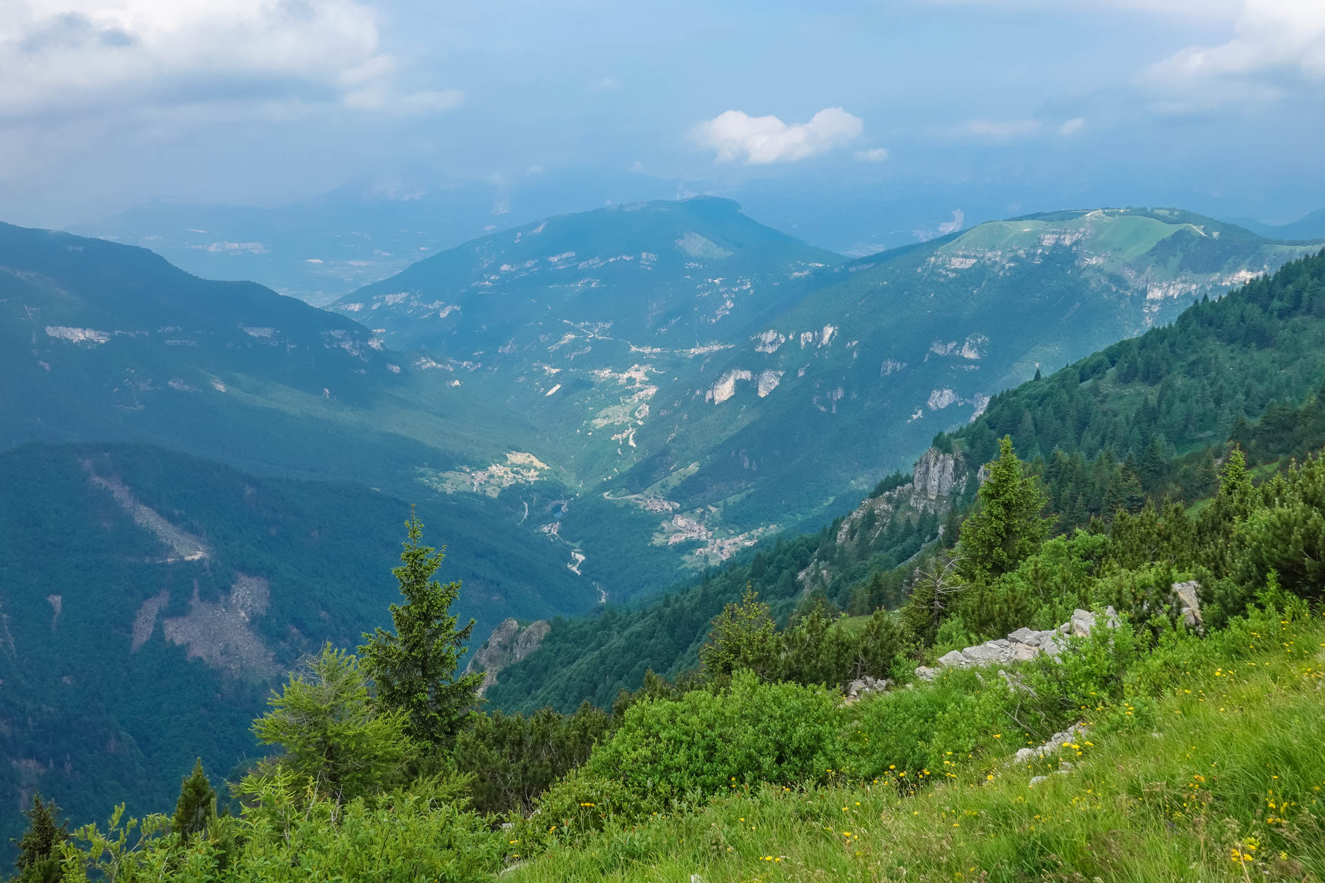 Der folgende Anstieg führt teilweise durch Skigebiete und wird dann schmaler und ausgesetzter. Auf insgesamt 6 Kilometern müssen wir 330 Höhenmeter überwinden. Klingt nicht dramatisch, aber die kleinen Rampen tun mittlerweile in den Beinen weh. Dennoch ist es herrlich hier. Der Weg verläuft am Steilhang entlang und ist mittlerweile zu einem Singletrail geworden. Wir befinden uns fast die ganze Zeit an der Kante, wo das Gelände steil ins Val Terragnolo abbricht, und die Aussicht begleitet uns die ganze Strecke über. Dieser Wegabschnitt gehört offiziell zum Sentiero della Pace, den grob 500 km langen Fernwanderweg durch die Dolomiten, der sich von den Sextner Dolomiten über den nördlichen Gardasee bis hin zum Stilfserjoch zieht. Der Friedensweg ist einfach ein Genuss! Unser Zwischenziel ist der Monte Maggio mit seinem markanten großen Kreuz aus Stahl. Dort machen wir einen Fotostopp und genießen die atemberaubende Aussicht, während es hier oben ruhig und abgelegen ist, weit und breit kein Wanderer zu sehen.