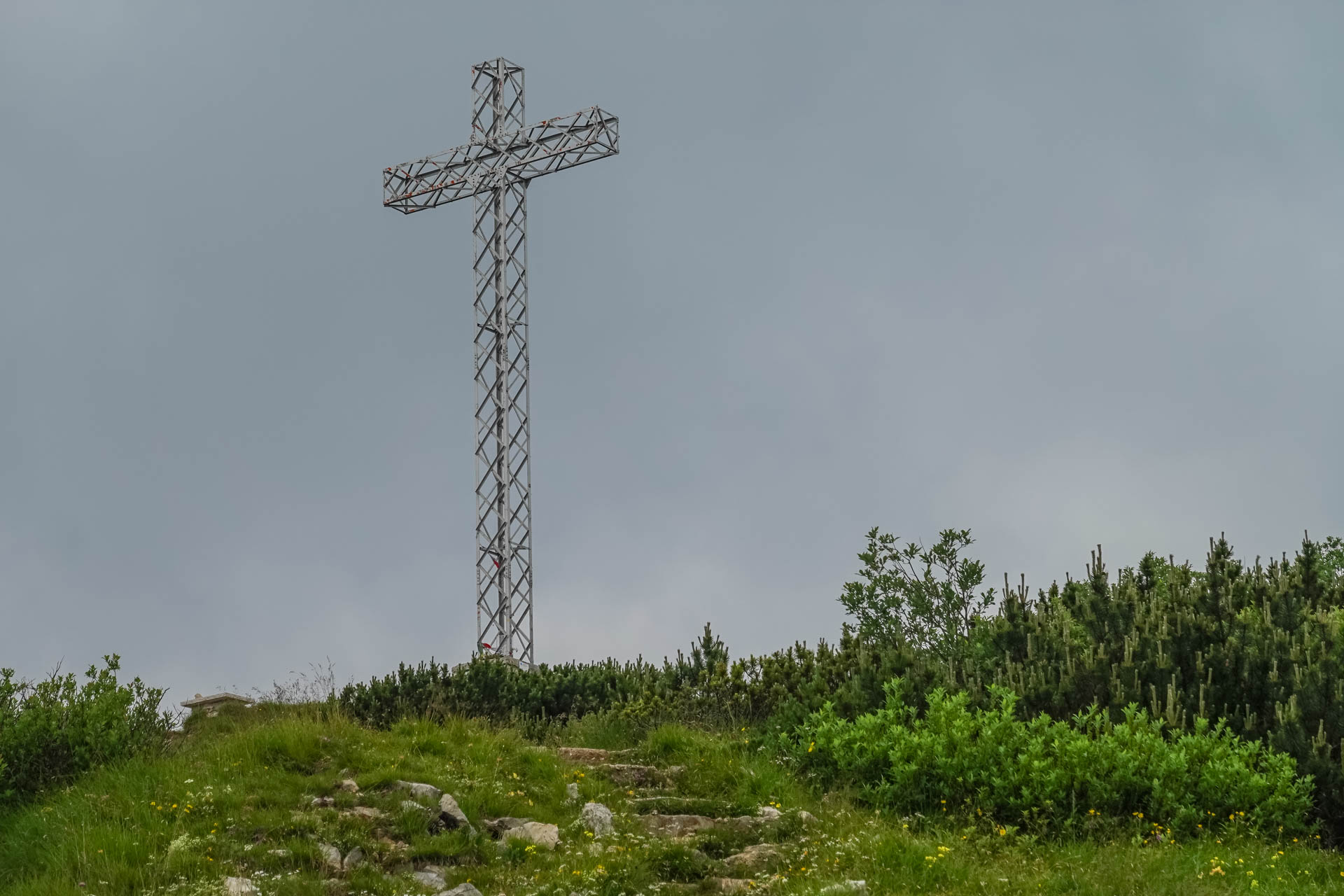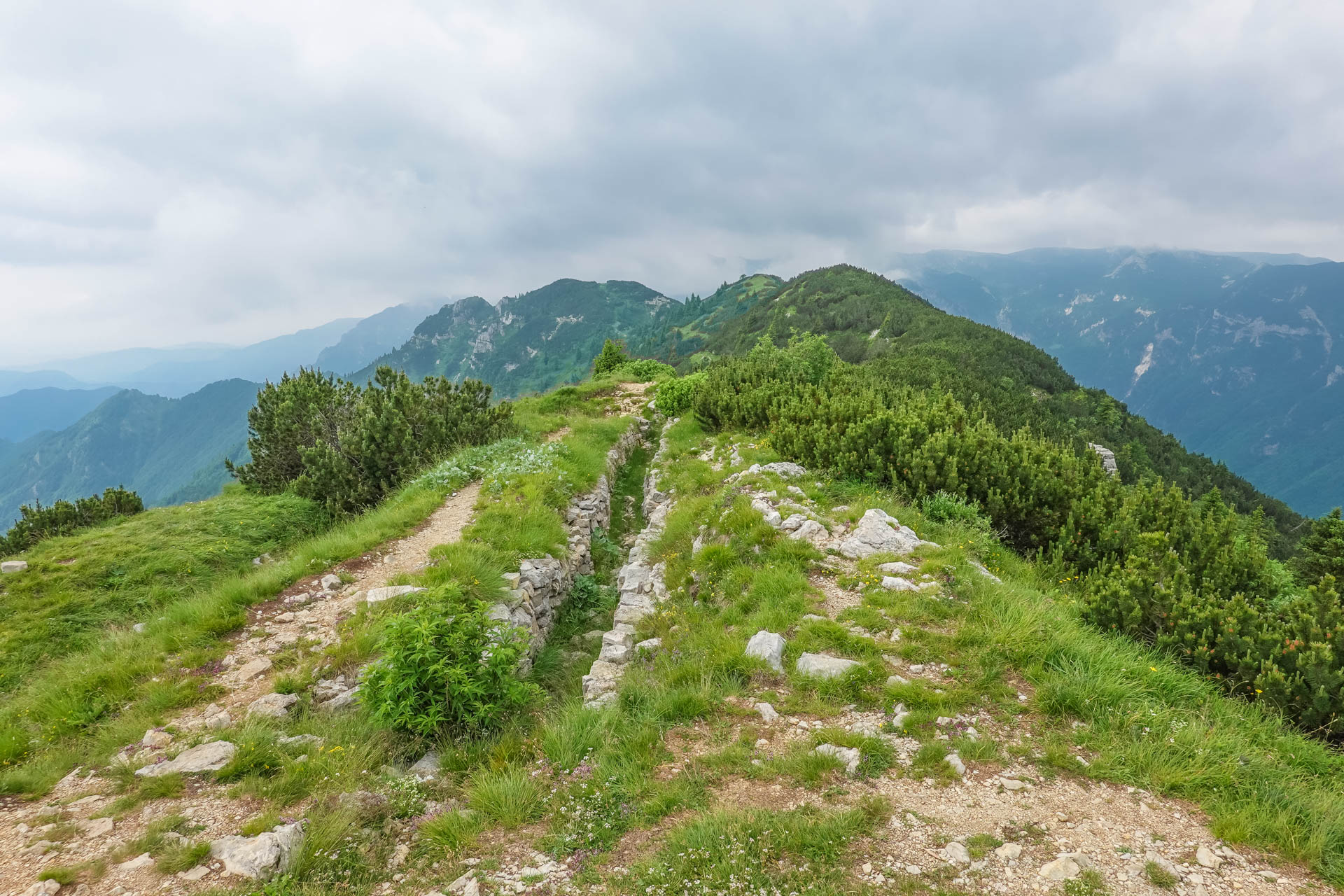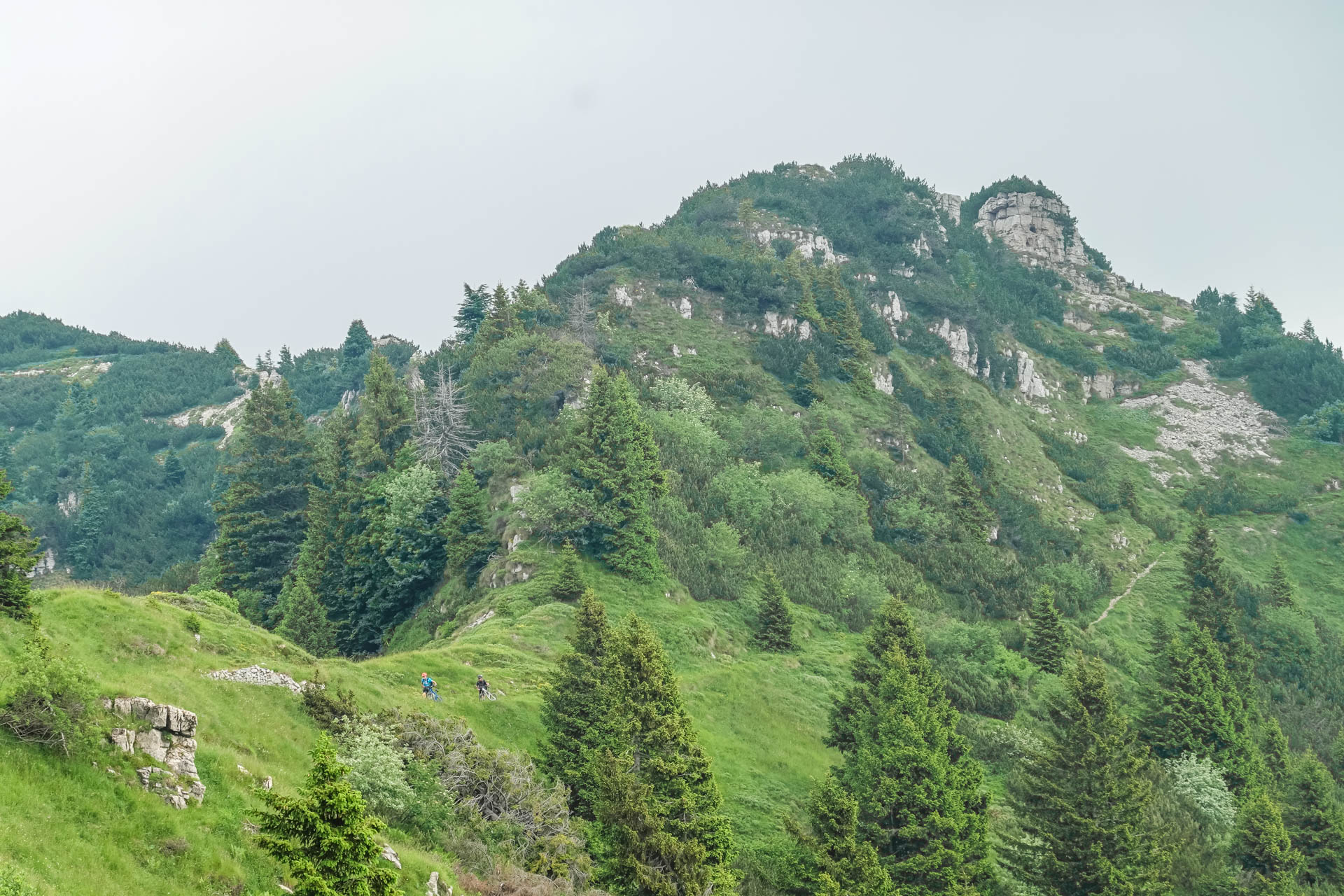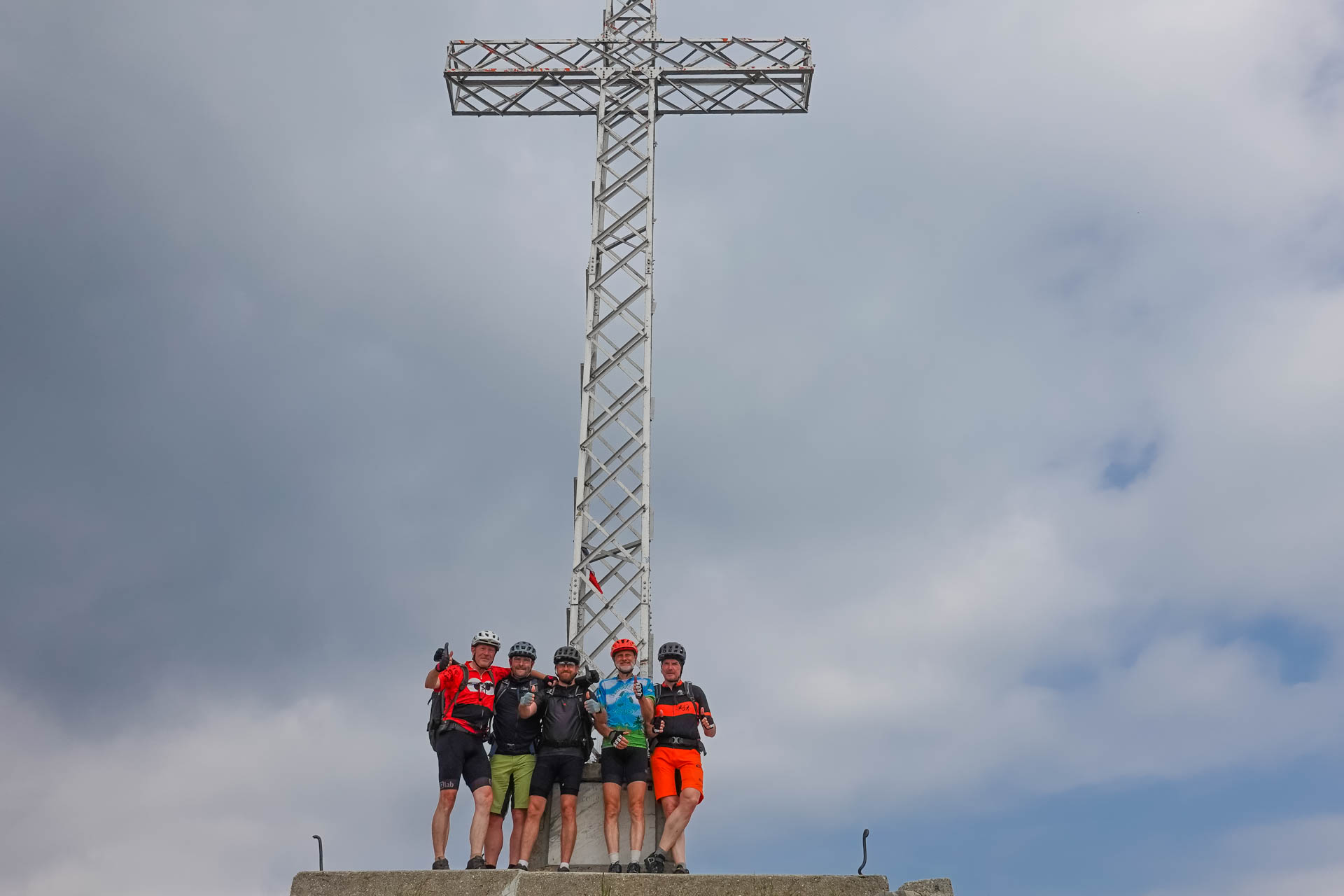 Der folgende Anstieg führt teilweise durch Skigebiete und wird dann schmaler und ausgesetzter. Auf insgesamt 6 Kilometern müssen wir 330 Höhenmeter überwinden. Klingt nicht dramatisch, aber die kleinen Rampen tun mittlerweile in den Beinen weh. Dennoch ist es herrlich hier. Der Weg verläuft am Steilhang entlang und ist mittlerweile zu einem Singletrail geworden. Wir befinden uns fast die ganze Zeit an der Kante, wo das Gelände steil ins Val Terragnolo abbricht, und die Aussicht begleitet uns die ganze Strecke über. Dieser Wegabschnitt gehört offiziell zum Sentiero della Pace, den grob 500 km langen Fernwanderweg durch die Dolomiten, der sich von den Sextner Dolomiten über den nördlichen Gardasee bis hin zum Stilfserjoch zieht. Der Friedensweg ist einfach ein Genuss! Unser Zwischenziel ist der Monte Maggio mit seinem markanten großen Kreuz aus Stahl. Dort machen wir einen Fotostopp und genießen die atemberaubende Aussicht, während es hier oben ruhig und abgelegen ist, weit und breit kein Wanderer zu sehen.