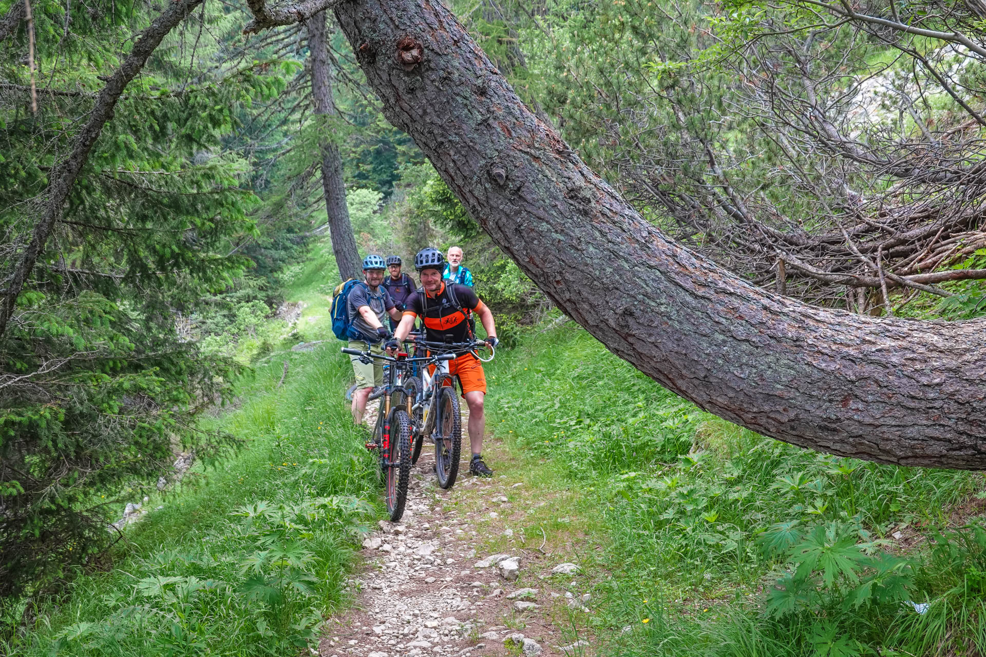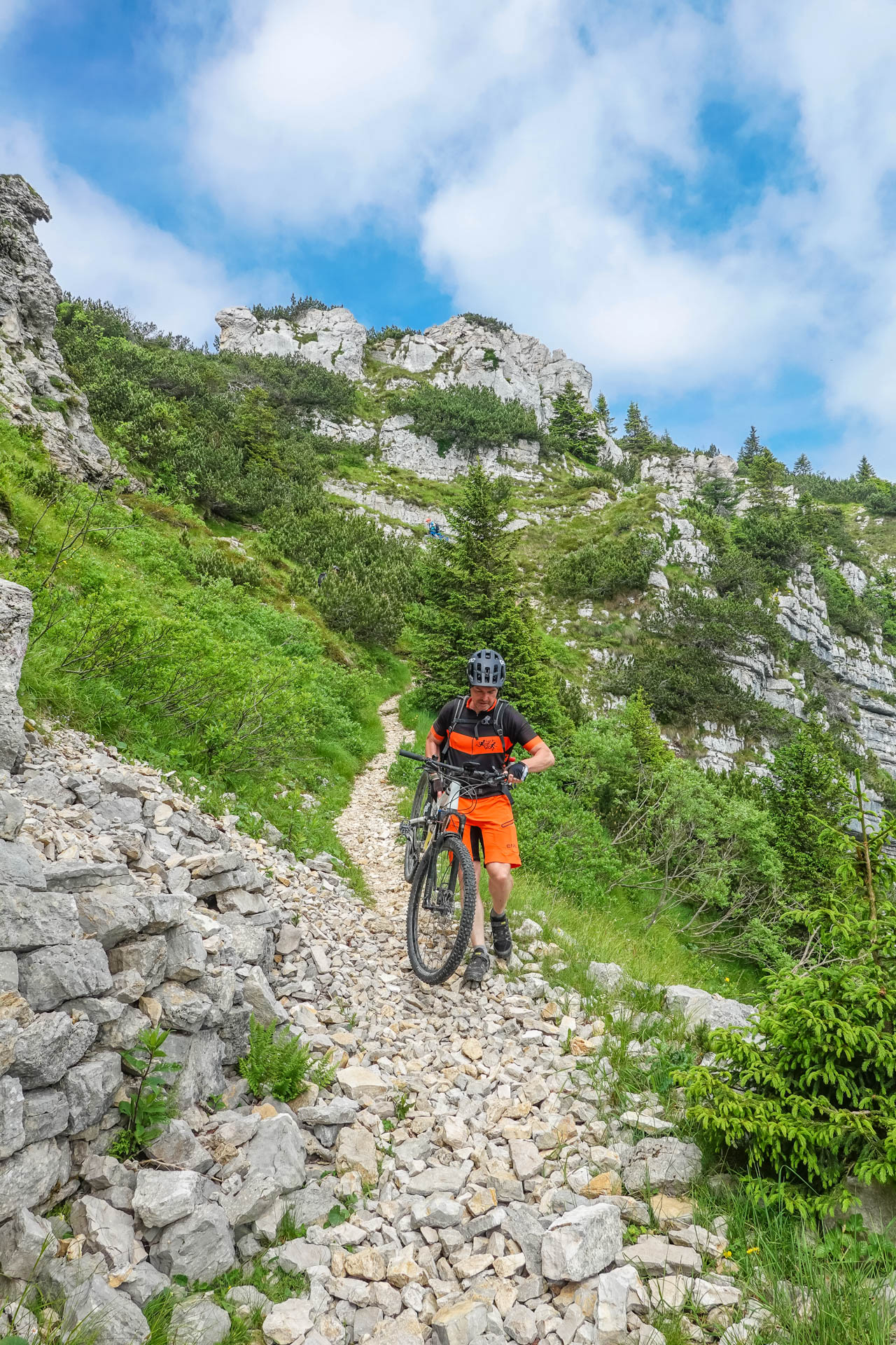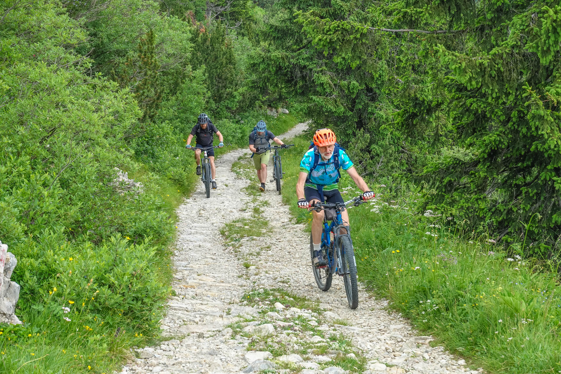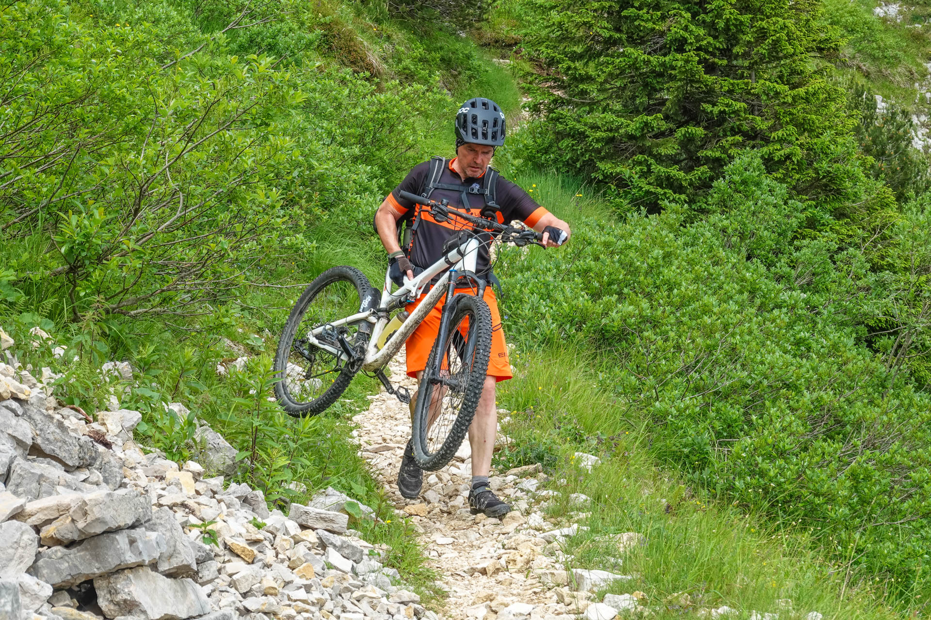 Der Weg, der nun folgt, ist für uns Flachlandtiroler kaum fahrbar. Es handelt sich um einen steilen Trail mit groben Steinen, bei einem Fahrfehler wäre ein Sturz in den Abgrund die wahrscheinliche Folge. Ab und zu schaffe ich ein Stück zu fahren, aber dann traue ich mich nicht mehr und schiebe mein Bike. Doch trotz der Herausforderung macht es Spaß, denn die Landschaft um uns herum ist so gewaltig und schön, dass wir beim Radwandern alles noch besser genießen können.