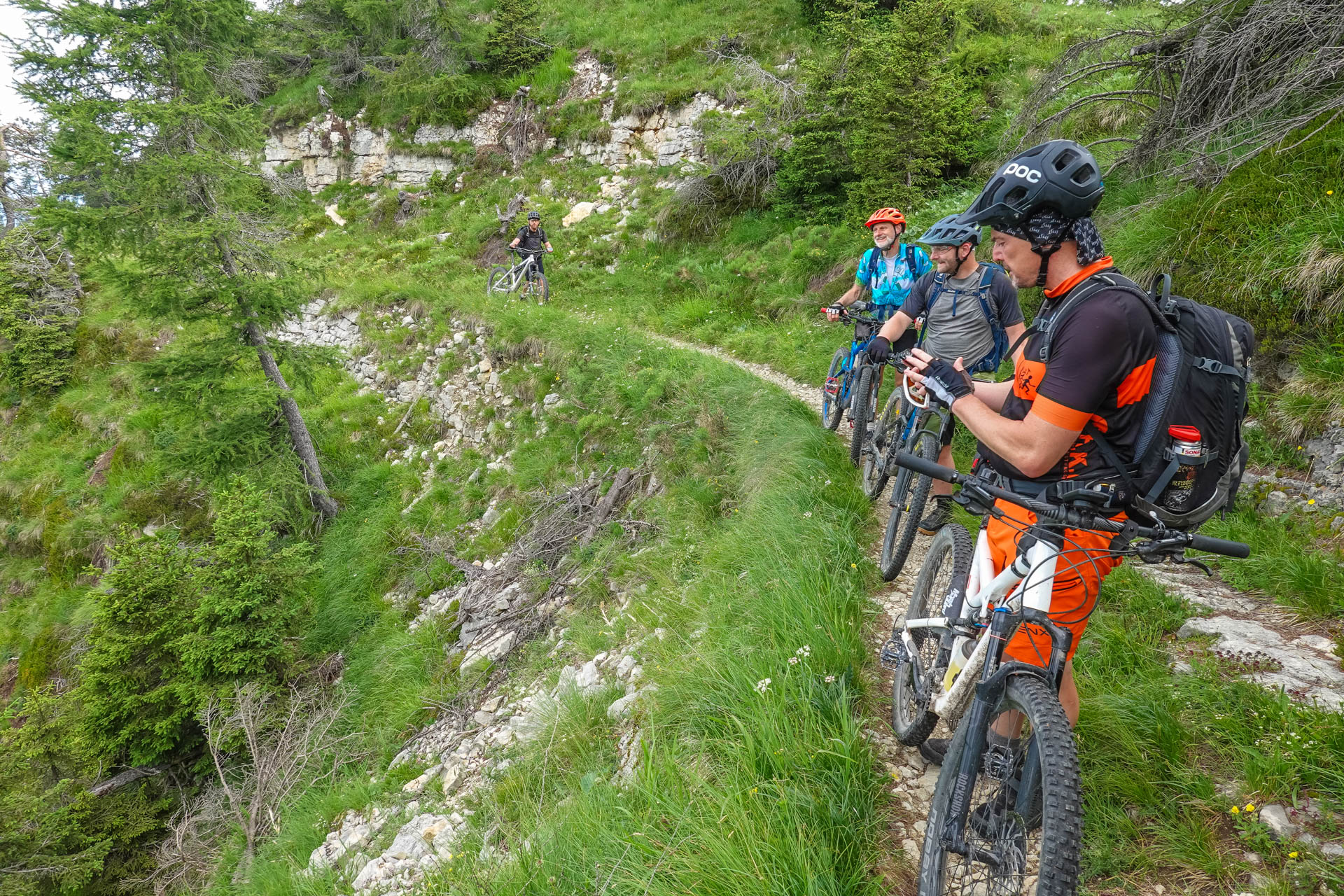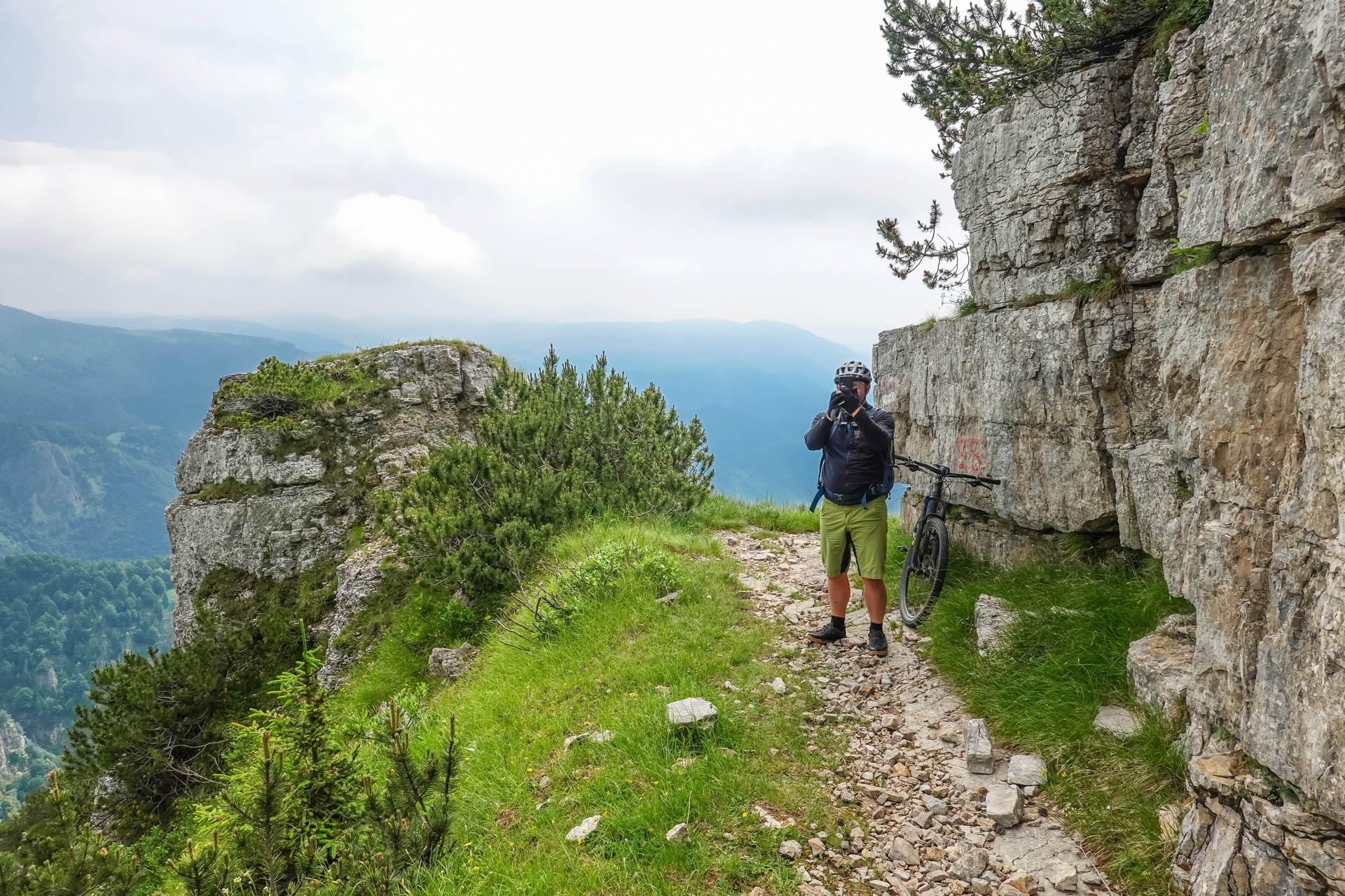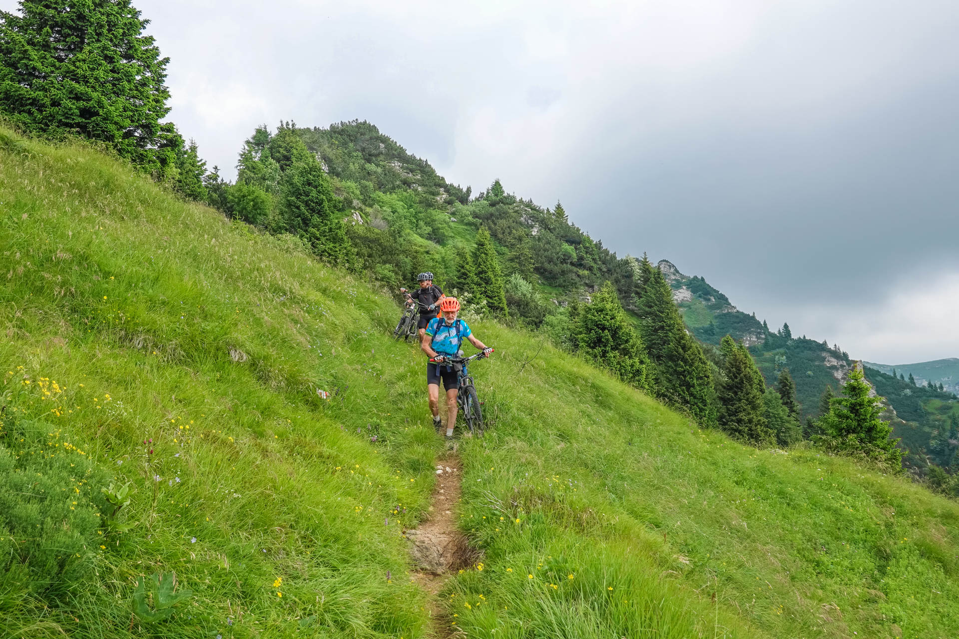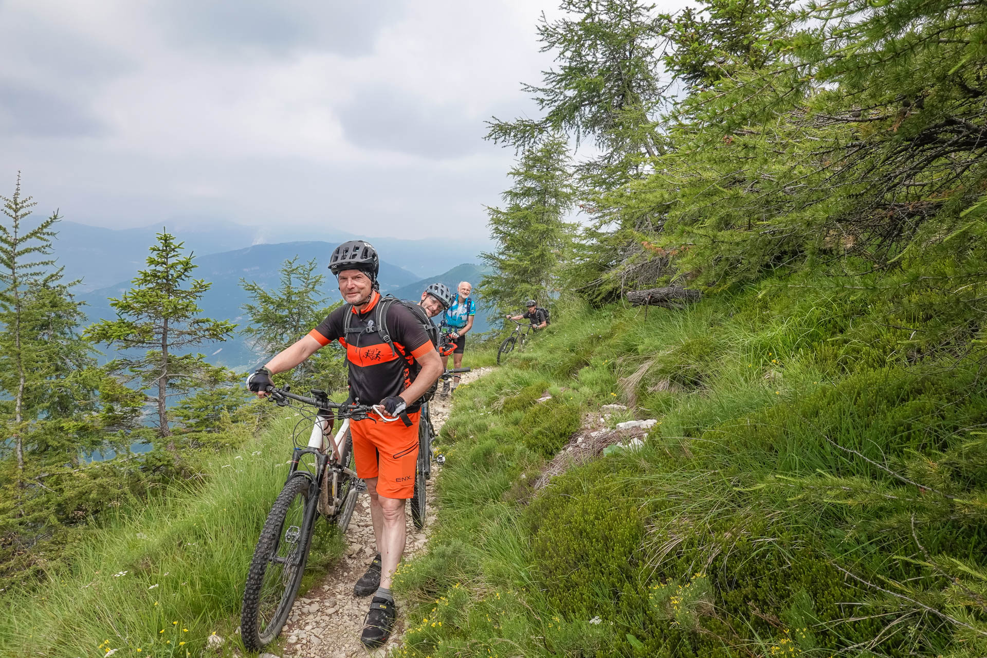 Der Weg, der nun folgt, ist für uns Flachlandtiroler kaum fahrbar. Es handelt sich um einen steilen Trail mit groben Steinen, bei einem Fahrfehler wäre ein Sturz in den Abgrund die wahrscheinliche Folge. Ab und zu schaffe ich ein Stück zu fahren, aber dann traue ich mich nicht mehr und schiebe mein Bike. Doch trotz der Herausforderung macht es Spaß, denn die Landschaft um uns herum ist so gewaltig und schön, dass wir beim Radwandern alles noch besser genießen können.