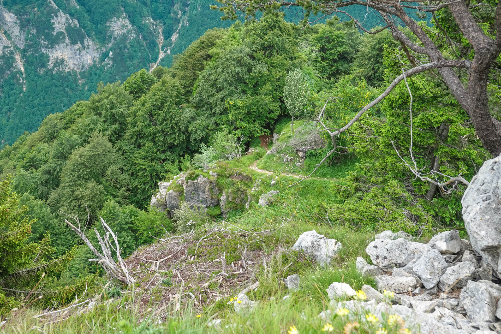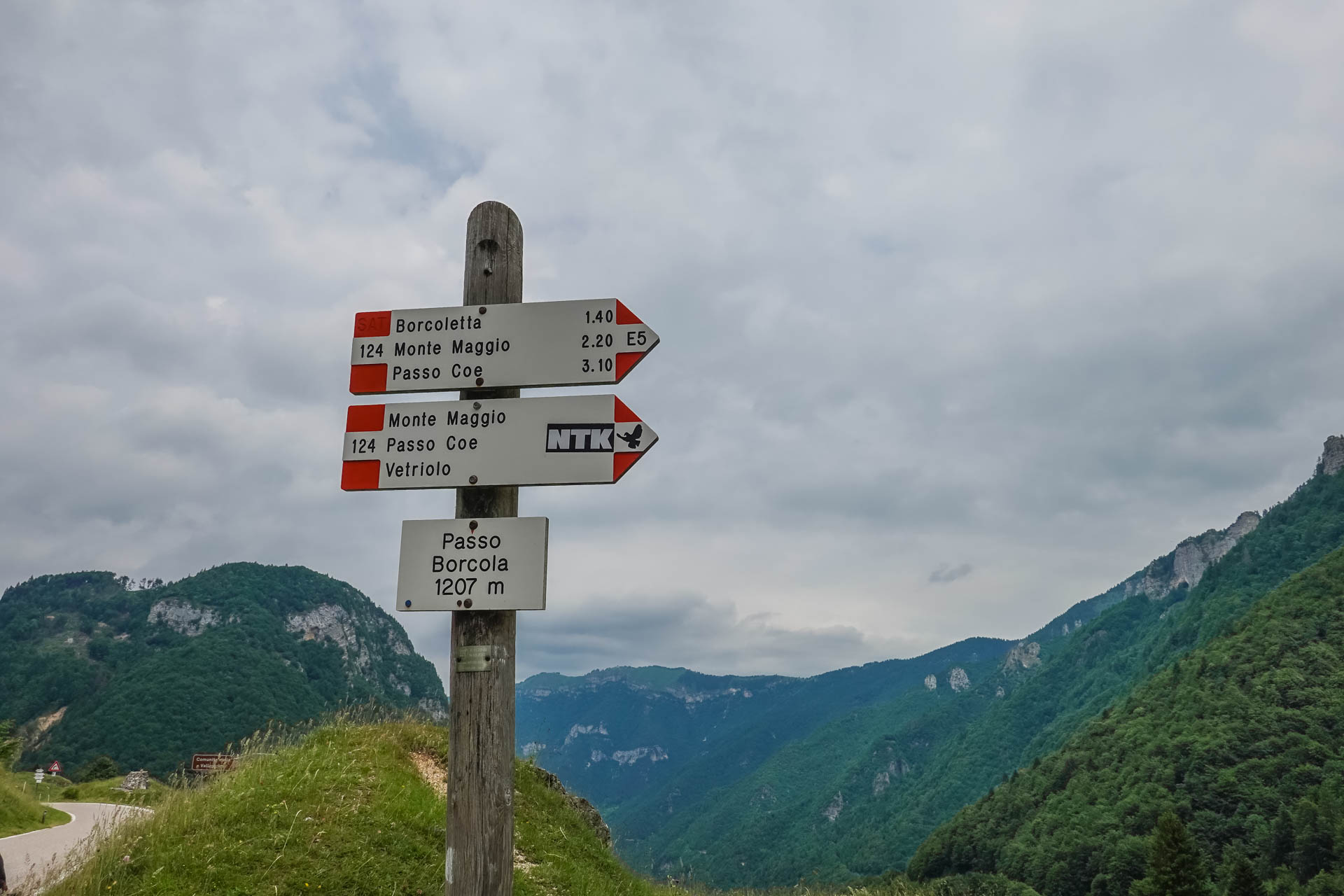Der folgende Anstieg führt teilweise durch Skigebiete und wird dann schmaler und ausgesetzter. Auf insgesamt 6 Kilometern müssen wir 330 Höhenmeter überwinden. Klingt nicht dramatisch, aber die kleinen Rampen tun mittlerweile in den Beinen weh. Dennoch ist es herrlich hier. Der Weg verläuft am Steilhang entlang und ist mittlerweile zu einem Singletrail geworden. Wir befinden uns fast die ganze Zeit an der Kante, wo das Gelände steil ins Val Terragnolo abbricht, und die Aussicht begleitet uns die ganze Strecke über. Dieser Wegabschnitt gehört offiziell zum Sentiero della Pace, den grob 500 km langen Fernwanderweg durch die Dolomiten, der sich von den Sextner Dolomiten über den nördlichen Gardasee bis hin zum Stilfserjoch zieht. Der Friedensweg ist einfach ein Genuss! Unser Zwischenziel ist der Monte Maggio mit seinem markanten großen Kreuz aus Stahl. Dort machen wir einen Fotostopp und genießen die atemberaubende Aussicht, während es hier oben ruhig und abgelegen ist, weit und breit kein Wanderer zu sehen.