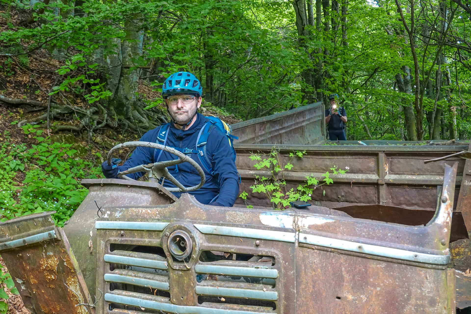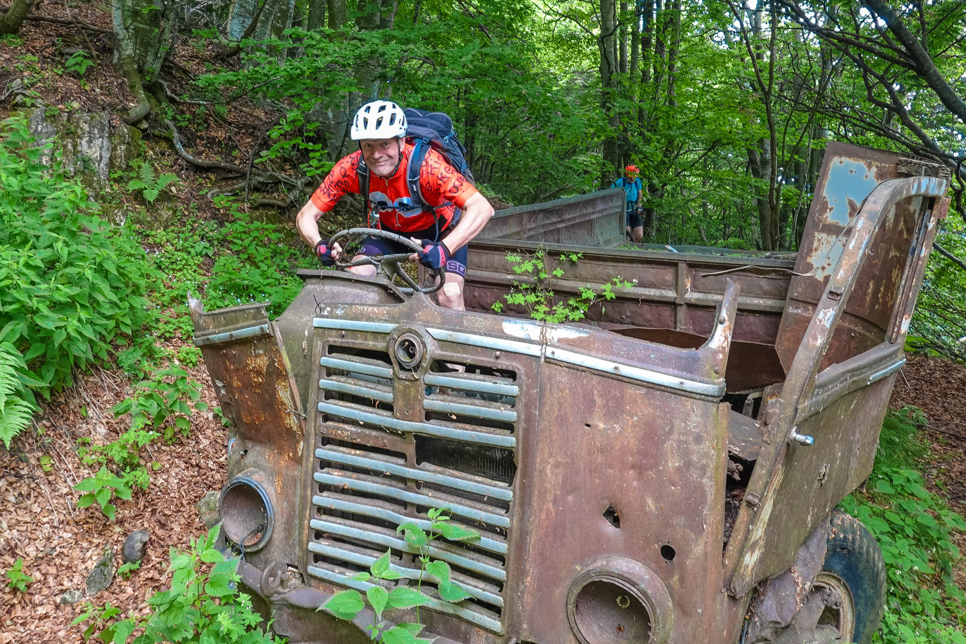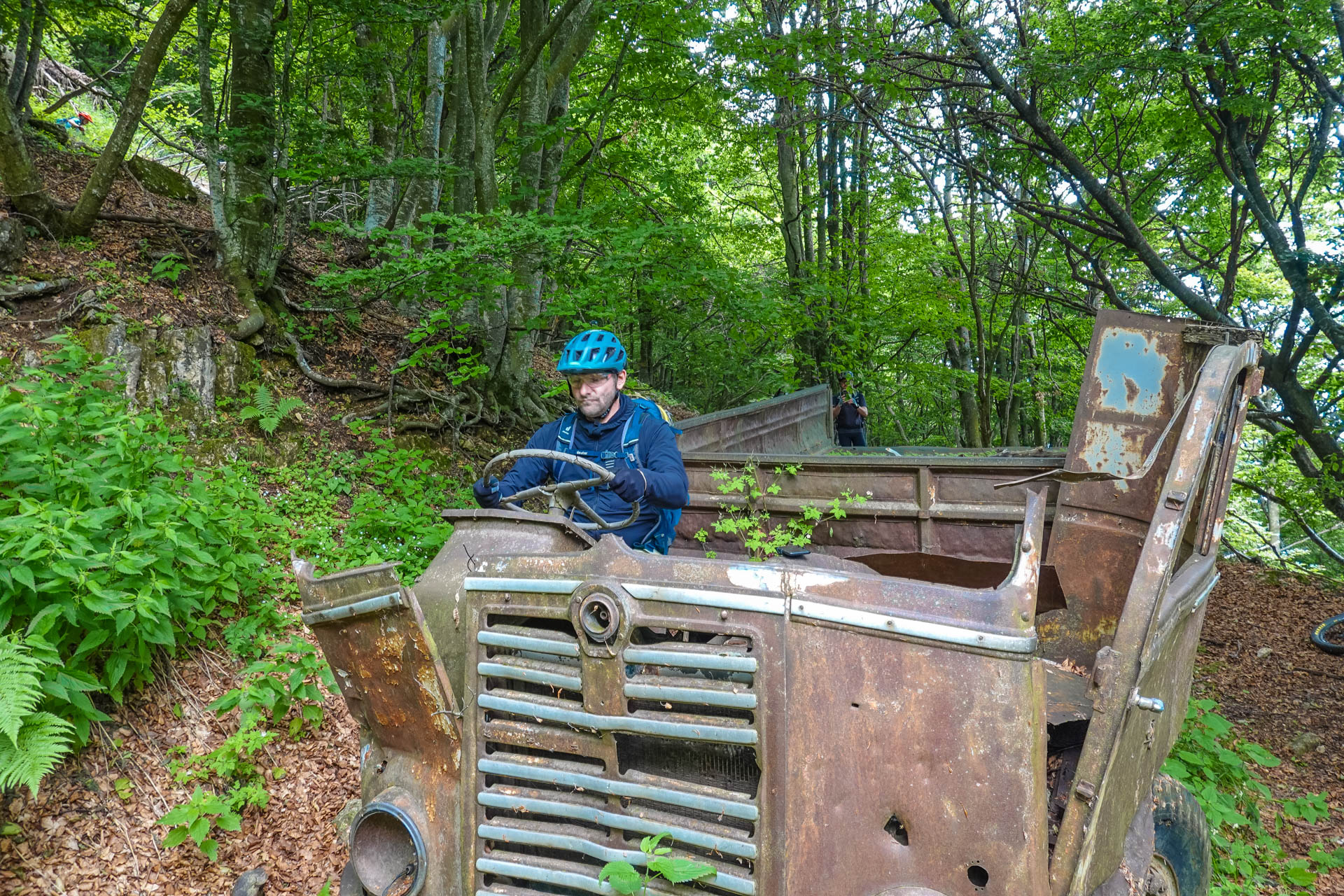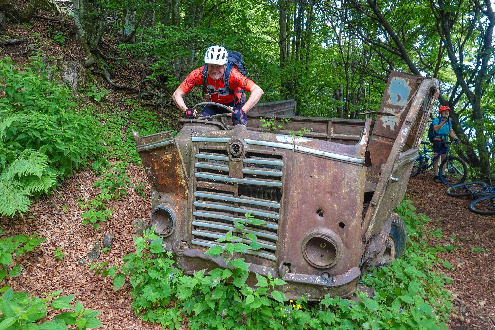 Als der Weg in den Wald führt, ist es immer noch steil und rutschig durch das viele Laub, aber es wird deutlich fahrbarer. Je weiter wir hinunterkommen, desto flowiger wird der Weg. Wir staunen, als wir auf einen verlassenen Militär-LKW mitten im Wald stoßen, der einfach vor sich hin rostet. Nachdem wir ein paar spaßige Bilder gemacht haben, führt uns der Weg schließlich auf die Straße zum Passübergang Borcola auf 1.250 Meter Höhe. Somit haben wir vom „Eisernen Kreuz“ aus 11 Kilometer und 1.200 Höhenmeter bewältigt.