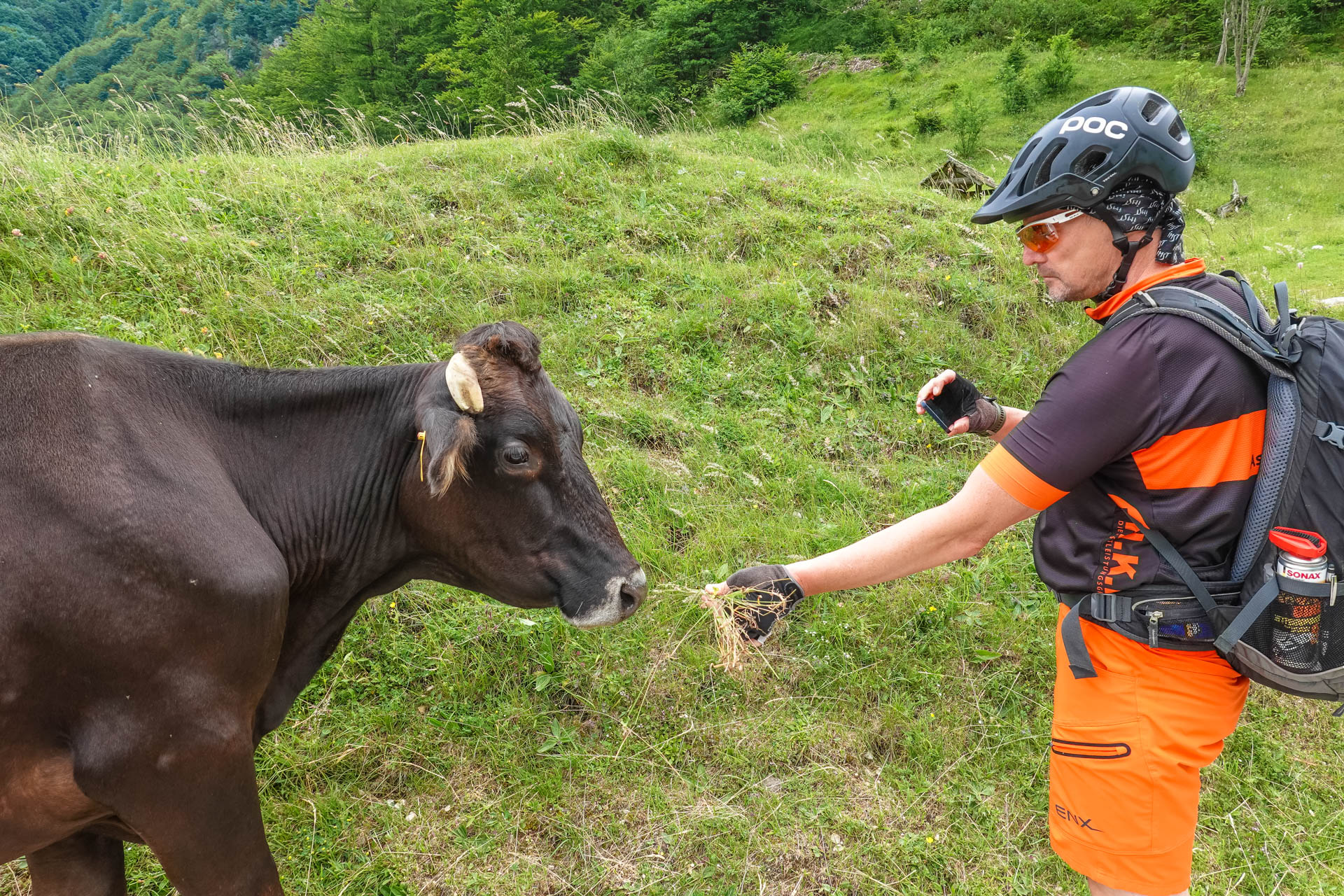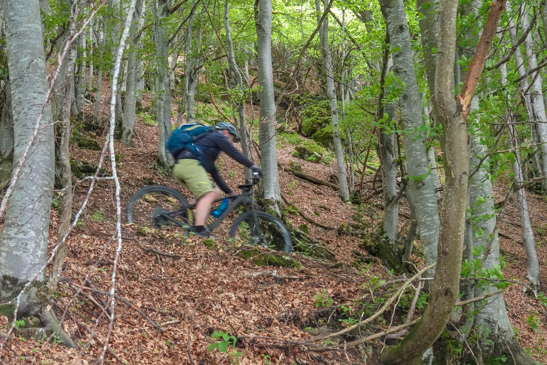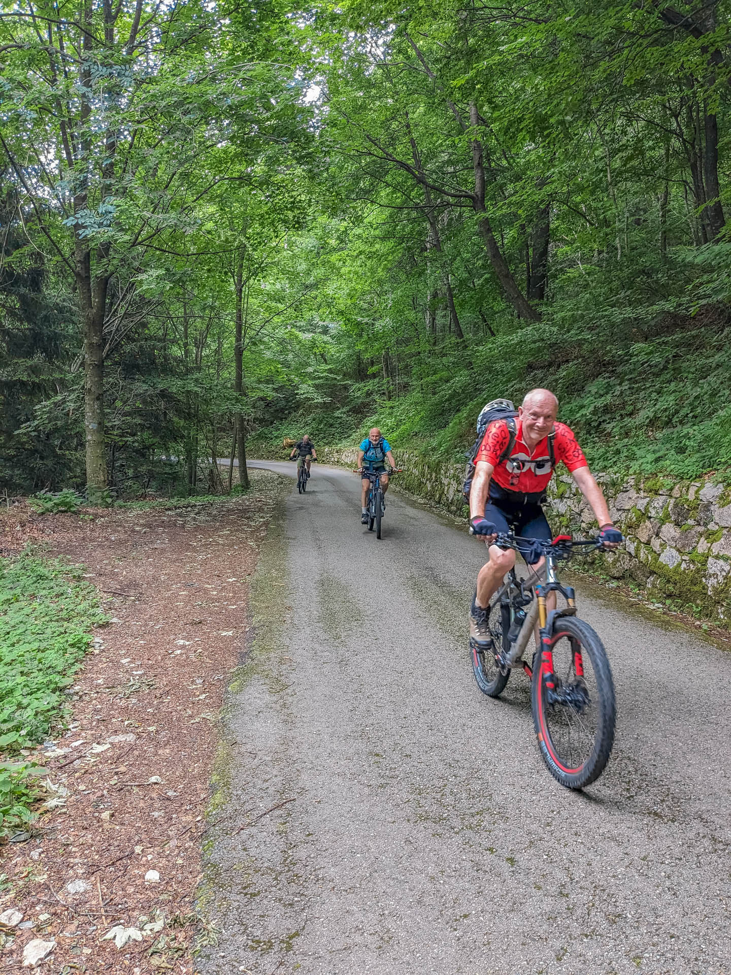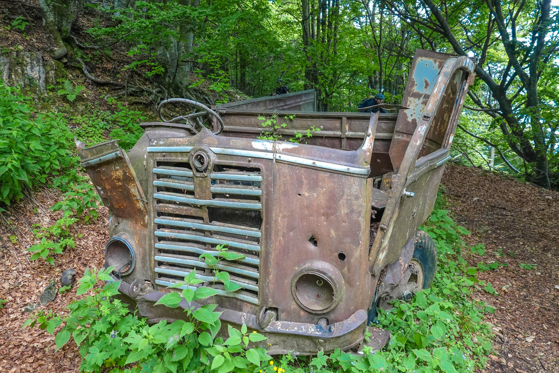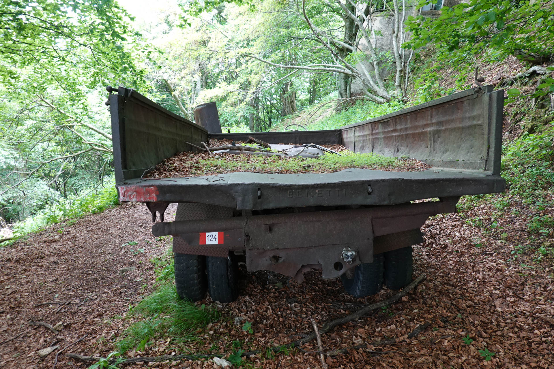 Als der Weg in den Wald führt, ist es immer noch steil und rutschig durch das viele Laub, aber es wird deutlich fahrbarer. Je weiter wir hinunterkommen, desto flowiger wird der Weg. Wir staunen, als wir auf einen verlassenen Militär-LKW mitten im Wald stoßen, der einfach vor sich hin rostet. Nachdem wir ein paar spaßige Bilder gemacht haben, führt uns der Weg schließlich auf die Straße zum Passübergang Borcola auf 1.250 Meter Höhe. Somit haben wir vom „Eisernen Kreuz“ aus 11 Kilometer und 1.200 Höhenmeter bewältigt.