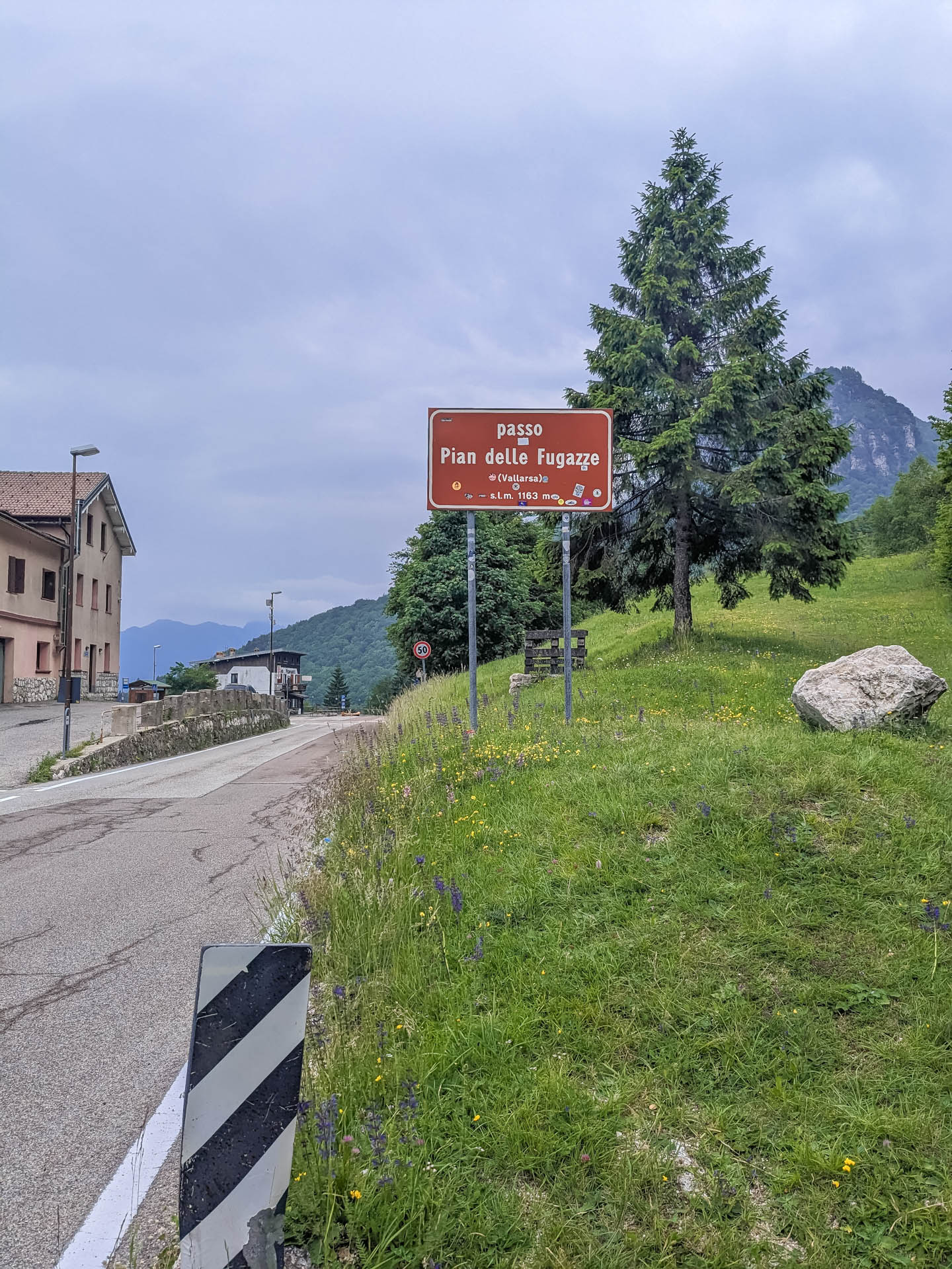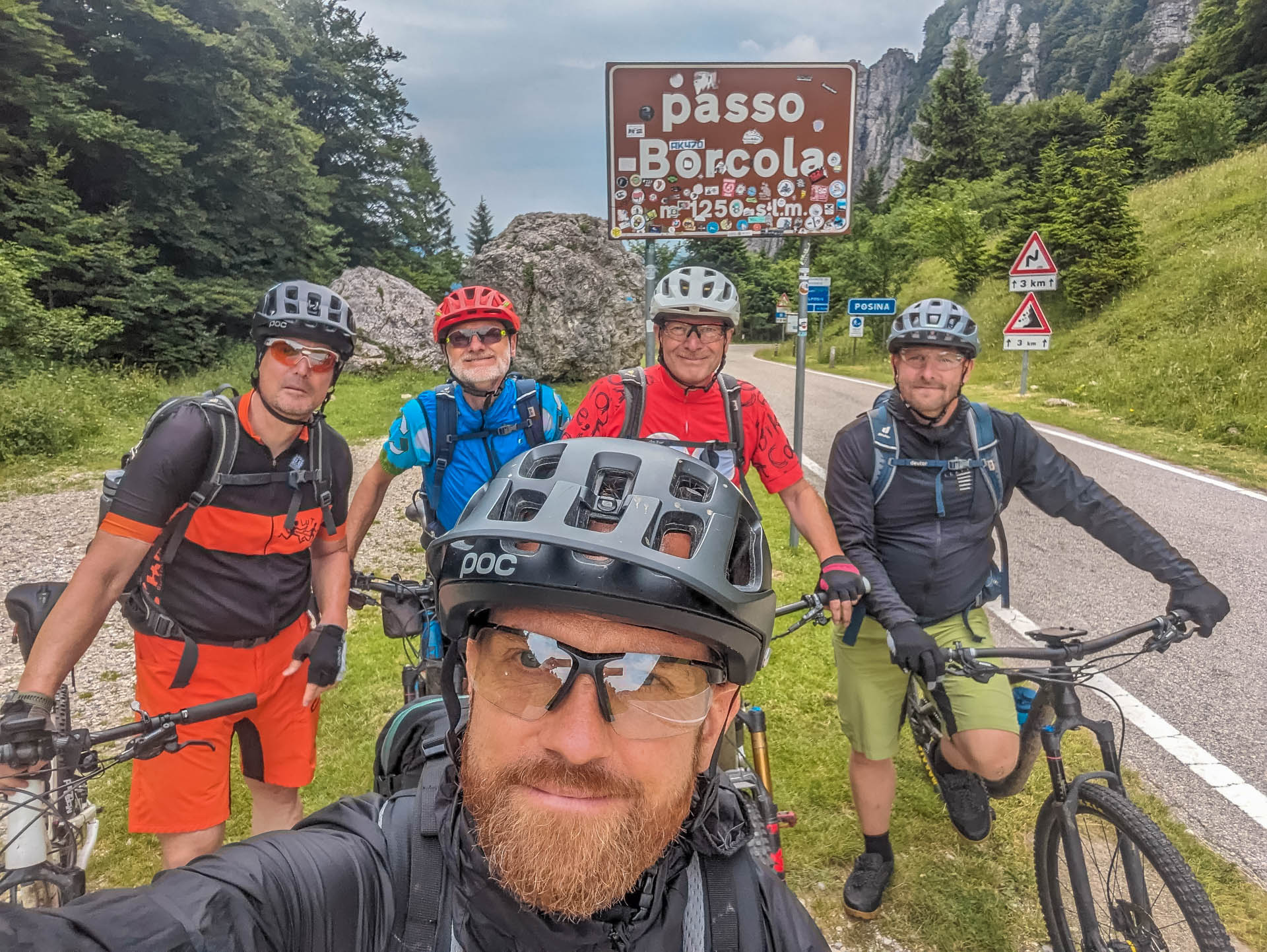 Doch dann ist der Spaß vorbei, wie könnte es anders sein, es geht wieder bergauf. Unser erstes Teilziel ist der Passo Xomo. Auf 5 Kilometern folgen 440 Höhenmeter, ab und zu kleine Rampen, aber alles gut fahrbar. Es ist schwül, die Wolken ziehen sich zusammen und in der Ferne sieht es nach Regen aus. Also fackeln wir nicht lange und fahren weiter. Auf einer Zwischenebene ist es nur etwas hügelig mit kleinen auf und ab Passagen, eine nette Abwechslung bevor wir den zweiten Teil des Gipfelsturms in Angriff nehmen. Auf den nächsten 9 Kilometern warten nochmals 550 Höhenmeter auf uns. Es ist zäh. Zum Glück ist es eine kleine Straße, kein Schotter. Auf Asphalt lässt es sich einfach besser hochkurbeln. Hier gilt wieder unsere 100-Höhenmeter-Regel. Das Wetter wird merklich schlechter. Die Temperatur-Höchstwerte erreichen kaum 15 Grad. Wir geben alles für den Endspurt, jeder fährt in seinem Rhythmus. Nur noch wenige Kurven, dann steht sie vor uns, die Campogrosso-Hütte. Wir haben jetzt insgesamt 1010 Höhenmeter „am Stück“ bergauf geschafft.