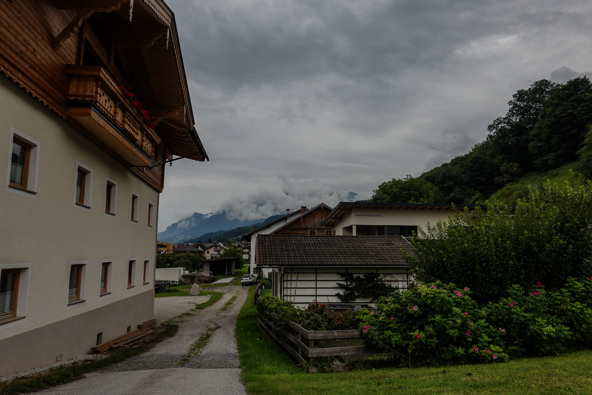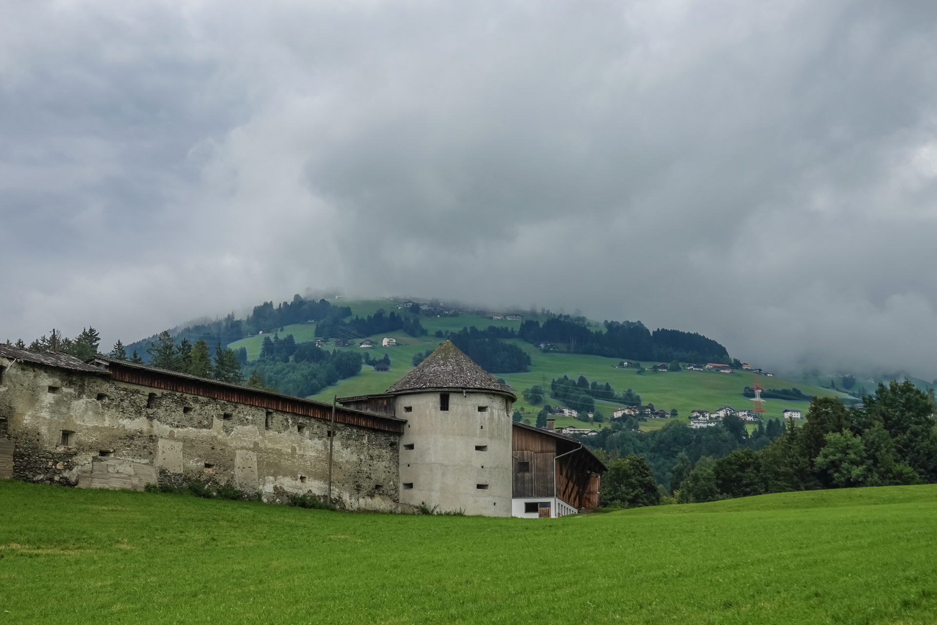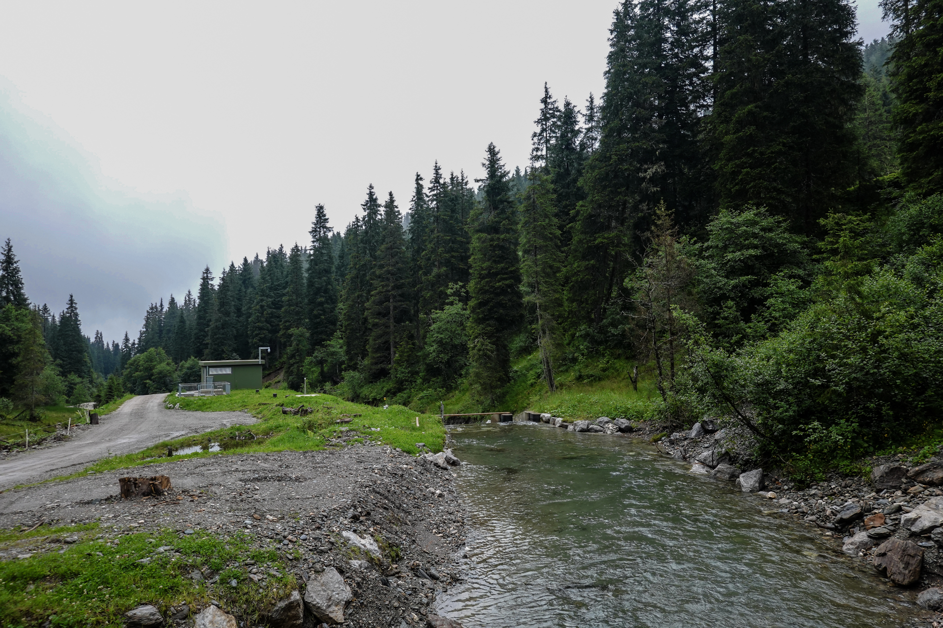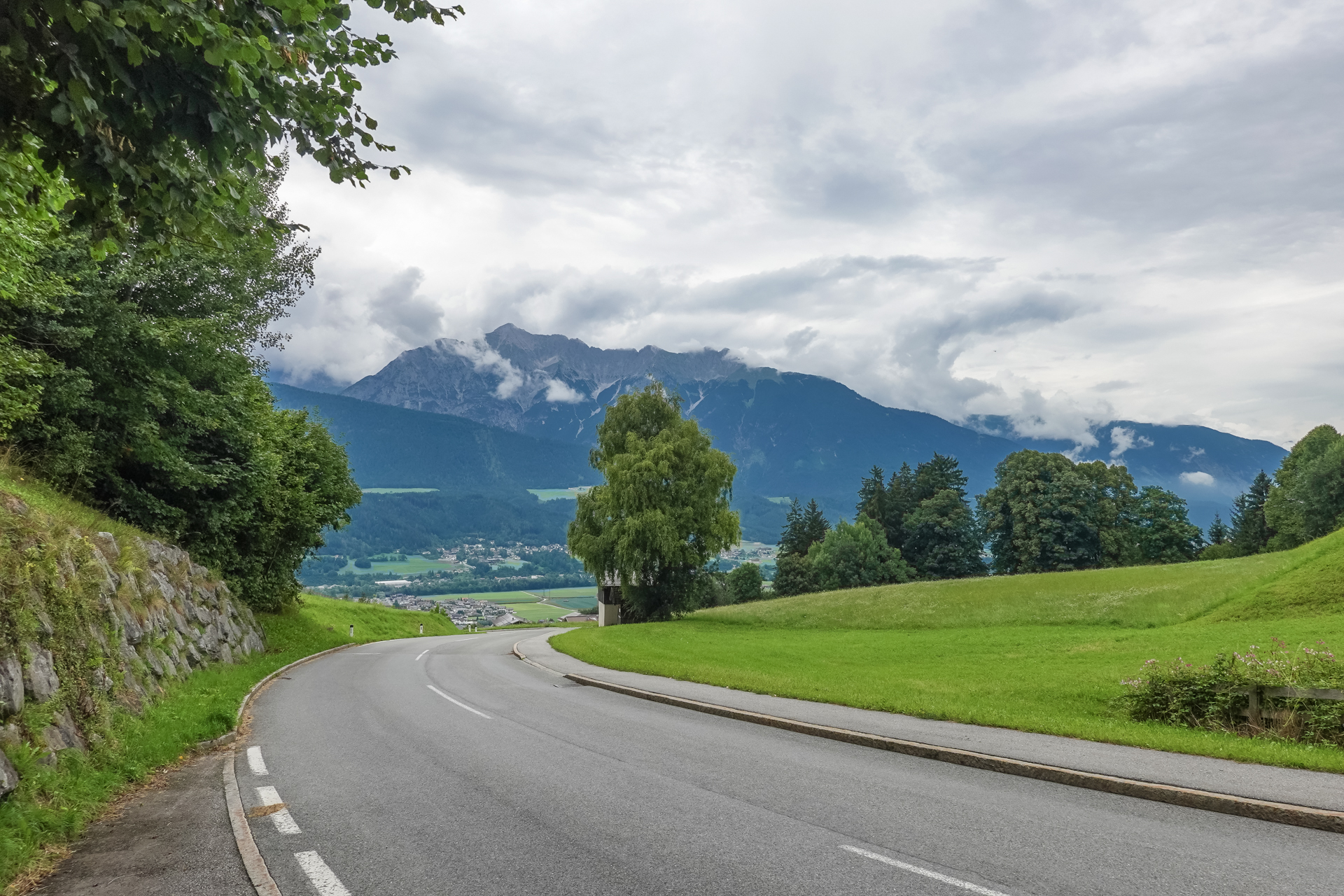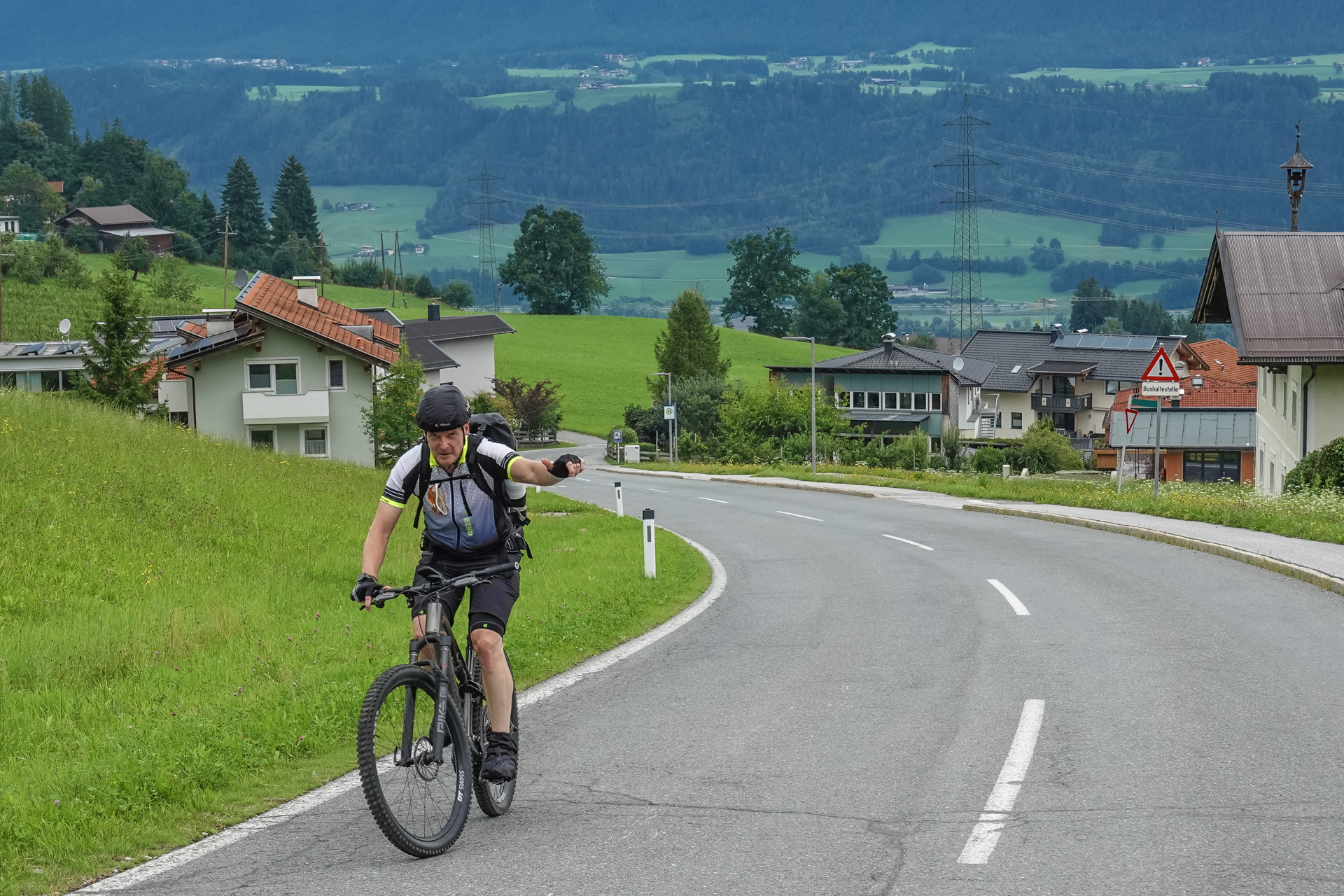 Nach der Durchfahrt durch Wattens beginnt der anstrengendere Teil der Etappe. Der Regen setzt erneut ein, und ab diesem Punkt führt der Weg kontinuierlich bergauf zur Weitenbergalm, unserem heutigen Ziel.