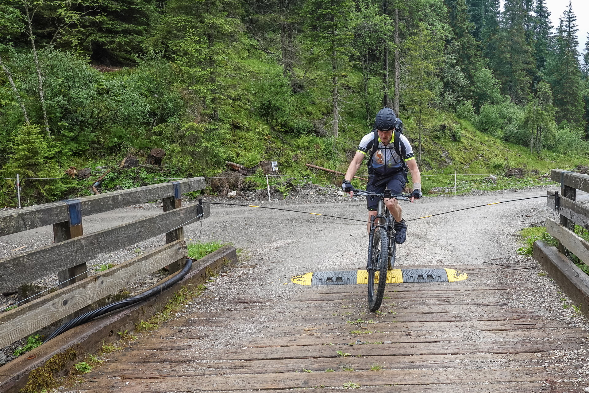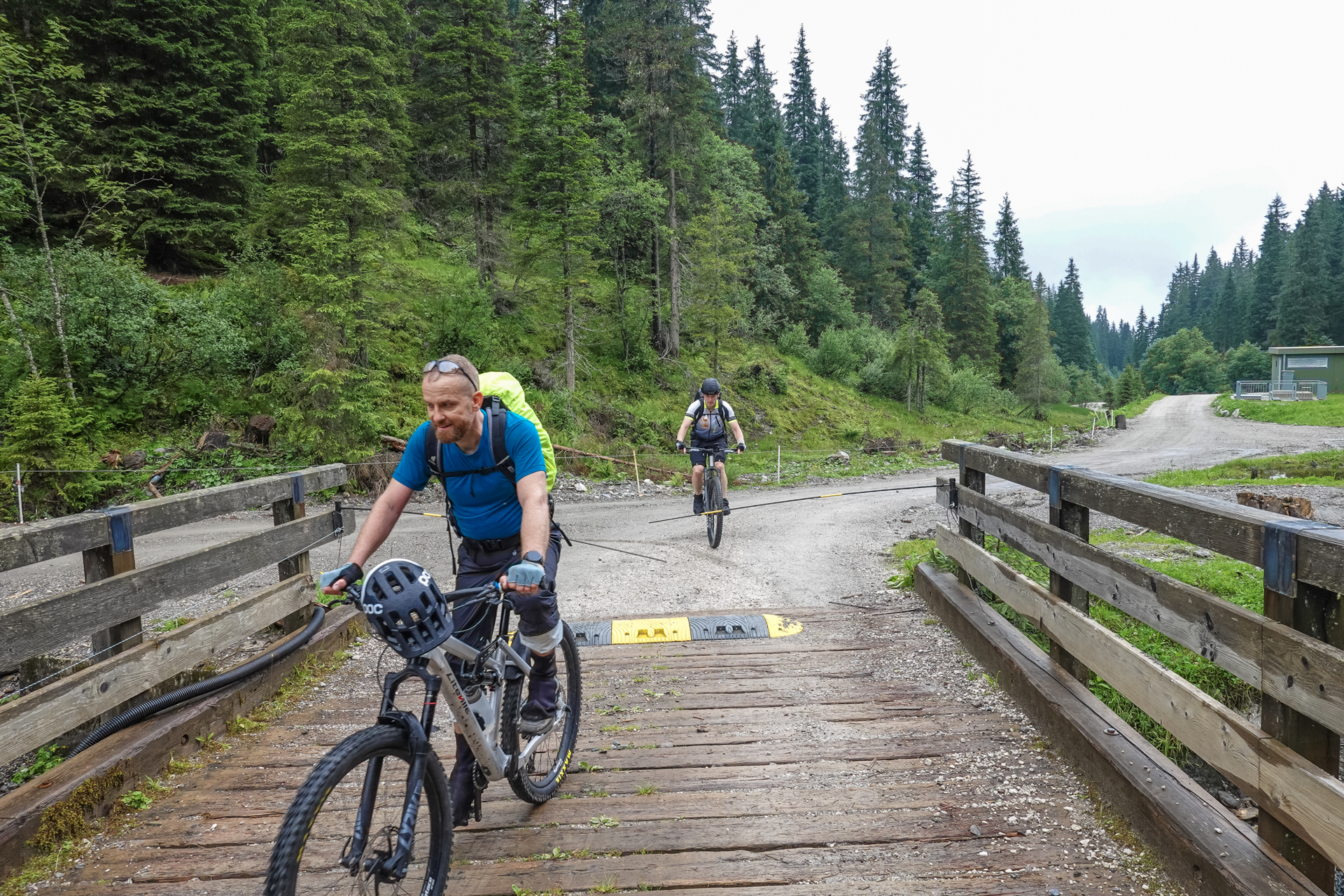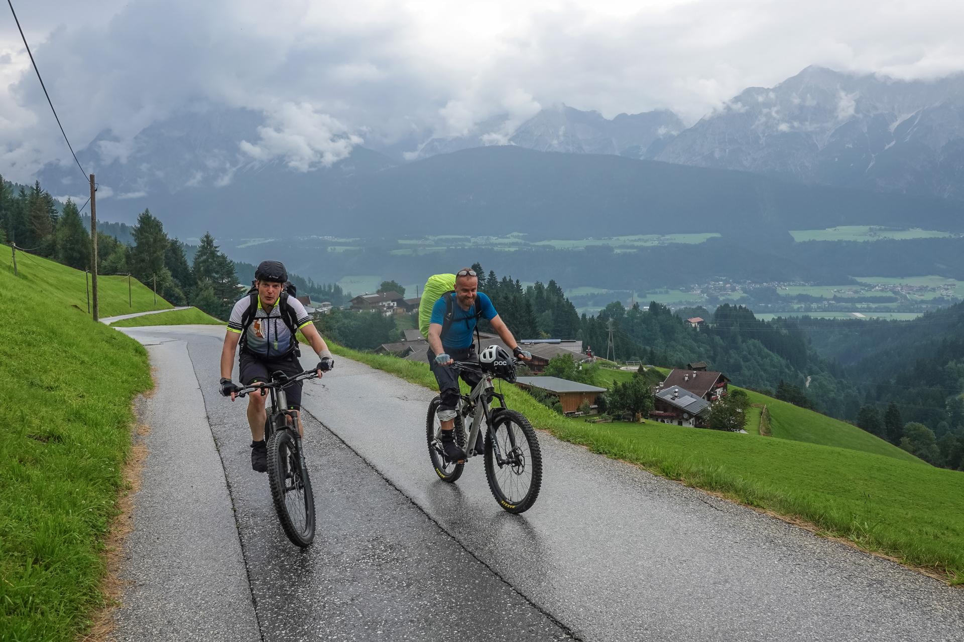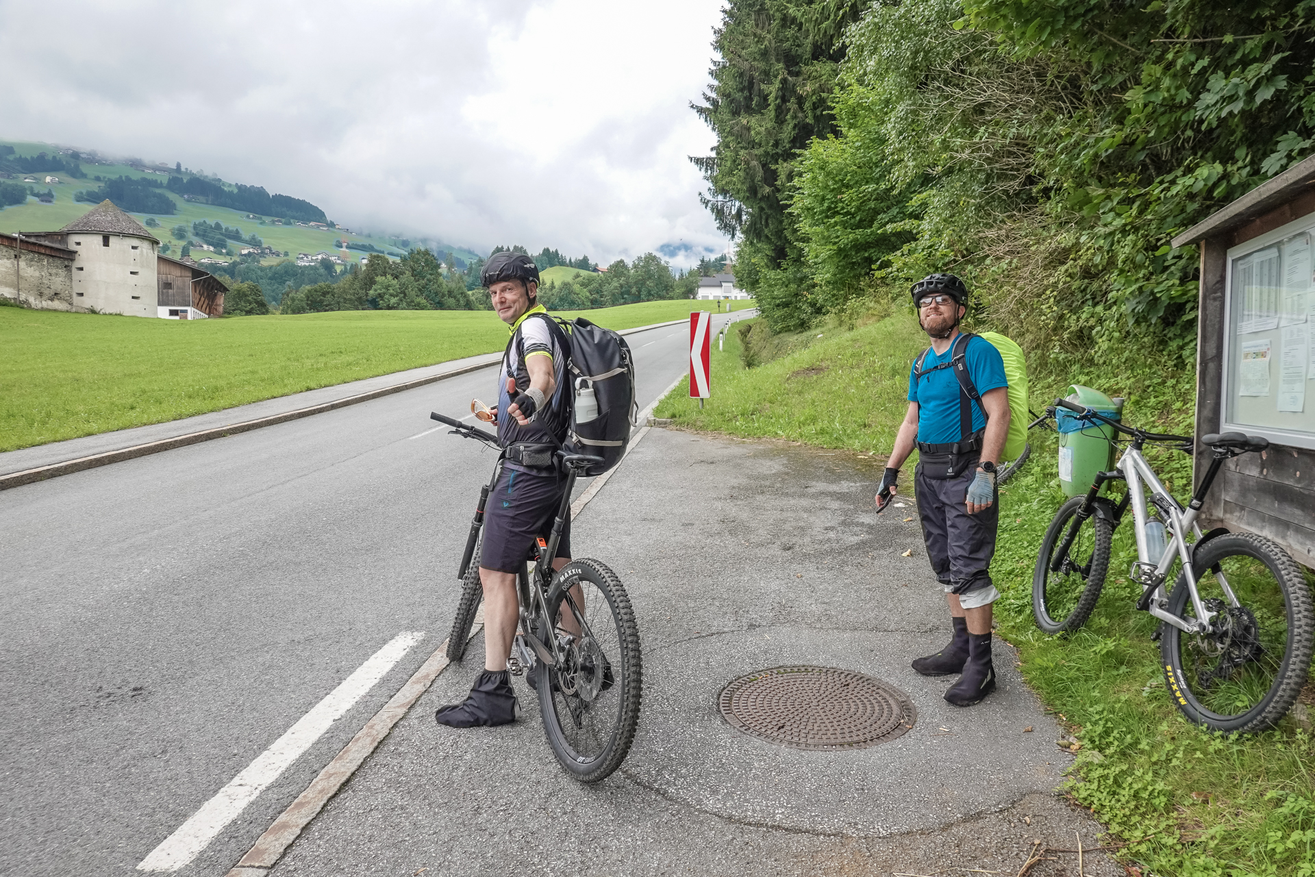 Unsere Körper müssen sich erst an die ungewohnte Belastung langer Anstiege gewöhnen – in unserer Heimat im Spessart sind über 300 Höhenmeter am Stück eher die Ausnahme. Dennoch kämpfen wir uns Meter für Meter nach oben. Wenn es zu steil wird, schieben wir die Räder. In den Regenpausen schöpfen wir neue Kraft. Ein Vorteil des schlechten Wetters: Die Wege gehören uns allein – keine anderen Biker, keine Wanderer.