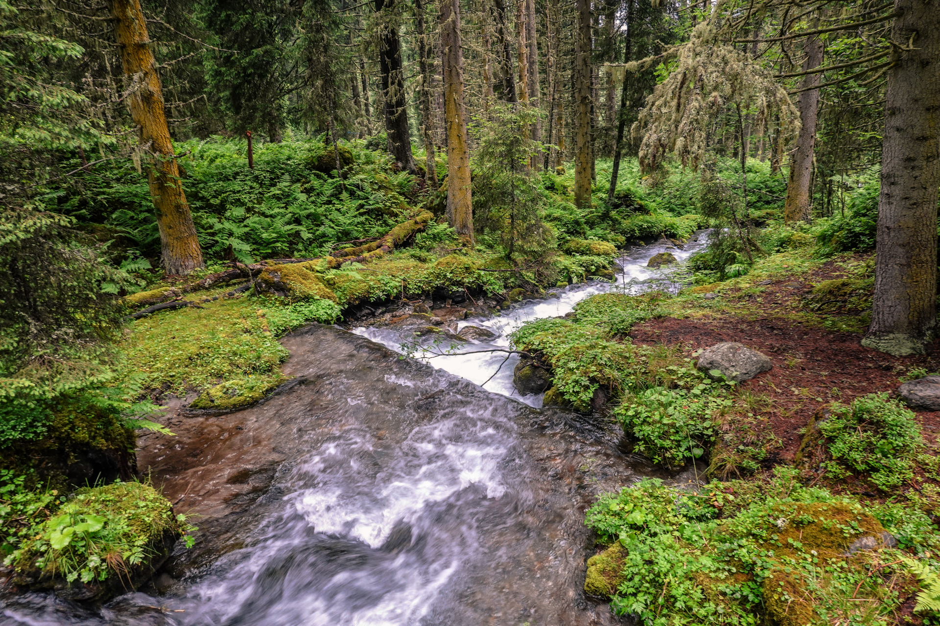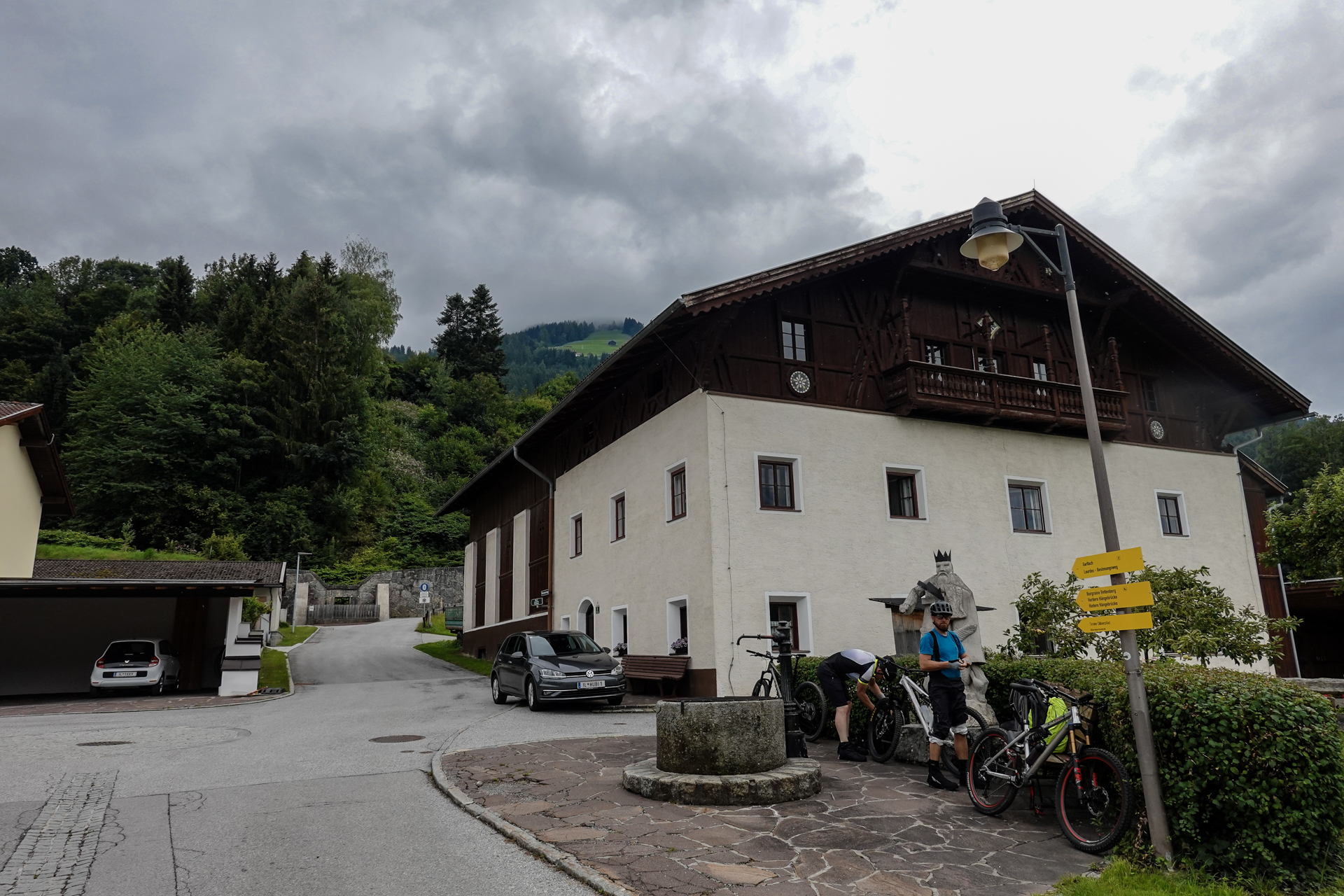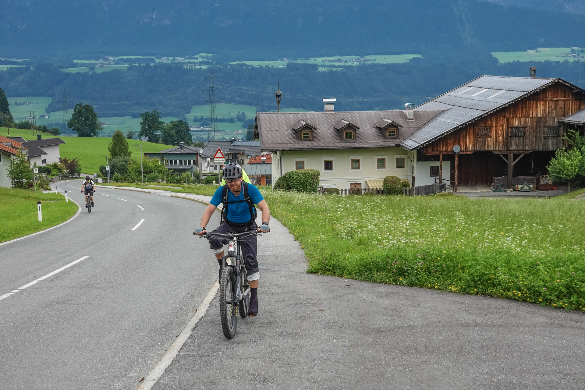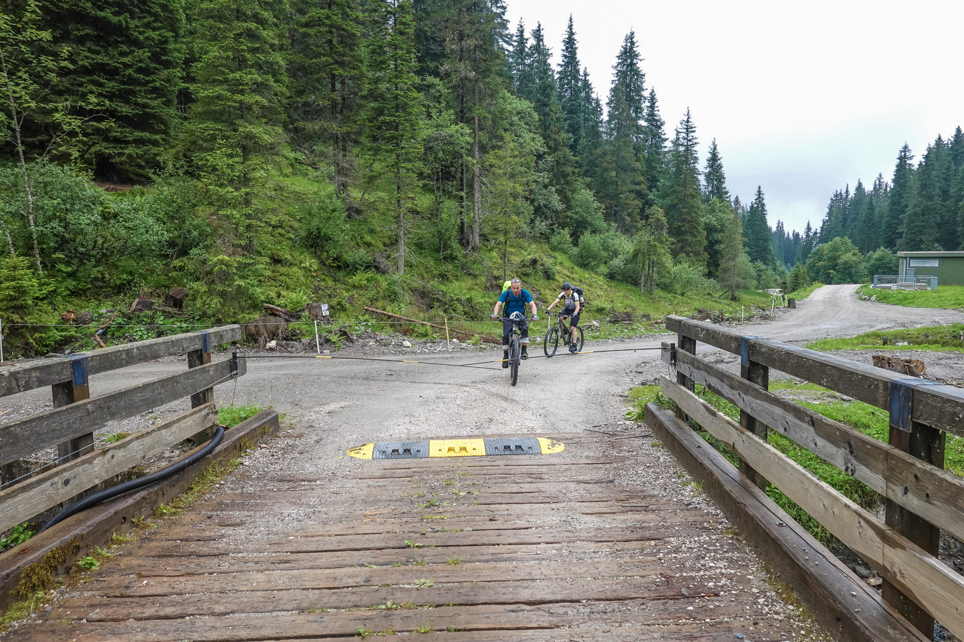 Unsere Körper müssen sich erst an die ungewohnte Belastung langer Anstiege gewöhnen – in unserer Heimat im Spessart sind über 300 Höhenmeter am Stück eher die Ausnahme. Dennoch kämpfen wir uns Meter für Meter nach oben. Wenn es zu steil wird, schieben wir die Räder. In den Regenpausen schöpfen wir neue Kraft. Ein Vorteil des schlechten Wetters: Die Wege gehören uns allein – keine anderen Biker, keine Wanderer.