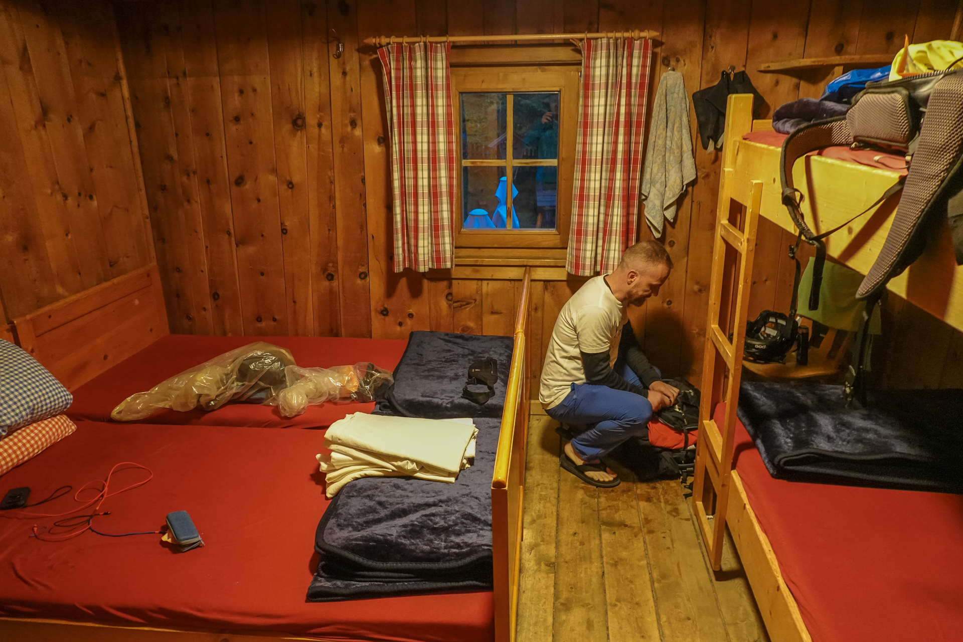 Gegen Abend erreichen wir schließlich die Weitenbergalm – wie sollte es anders sein – im Regen. Oben herrschen kühle 10 Grad bei hoher Luftfeuchtigkeit von etwa 85 %. Wir haben ein Vierbettzimmer gebucht, nutzen es jedoch zu dritt, da wie in der Übersicht beschrieben, Uwe kurzfristig ausgefallen ist. Nach dem Umziehen und einer kurzen heißen Dusche lassen wir den Tag im Gastraum bei einem warmen Abendessen ausklingen.