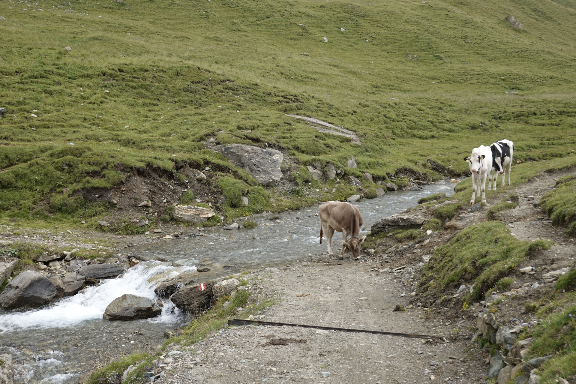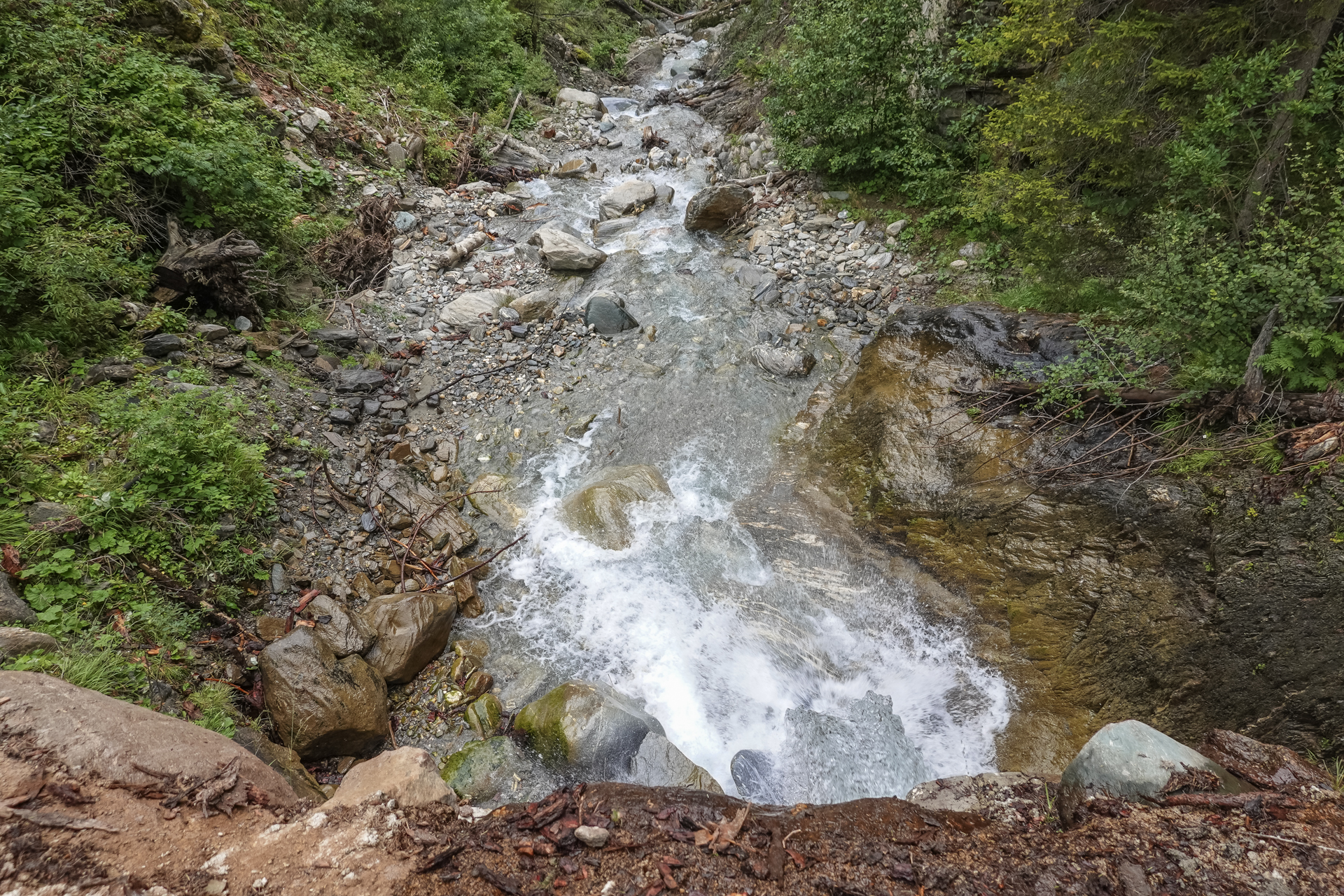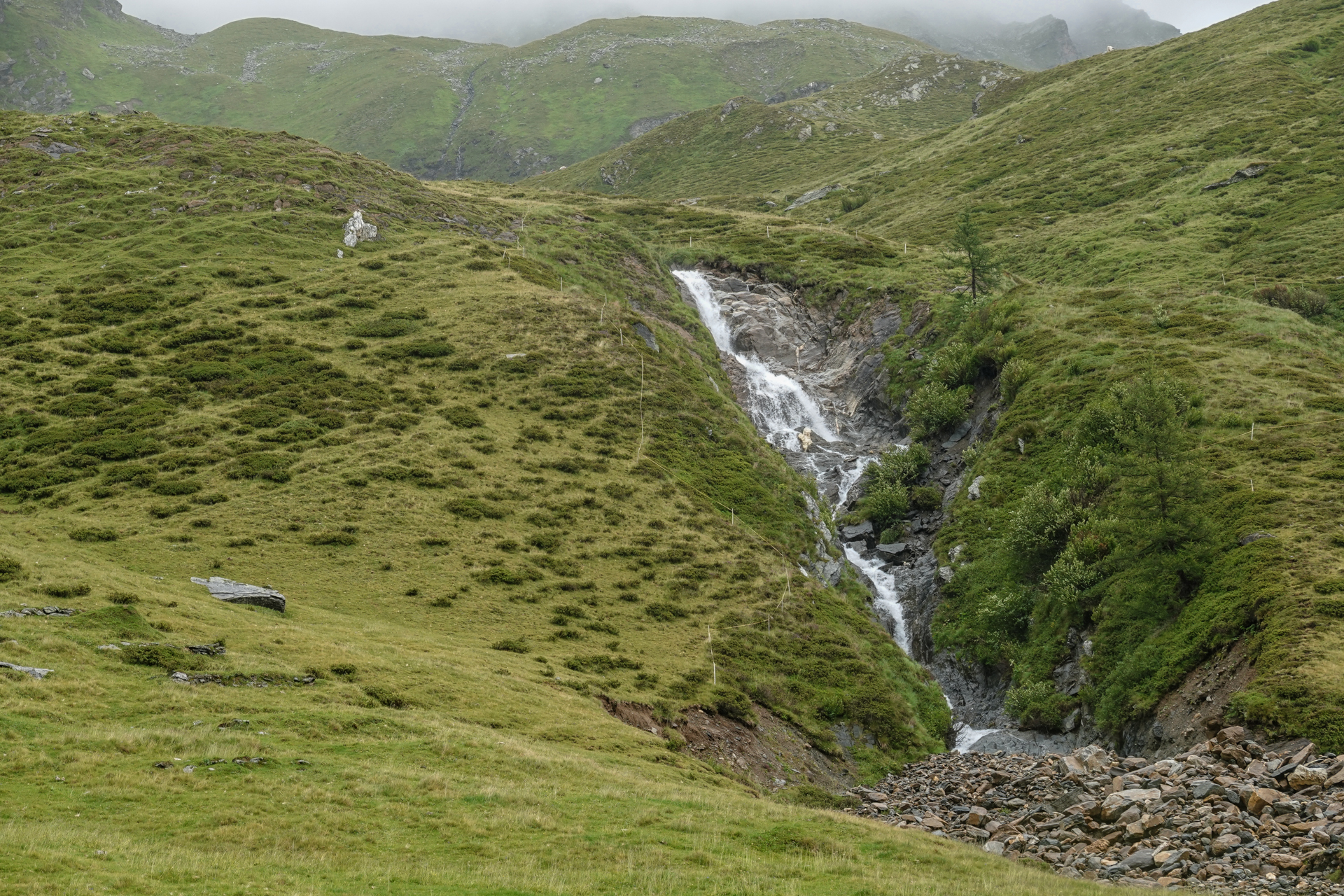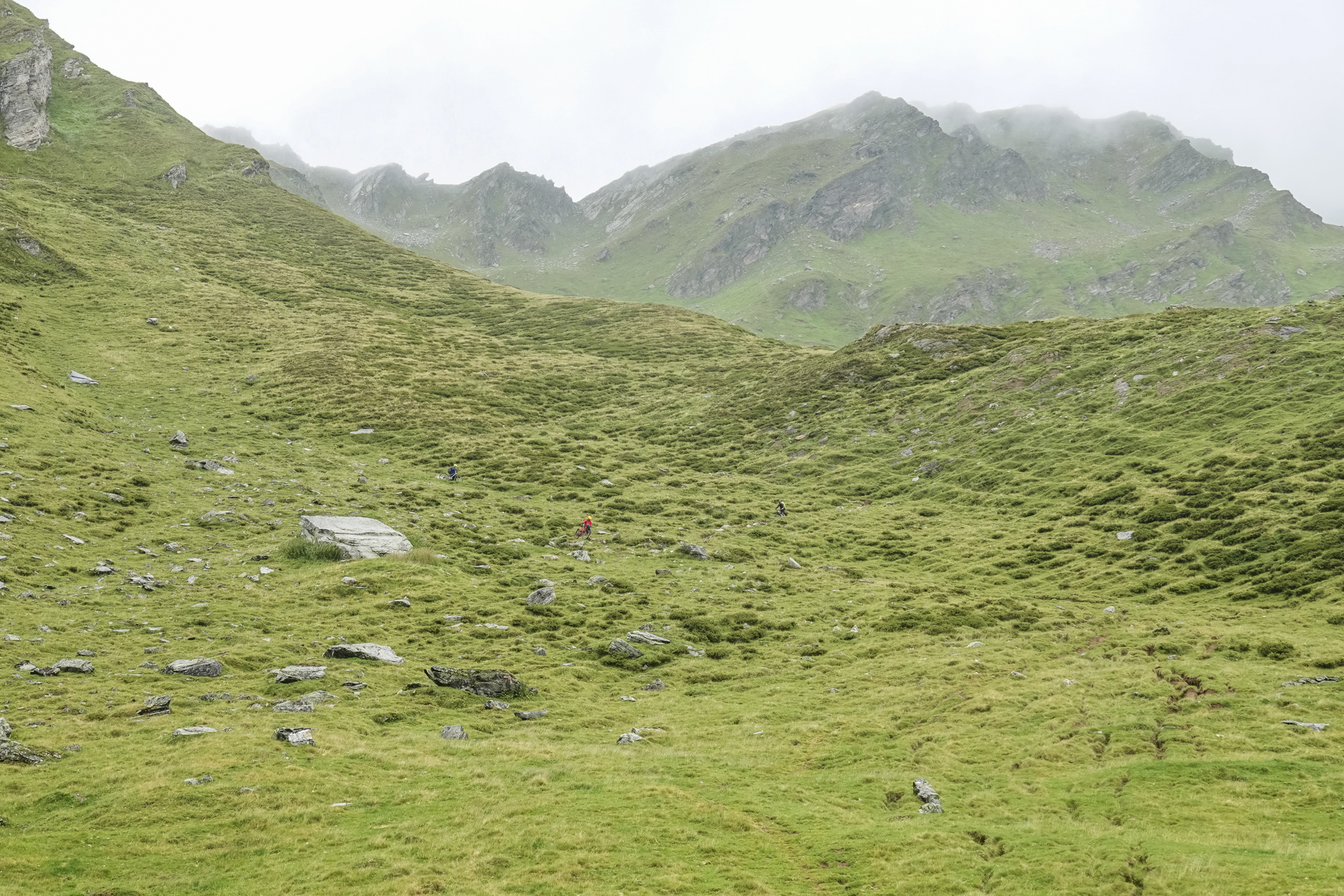 Ein Bach, der von oben herab ins Tal strömt, blockiert plötzlich unseren Weg. Wir müssen hindurch. Lars nimmt Anlauf, das Spritzwasser spritzt hoch, die Füße werden nass. Georg versucht es vorsichtiger, tritt beim Überqueren – und auch seine Füße sind nass. Ich nehme Schwung, hebe die Beine und komme trocken rüber. Zugegeben: Ich habe diesen Bach schon zweimal auf vorherigen Touren überquert und wusste, wie man das Problem umgeht.